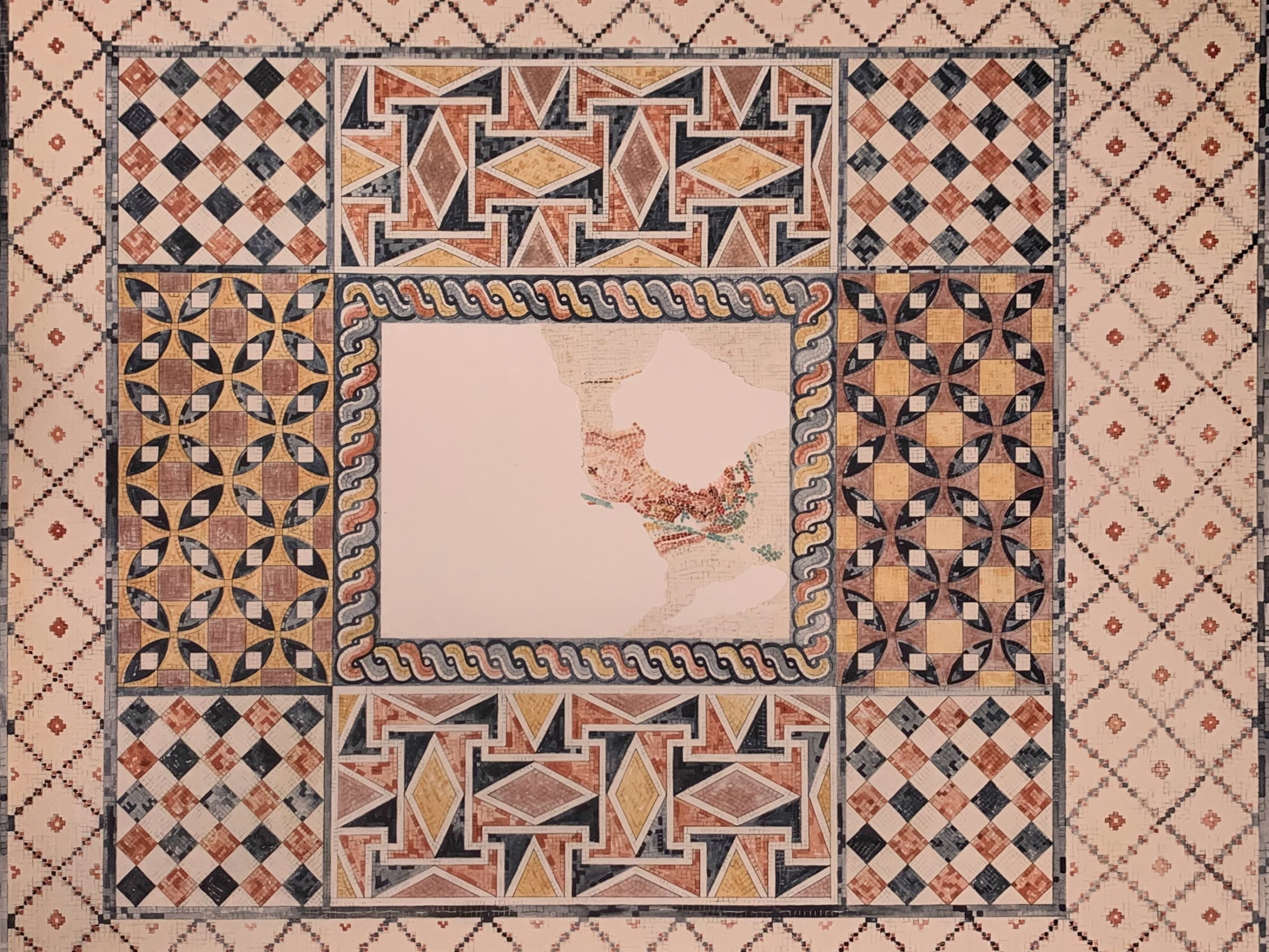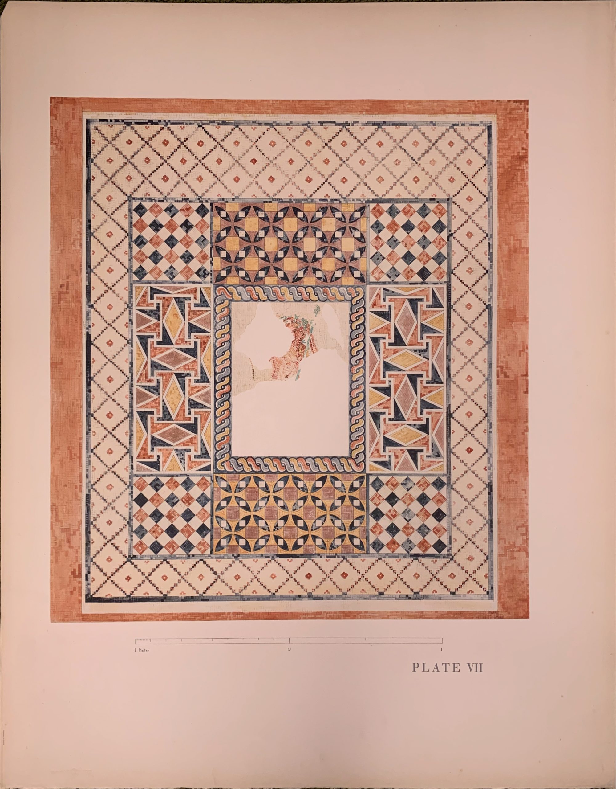Meanwhile, Jane Norton Grew Morgan visited Corinth in 1924 and was fascinated by it, so she financed the excavation of the villa which the Shears had discovered.  Later, Jane’s husband, J. Pierpont Morgan II, financed the production of a folio to document these magnificent discoveries, Corinth: Results of Excavations Conducted by the American School of Classical Studies at Athens, Volume V:  The Roman Villa.  This folio, written by Dr. Shear, contained a detailed discussion of the excavation and site as well as 13 plates, most made from watercolors which Nora Shear had painted, showing some of the excavated buildings.  The plates in the folio are magnificent in size and content, the size dictated by the participants’ desire to produce the head of Dionysus as a frontispiece in exact facsimile of the size of the mosaic itself.