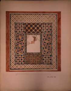 Meanwhile, Jane Norton Grew Morgan visited Corinth in 1924 and was fascinated by it, so she financed the excavation of the villa which the Shears had discovered. Later, Jane’s husband, J. Pierpont Morgan II, financed the production of a folio to document these magnificent discoveries, Corinth: Results of Excavations Conducted by the American School of Classical Studies at Athens, Volume V: The Roman Villa. This folio, written by Dr. Shear, contained a detailed discussion of the excavation and site as well as 13 plates, most made from watercolors which Nora Shear had painted, showing some of the excavated buildings. The plates in the folio are magnificent in size and content, the size dictated by the participants’ desire to produce the head of Dionysus as a frontispiece in exact facsimile of the size of the mosaic itself.
