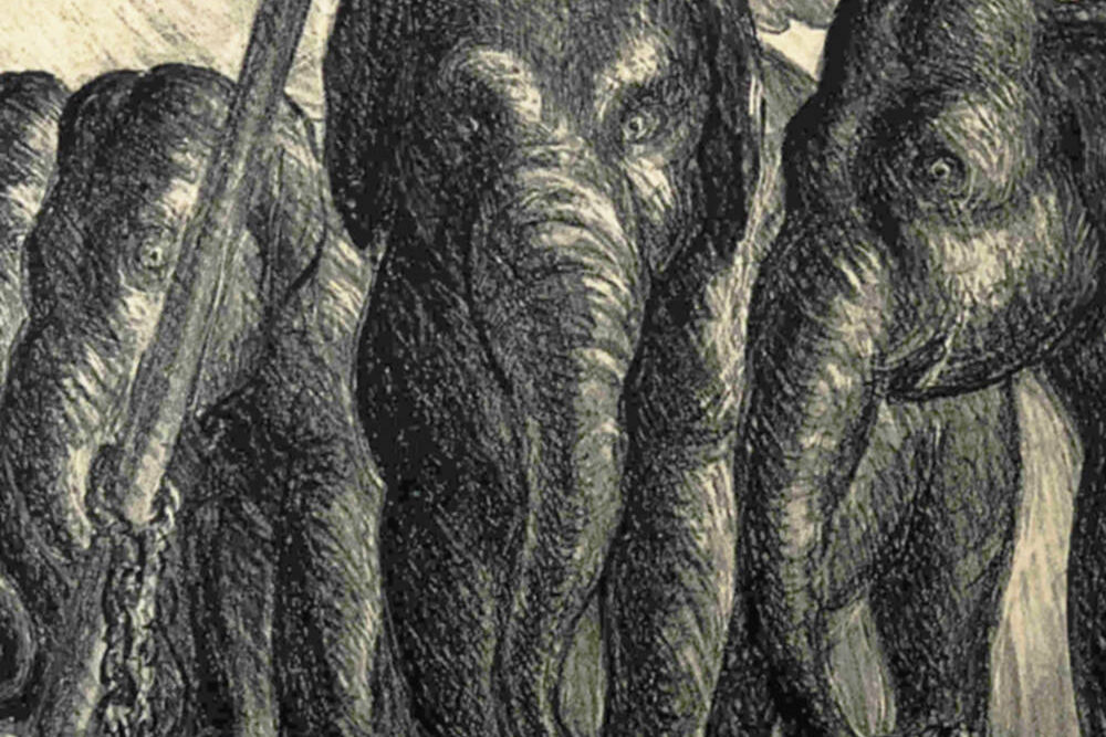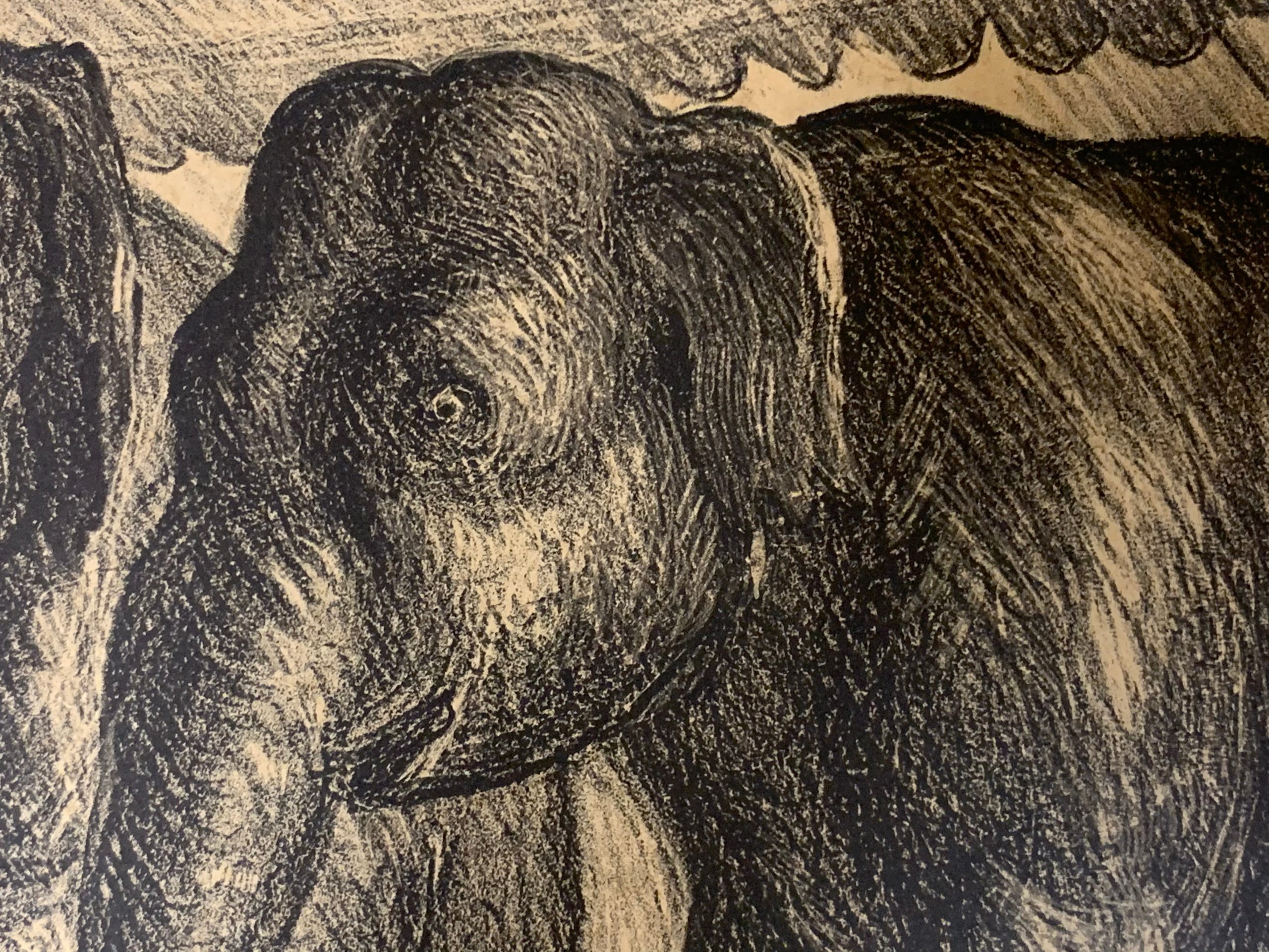 Circus Elephants presents 12 elephants standing in a line under a tent, eating hay. Their massive forms diminish as they recede diagonally into the background, interrupted only by two tent stays that lean toward them and divide the space. The various positions of the elephants’ trunks give the scene a sense of gentle undulation. The artist captured the figures and expressions of the two elephants on the right very effectively, with the result that they have a greater sense of individual personality than their companions and seem to converse with one another. The small head of the zebra in the left foreground accentuates the elephants’ enormous bulk.