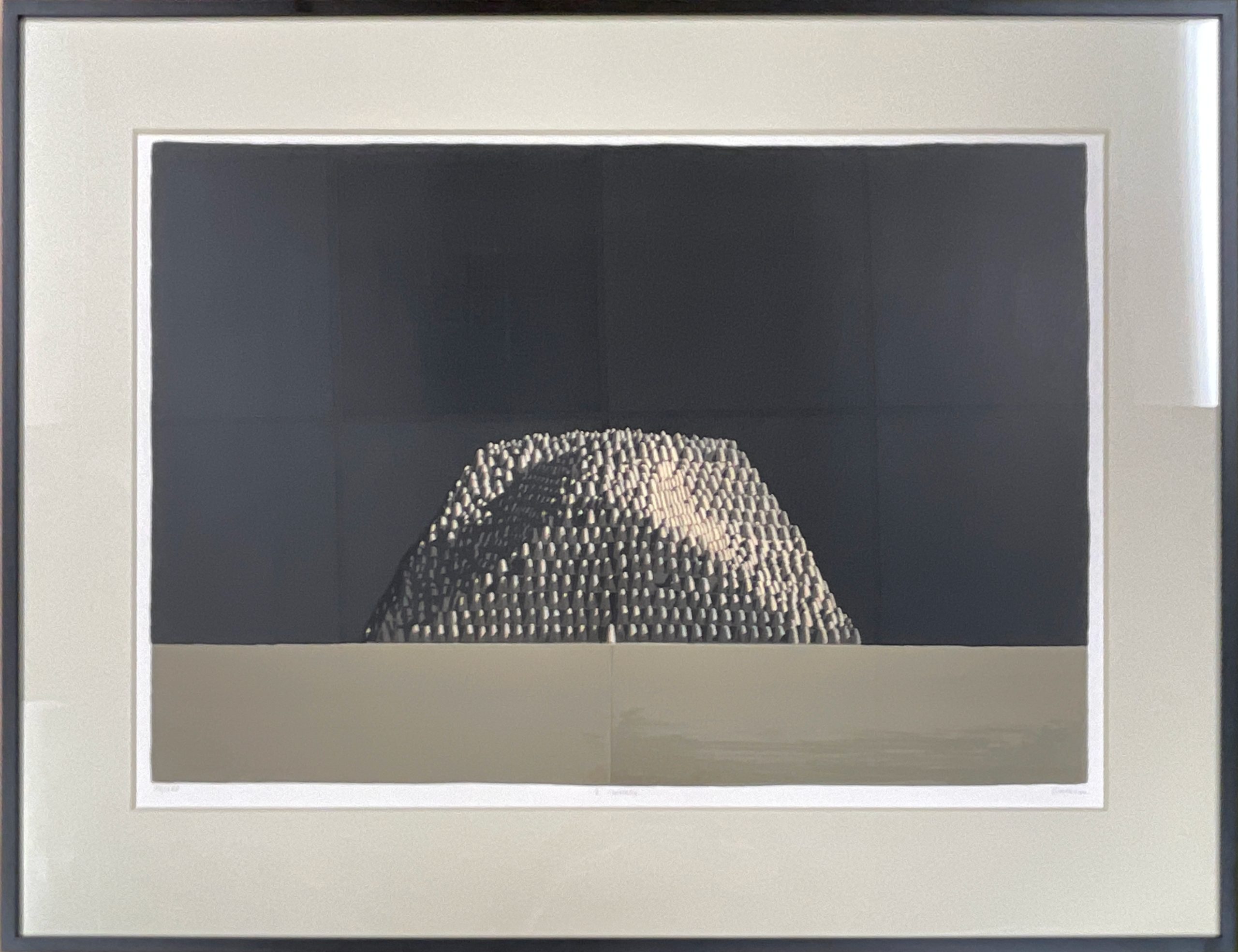 Custom matted with an 8-ply mat in a painted aluminum frame with welded corners of the sort specially designed by artist and framemaker Richard Kulicke for a Metropolitan Museum traveling exhibition, behind 99% UV-blocking Plexiglass using strictly conservation-grade materials.