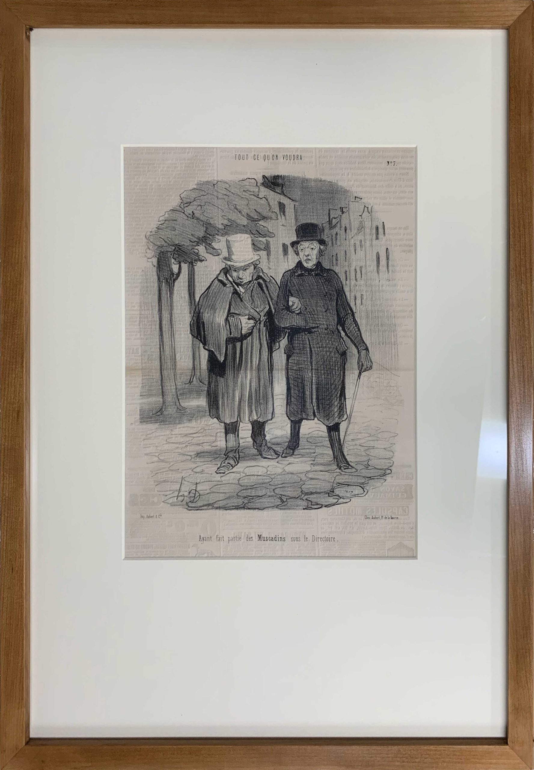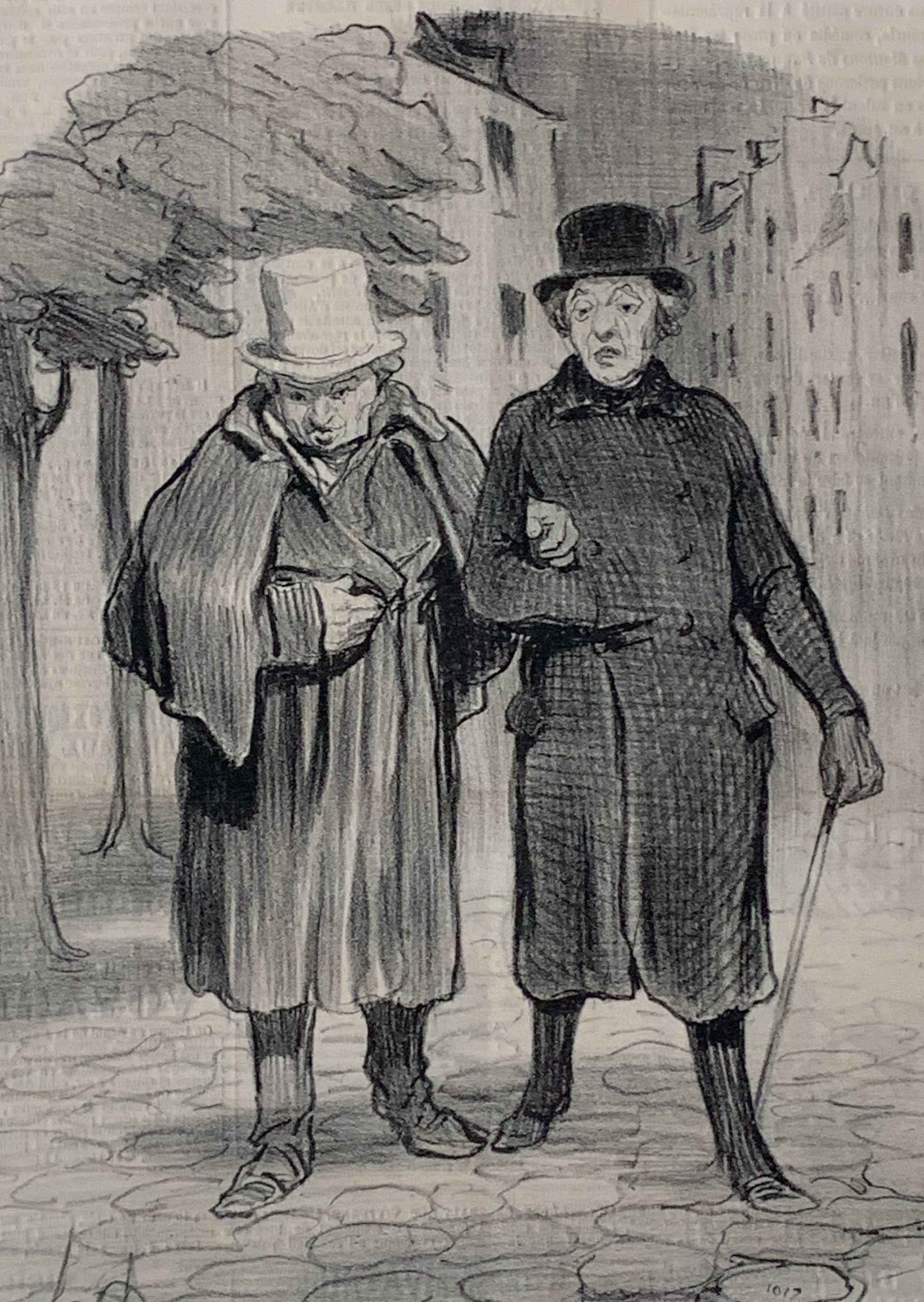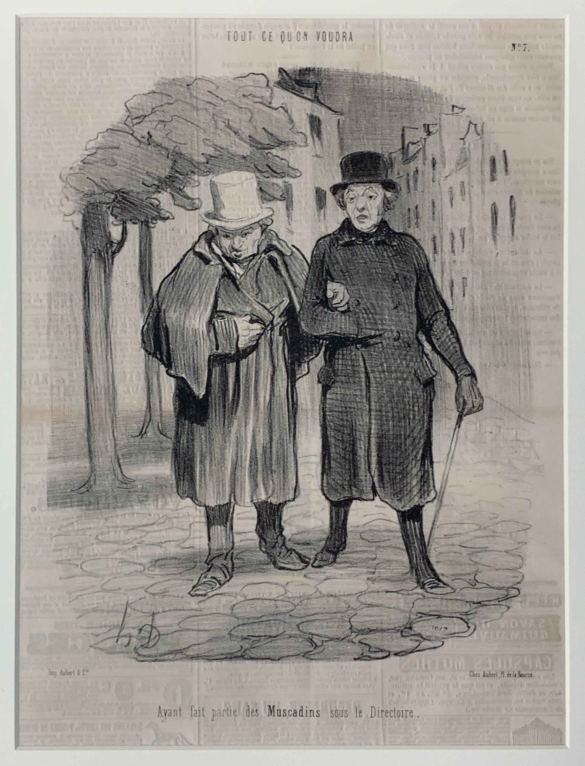 This work by Honoré-Victorin Daumier, titled Ayant Fait Partie des Muscadins sous le Directoire, is from Daumier’s series Tout Ce Qu’on Voudra, or “Anything You Want”. The title is somewhat difficult to translate because of its use of a colloquialisms, but it might be translated as “Former Dandies from the Time of the Directorate”.