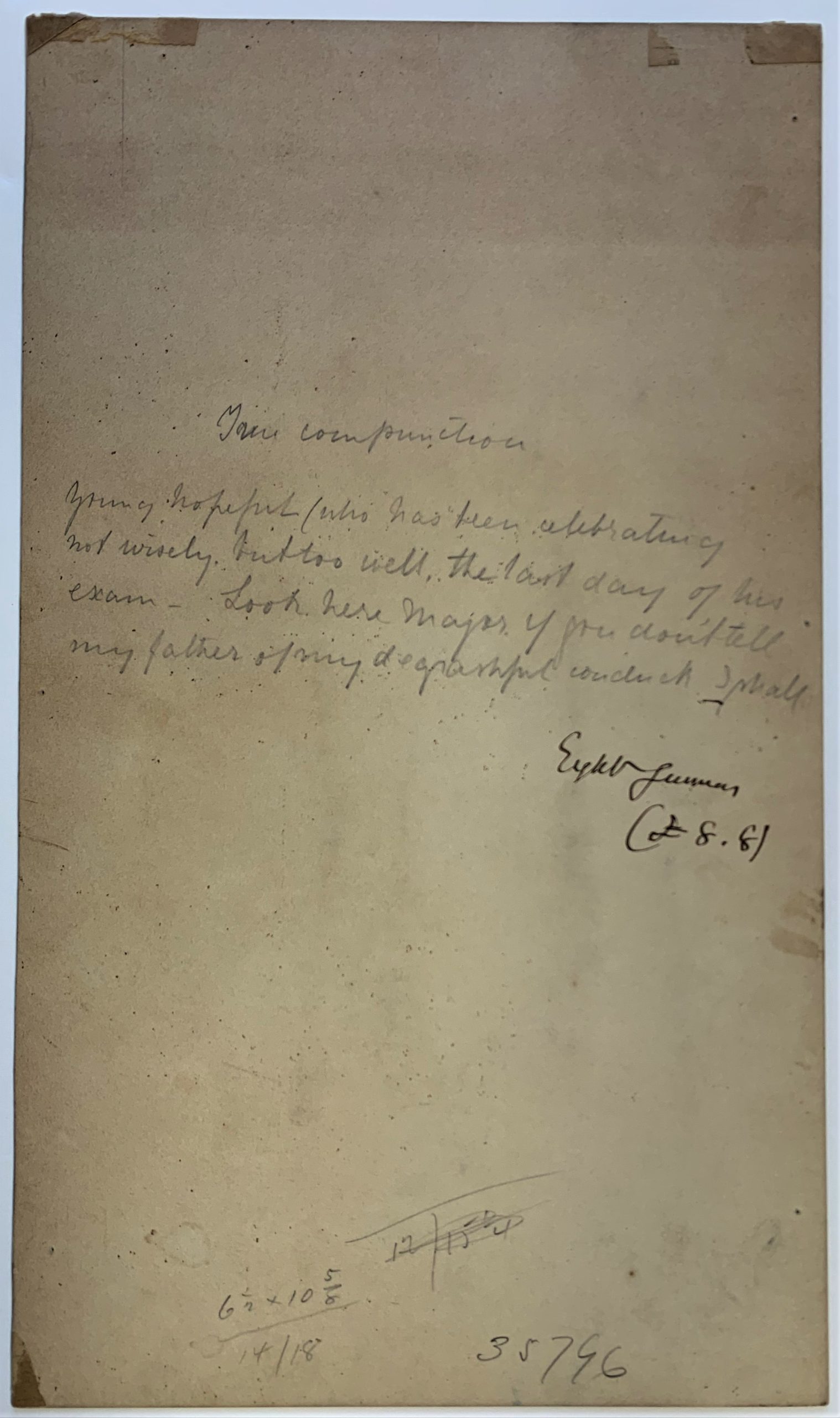 This etching, entitled Contrition, is a completely tongue-in-cheek confession of contrition, in which a young man righteously declaims his intent to confess to his father his excessive celebration of the last day of exams. Hand-written in pencil by the artist en recto: