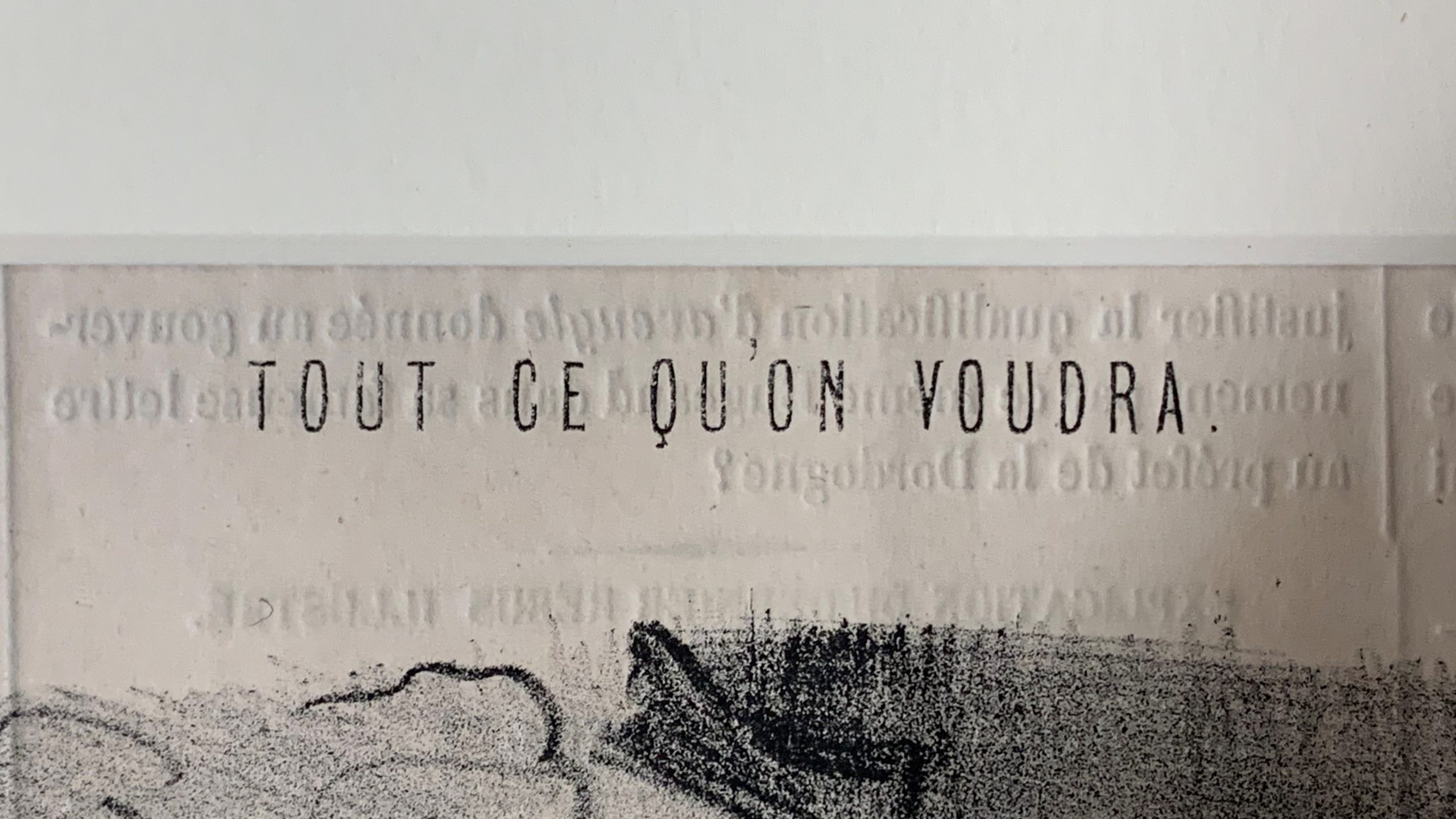 The title of this work is difficult to translate because of its use of a colloquialisms, but it might be translated as “Former Dandies from the Time of the Directorate”. Similar to Daumier’s “Les bons bourgeois” series, the prints of Tout Ce Qu’on Voudra offer beautiful observations like this one: An elderly couple remembering their youth, remembering when they were part of the young rebels.