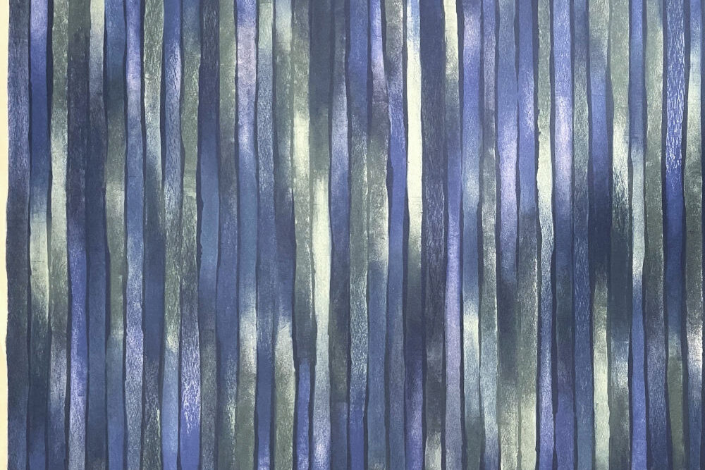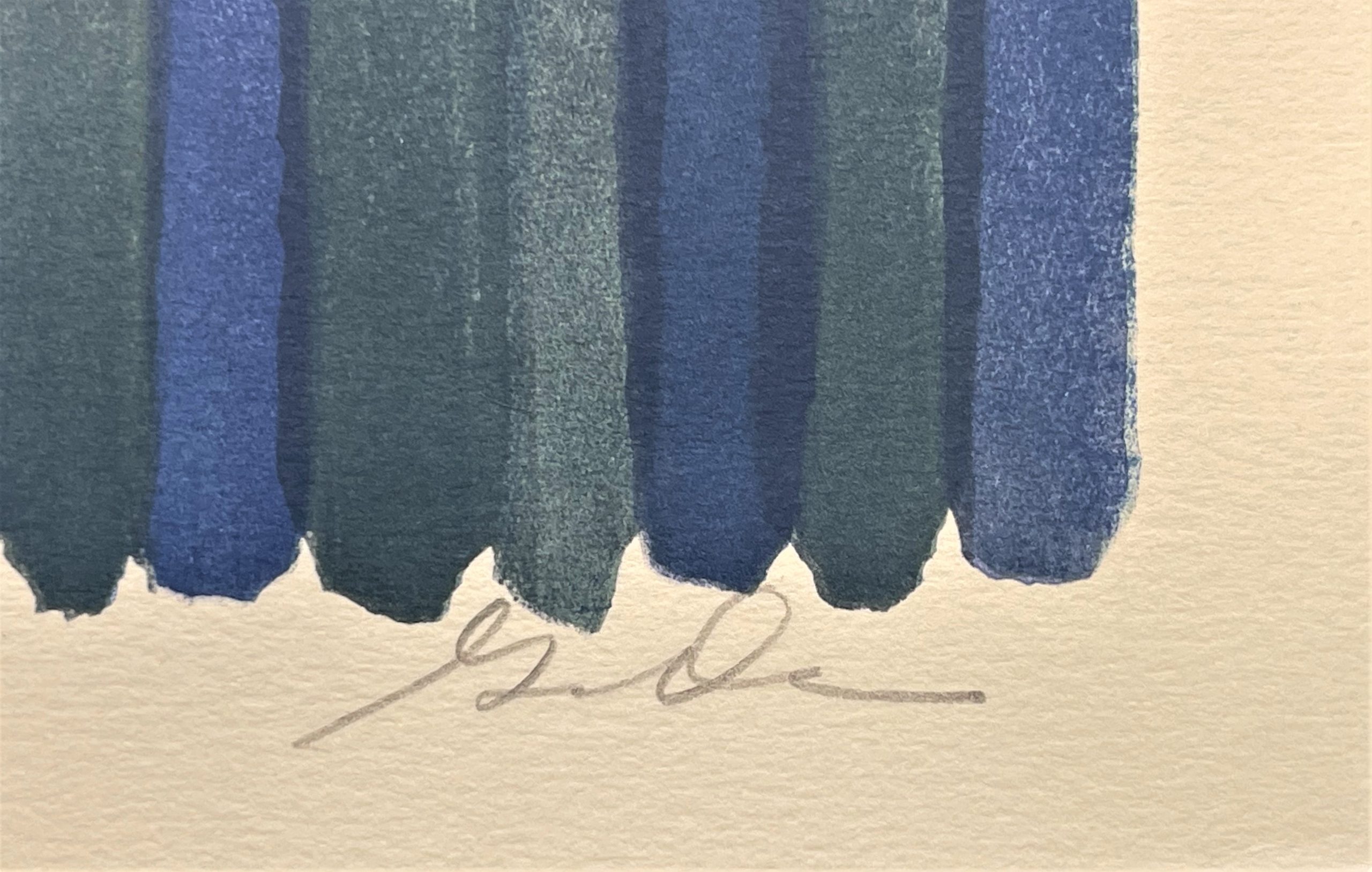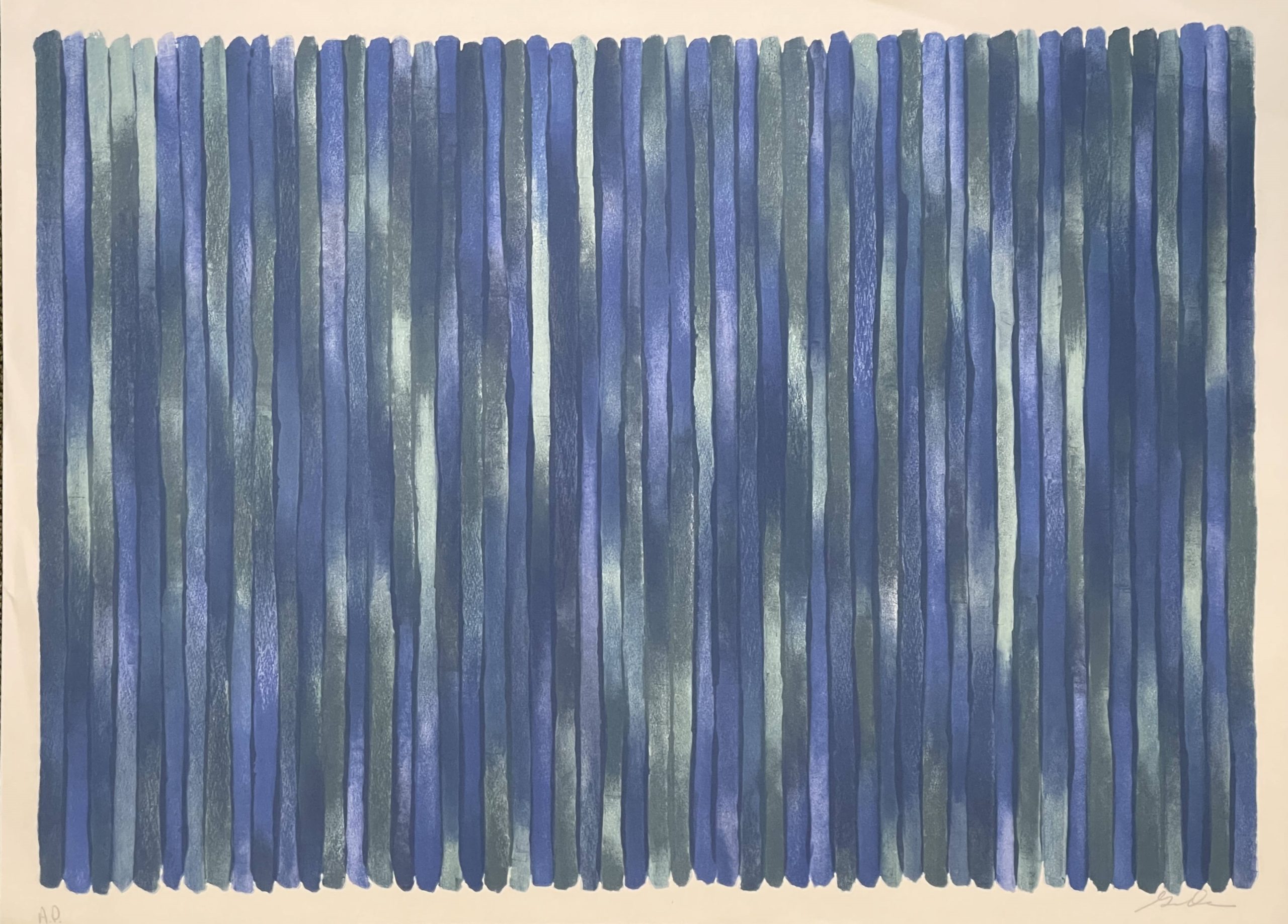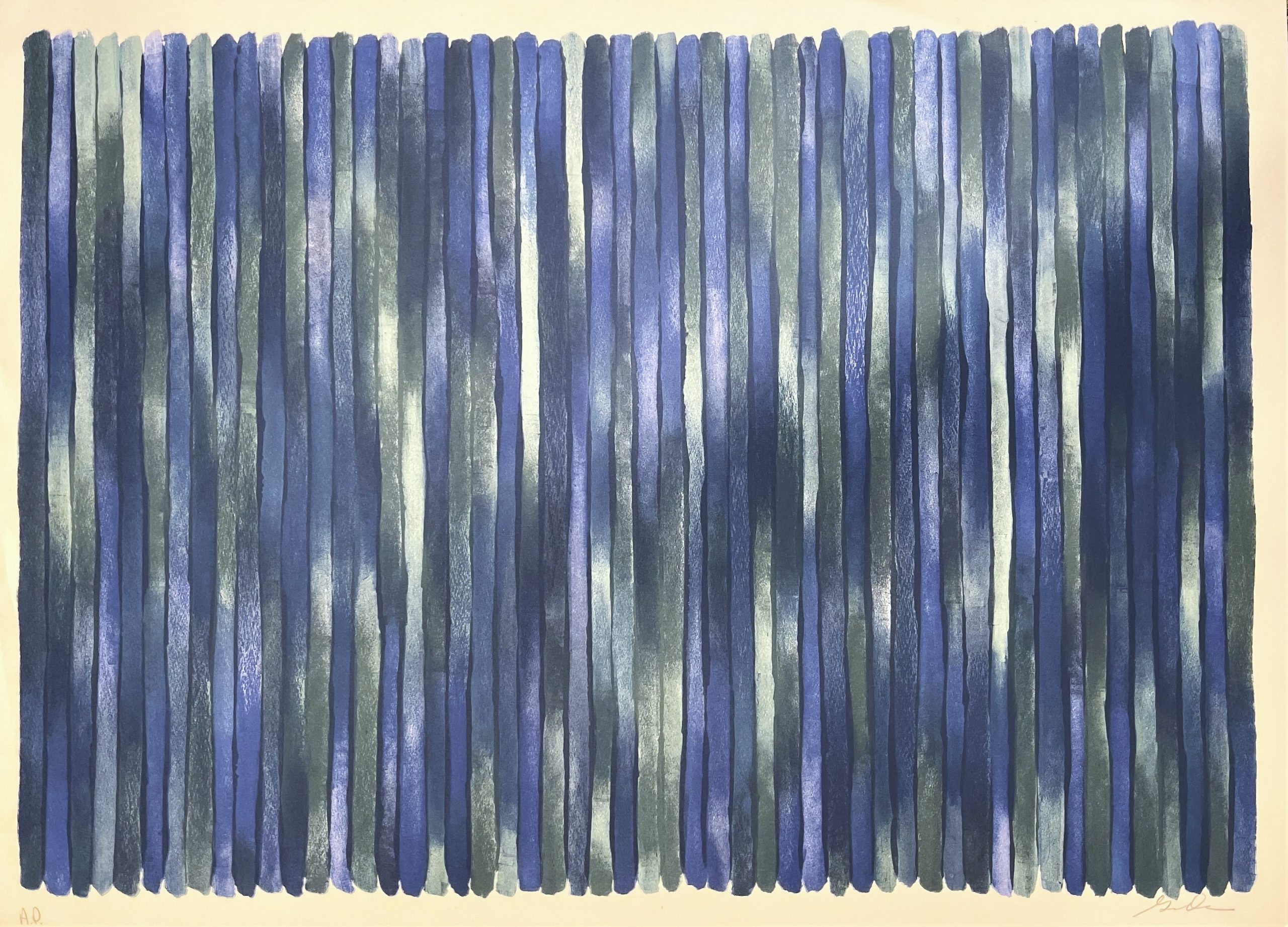 This blue-green work shows a variation on Gene Davis’ famous vertical lines. It is nearly identical in composition to Davis’ “Banjo” and “Ferris Wheel”, but with a calmer and cooler palette.