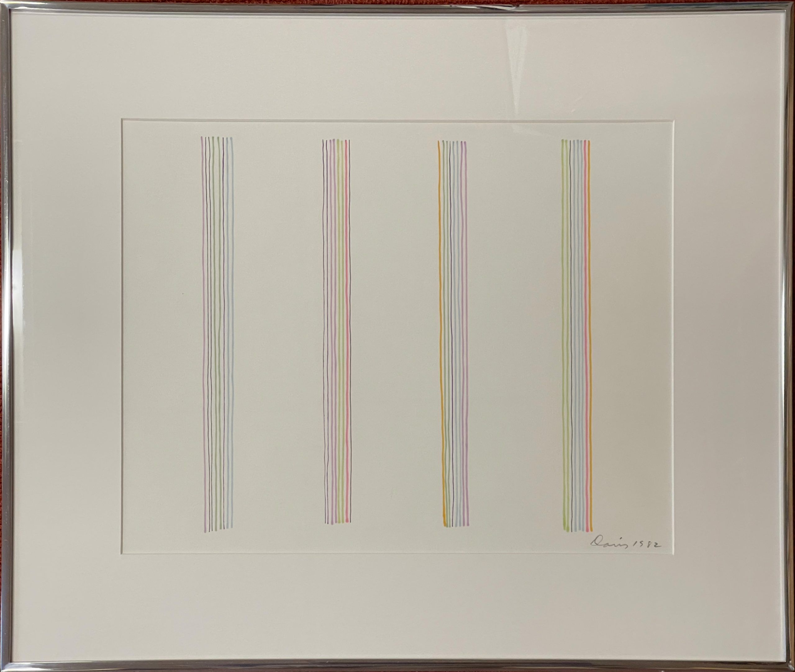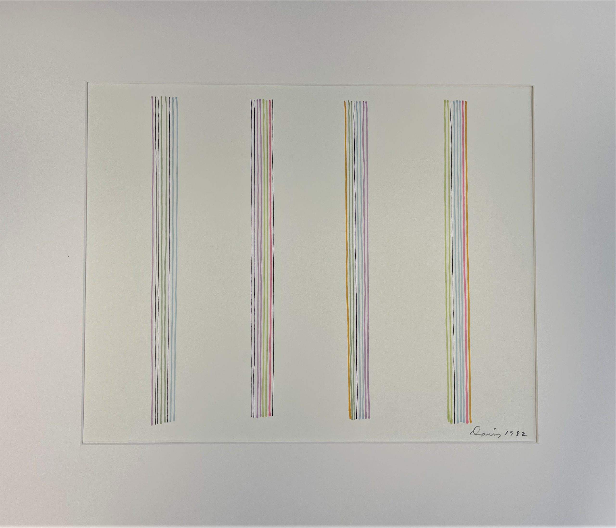 Art historians and color theorists have often discussed that Davis’ stripe works were not based on conscious use of color theory; Davis often compared himself to a jazz musician who plays by ear, describing his approach to painting as ”playing by eye.” His goal in his work was to make complex schemes that lend themselves to sustained periods of viewing. Davis suggested to his viewer, “instead of simply glancing at the work, select a specific color—and take the time to see how it operates across the painting.—Enter the painting through the door of a single color, and then you can understand what my painting is all about.”