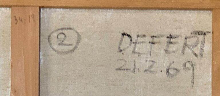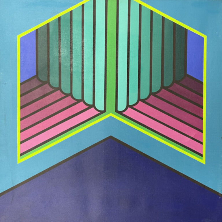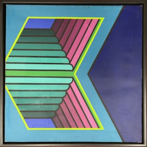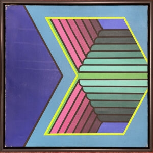 Maxime Defert was a geometric painter, exploring shapes and angles, but also a colorist of formidable ability. This diptych is comprised of two paintings, each 24 inches square (28 inches square in the frame), which can be hung both upright or side-to-side “pointing” at each other.