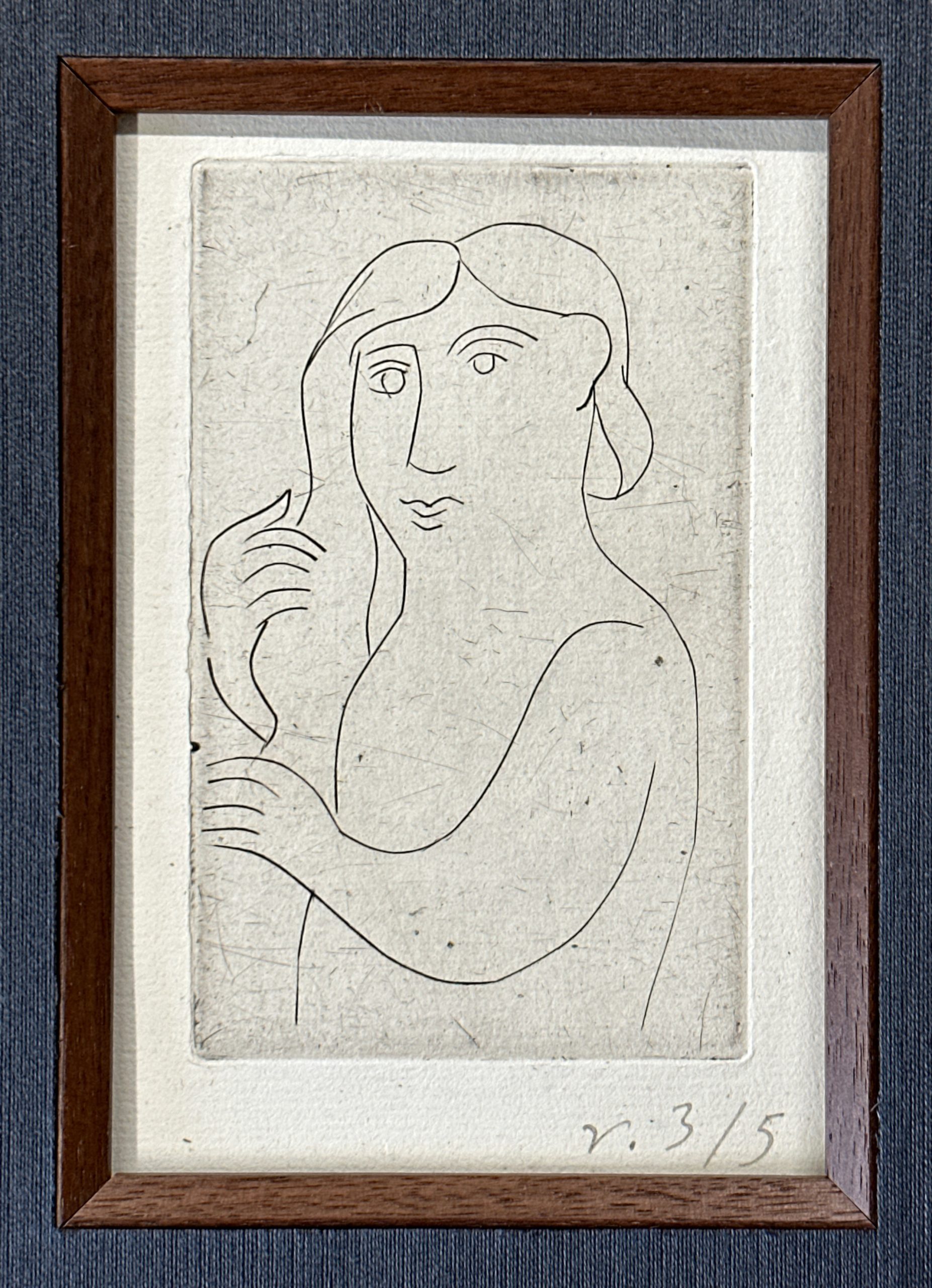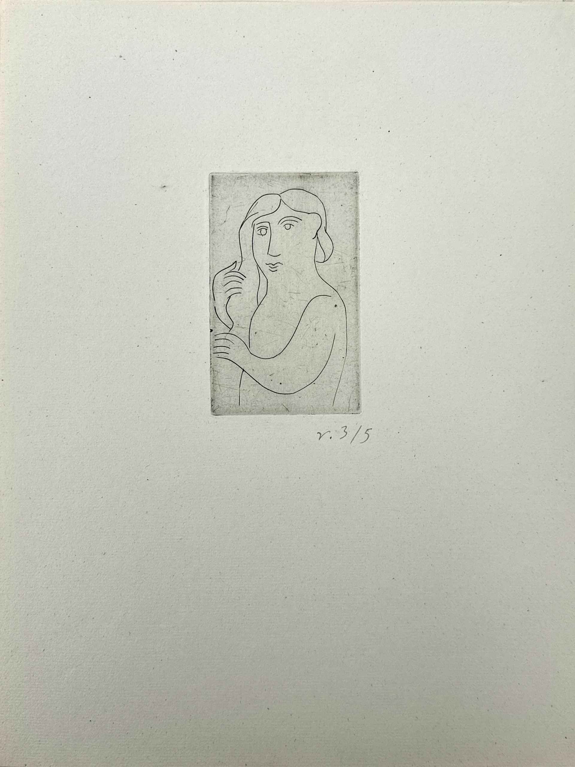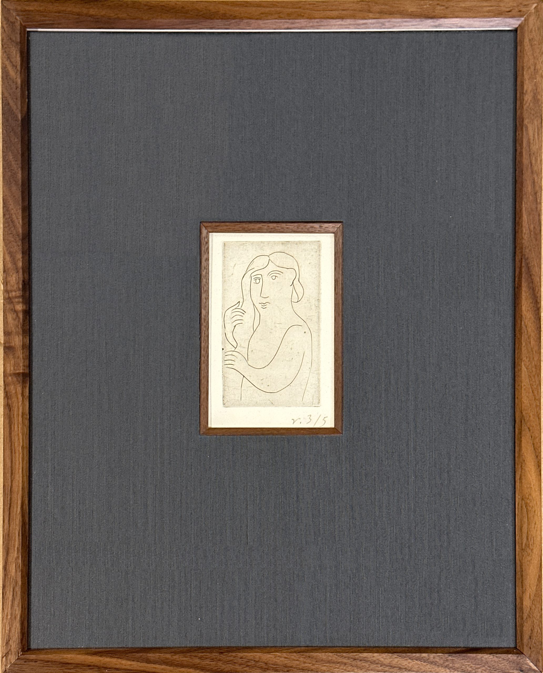 This gorgeous print by André Derain is one of only five printed on Old Vergé paper (aside from the main edition of 50 copies printed on velin d’Arches and copies on Japan). From a suite of seven engravings on copper plate “printed at the expense of an amateur”. When published in 1948, the suite on Arches was sold for Francs 250 and the suites on Japon were sold for Franc 375. Custom framed using strictly conservation grade materials behind 99% UV-blocking art glass. Accompanied by the publisher’s paper wrapper.