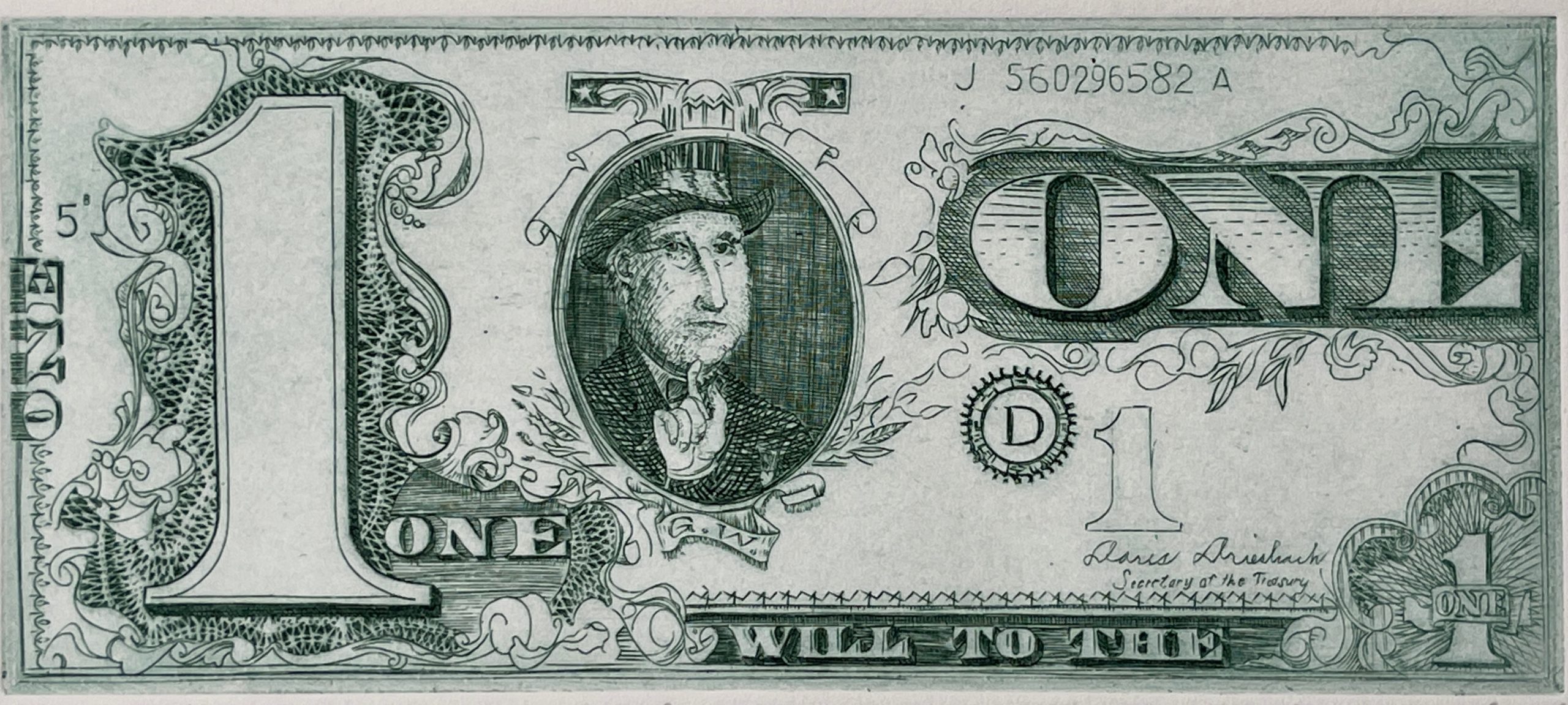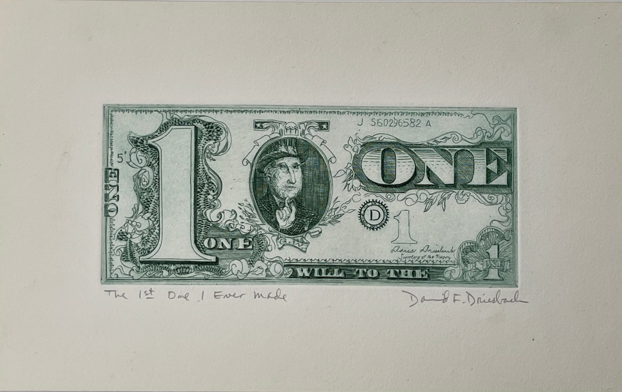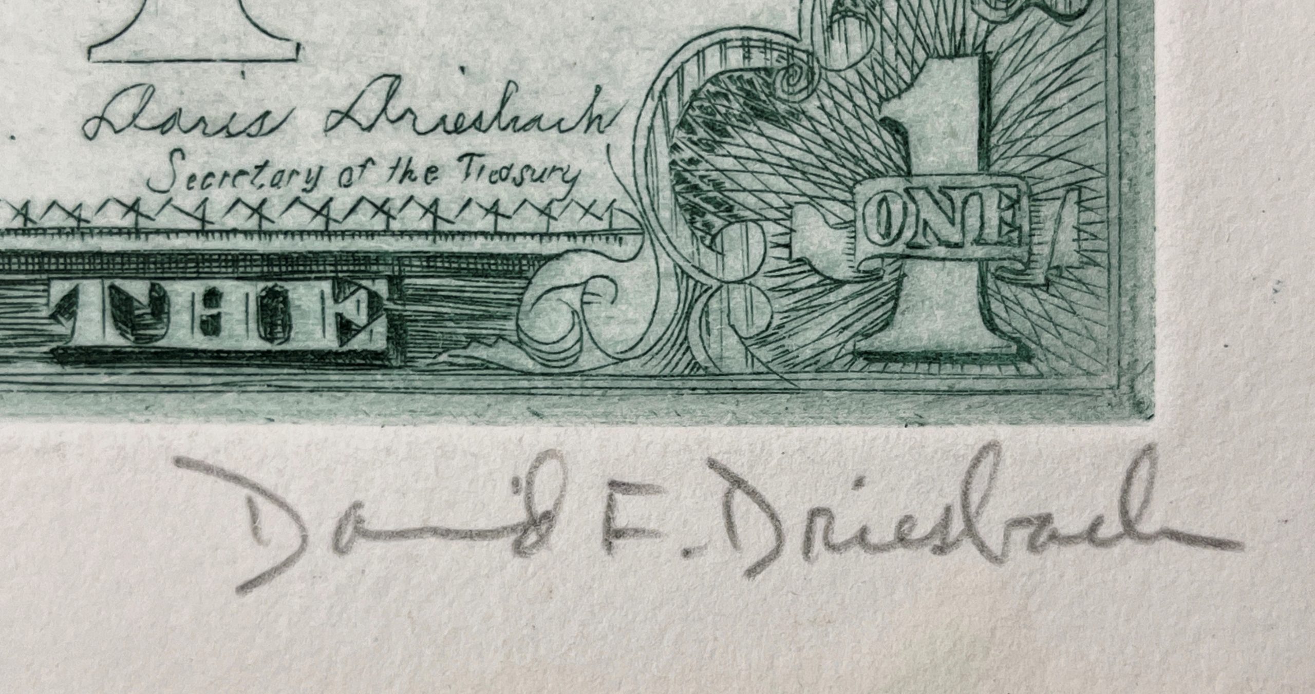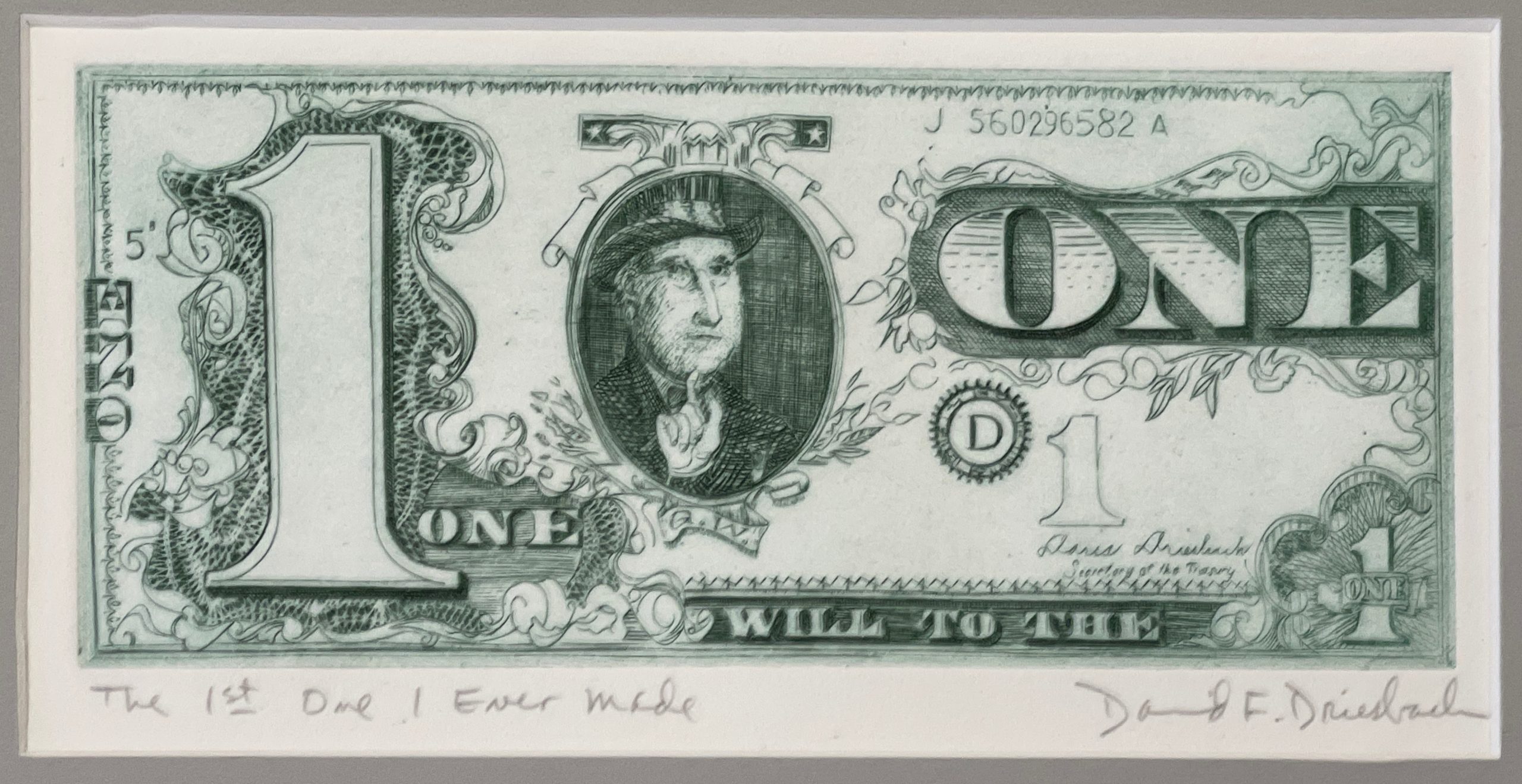 This work by David Frasier Driesbach is a terrific work of print-making and a terrific image, showing Driesbach instead of George Washington and signed by his wife (to whom he was deeply devoted) as Secretary of Treasury.