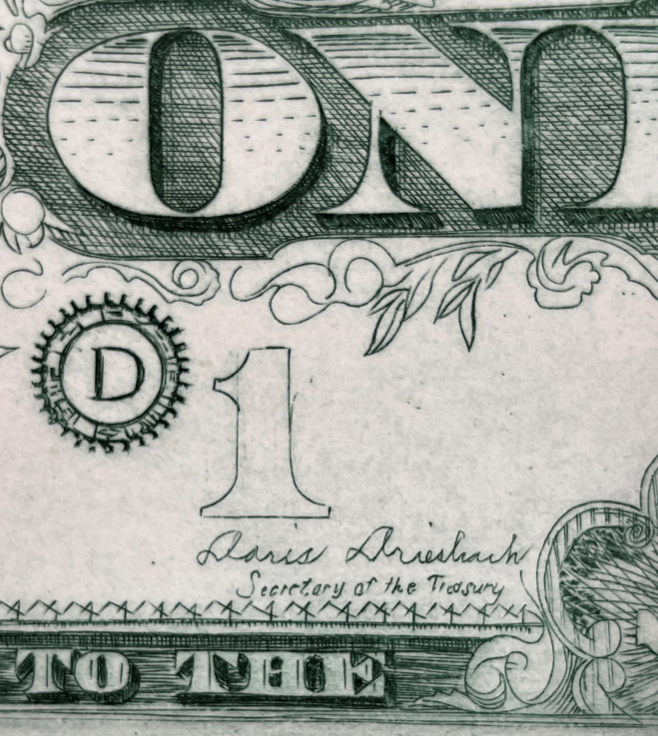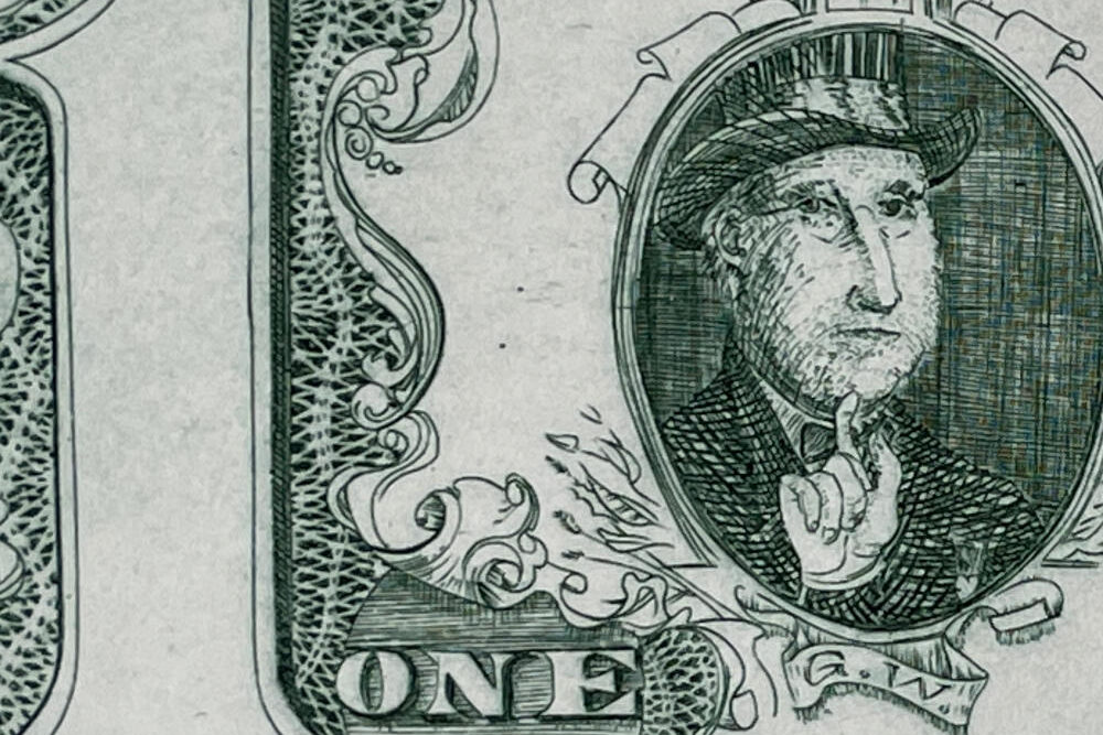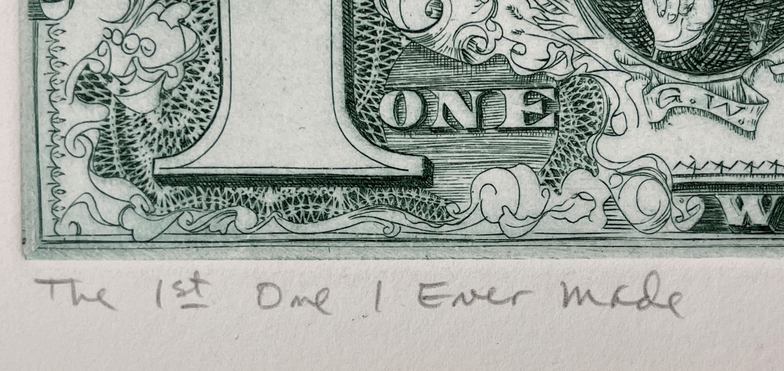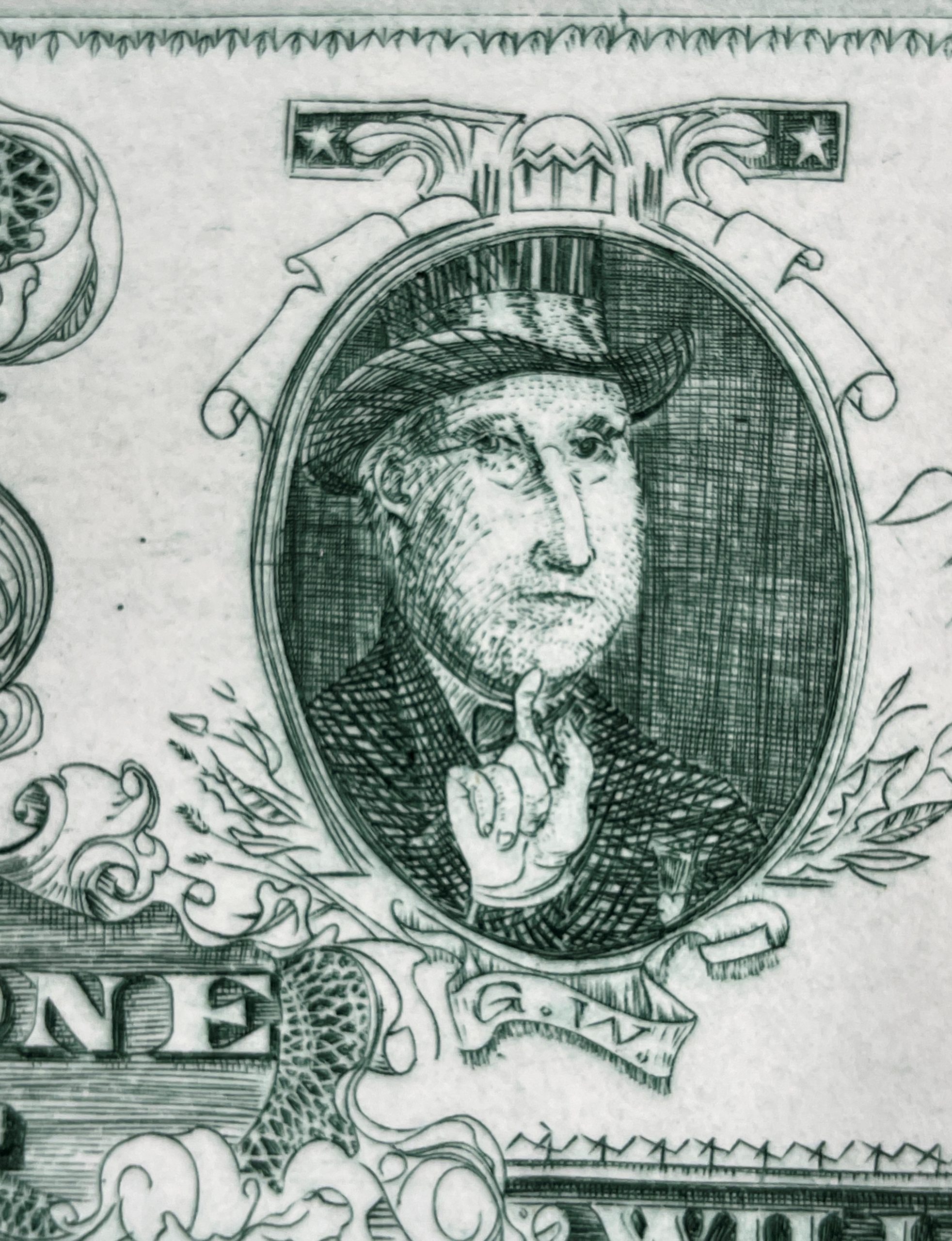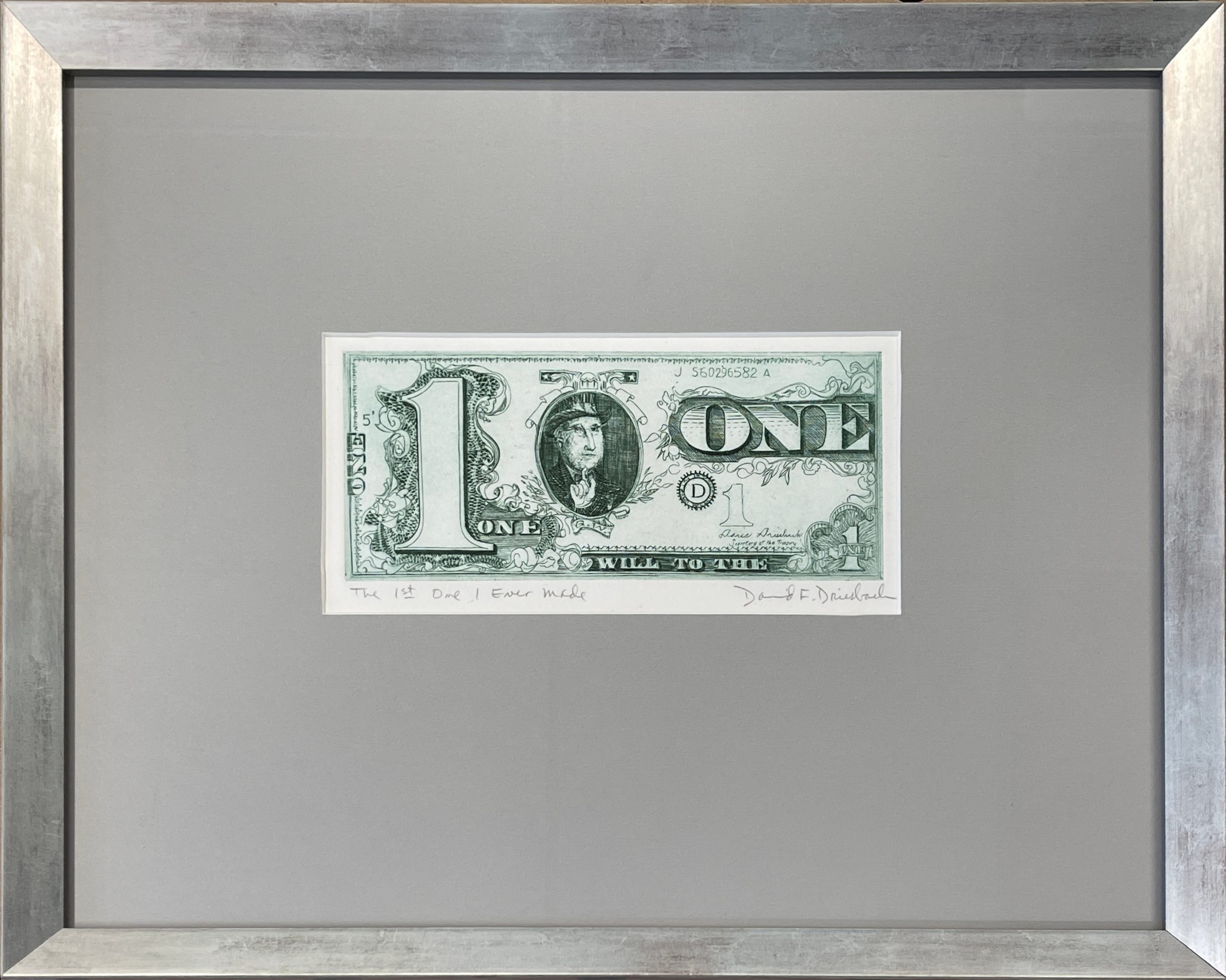 This work by David Frasier Driesbach is a terrific work of print-making and a terrific image, showing Driesbach instead of George Washington and signed by his wife (to whom he was deeply devoted) as Secretary of Treasury.