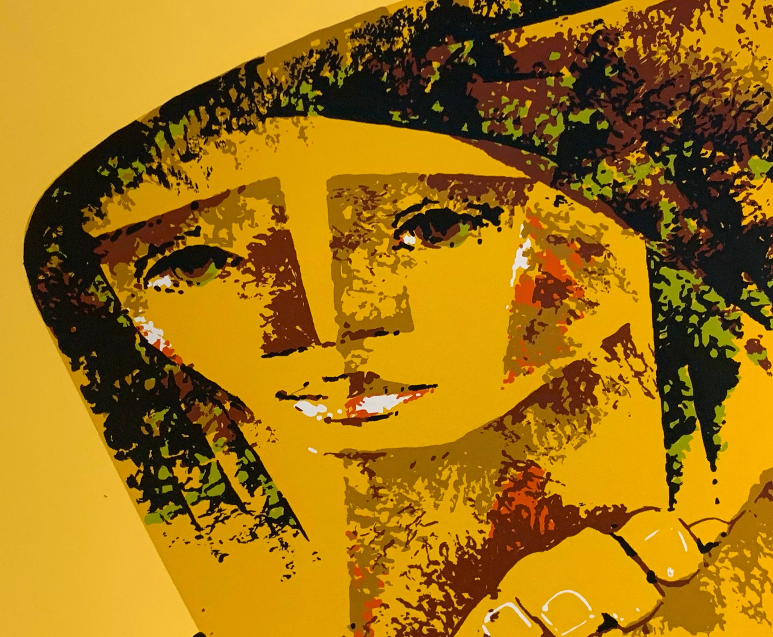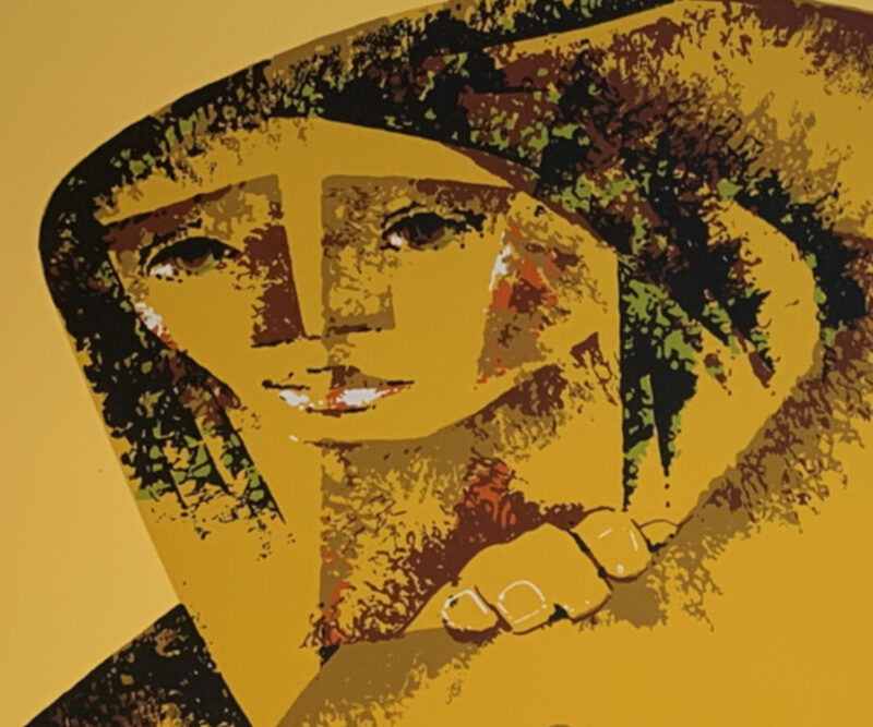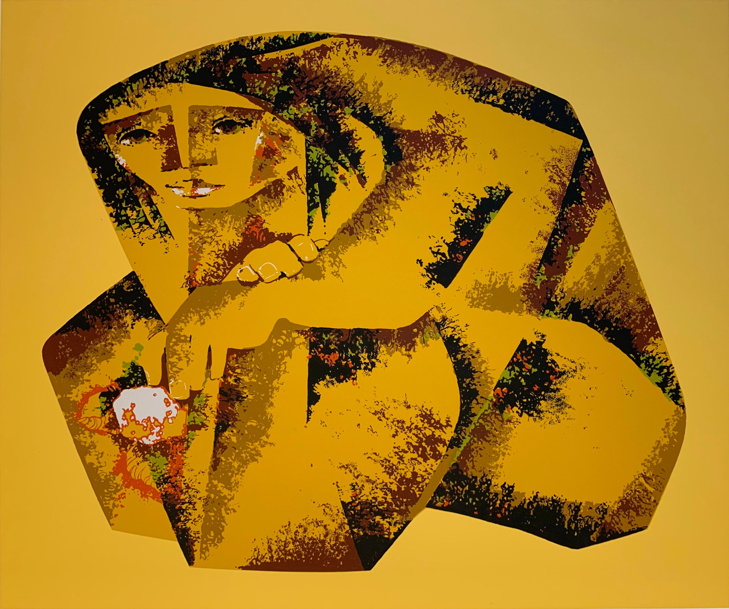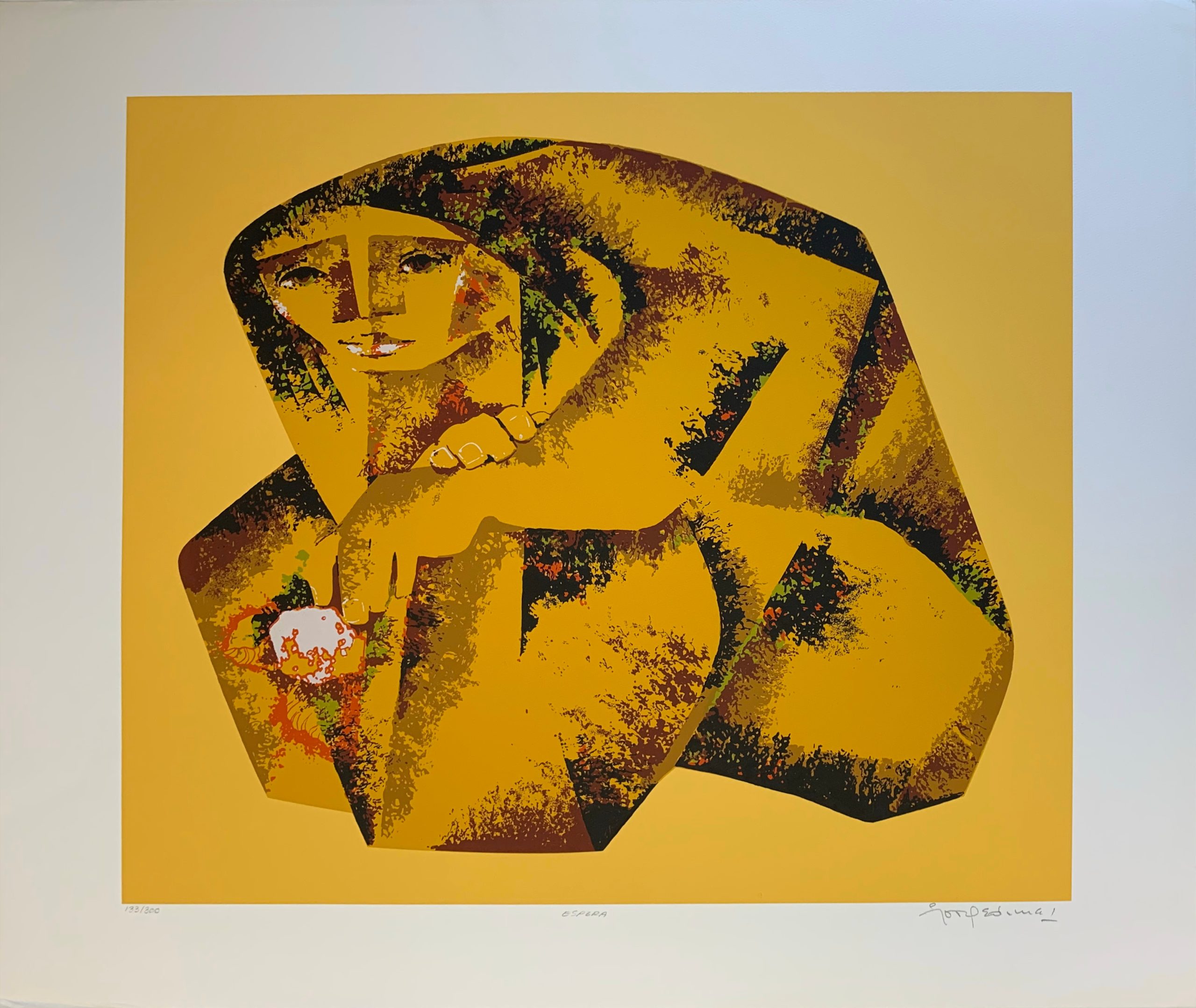 This cubist lithograph by the modernist Jorge E. Dumas is remarkably expressive. The deep earthy yellow and richly-inked picture give it great presence. This is not a picture for a hidden place or tiny room.