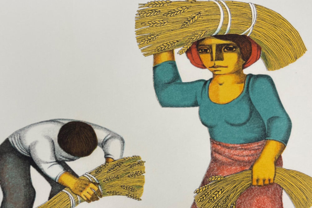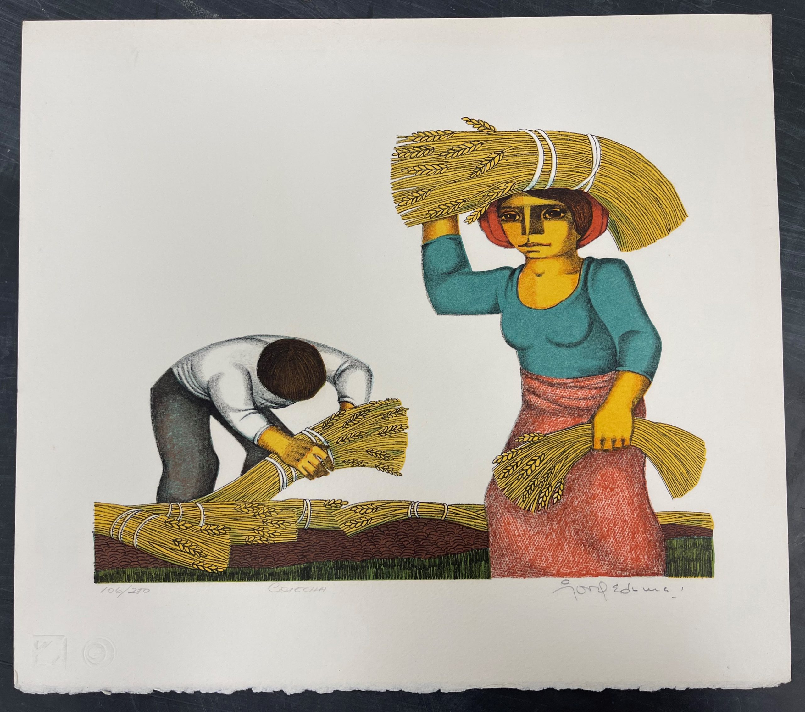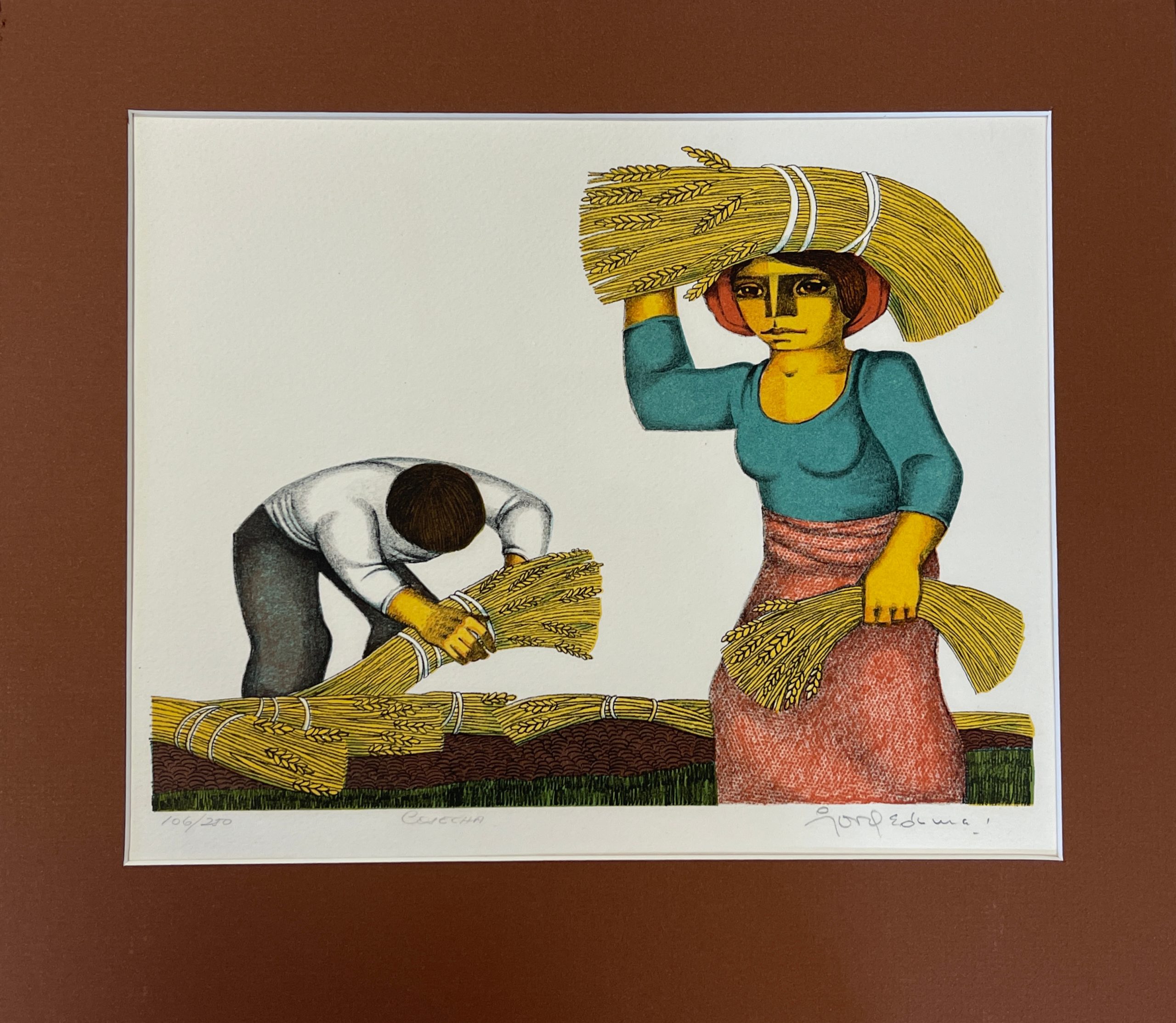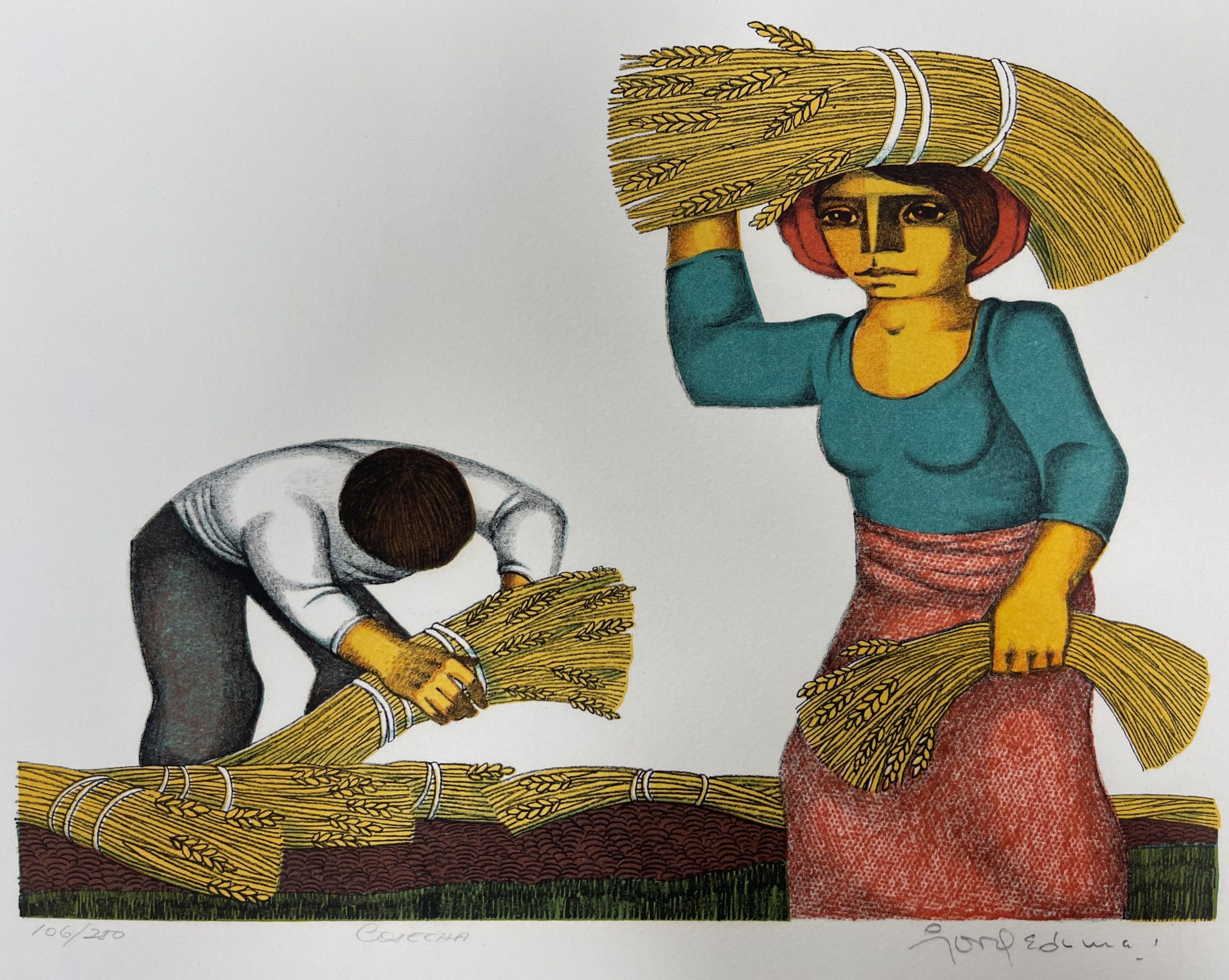 This cubist lithograph by the modernist Jorge E. Dumas is remarkably expressive. The deep earthy colors and richly-inked picture give it great presence. This is not a picture for a hidden place.