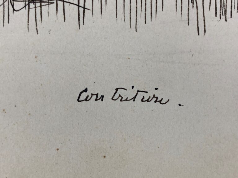 This etching, entitled Contrition, is a completely tongue-in-cheek confession of contrition, in which a young man righteously declaims his intent to confess to his father his excessive celebration of the last day of exams. Hand-written in pencil by the artist en recto:
