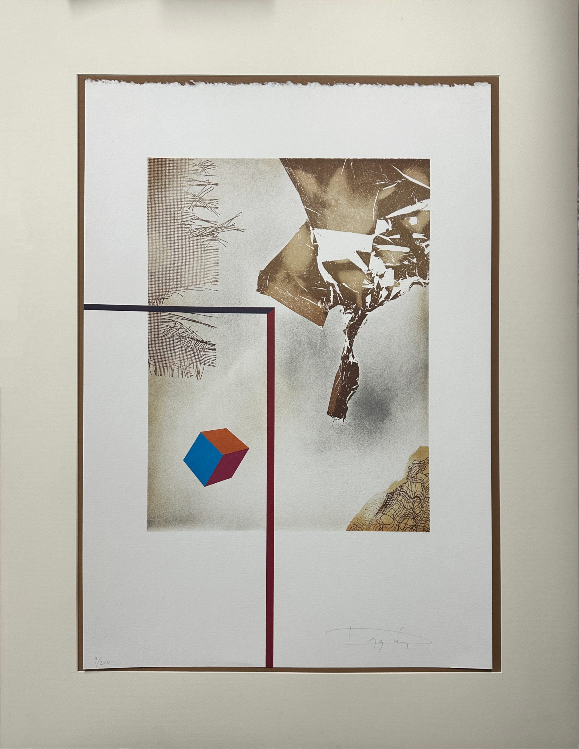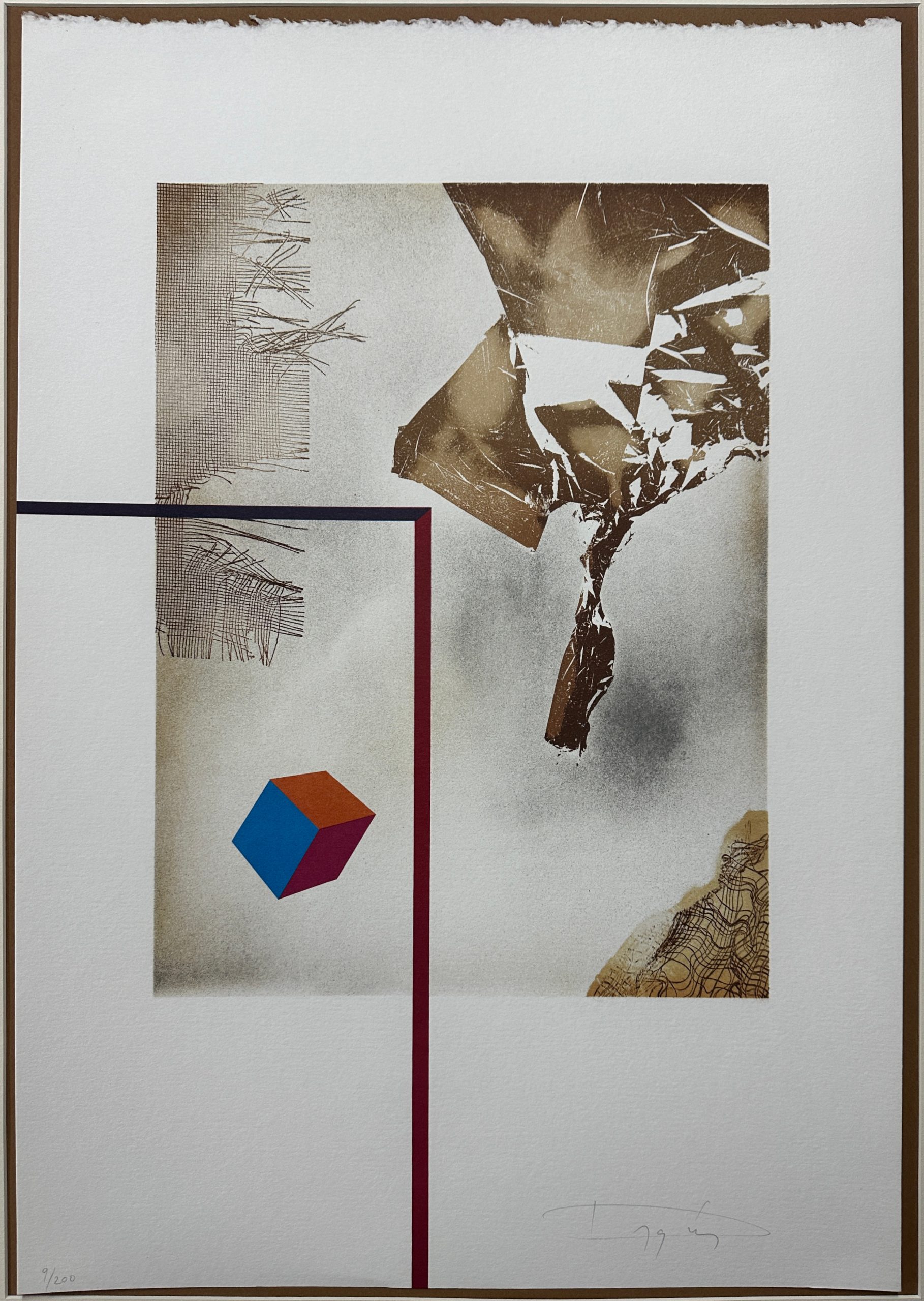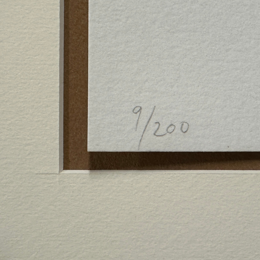 An archetypal example of Dus’ compositions of layered organic shapes, hard-edged lines and shapes, images of fabric and grids, and shadowing to create an engaging picture. Custom framed in a solid white oak frame using strictly conservation-grade materials behind 99% UV-blocking glass.