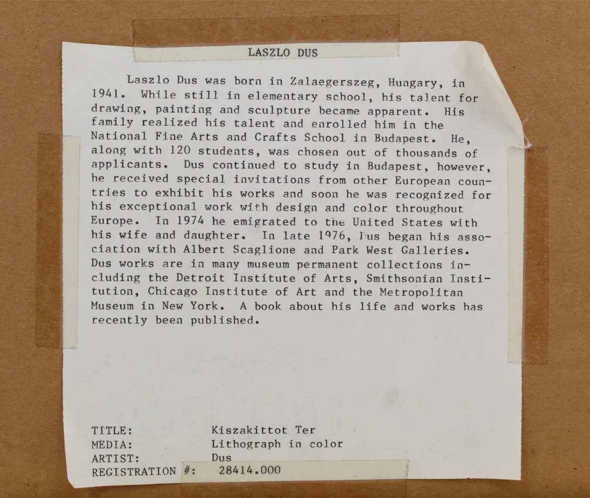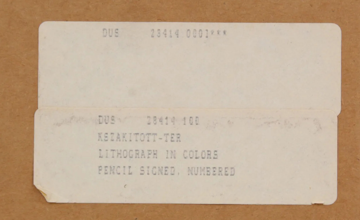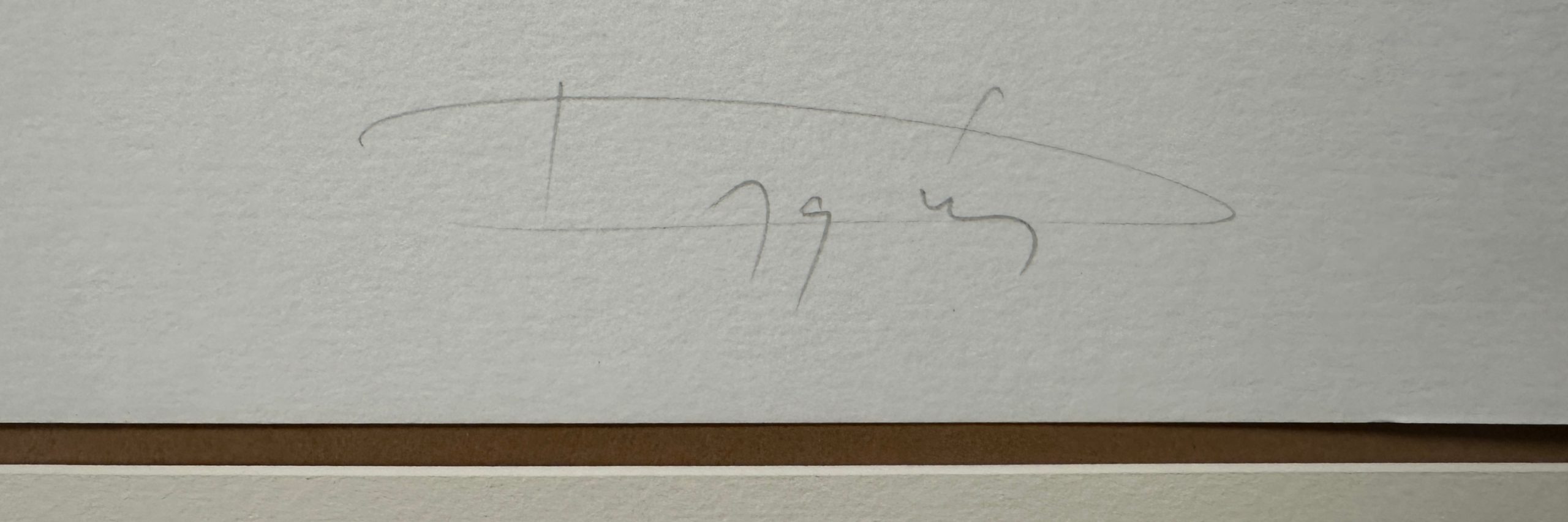 An archetypal example of Dus’ compositions of layered organic shapes, hard-edged lines and shapes, images of fabric and grids, and shadowing to create an engaging picture. Custom framed in a solid white oak frame using strictly conservation-grade materials behind 99% UV-blocking glass.
