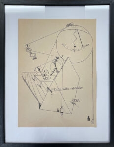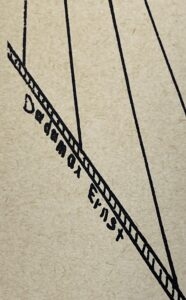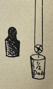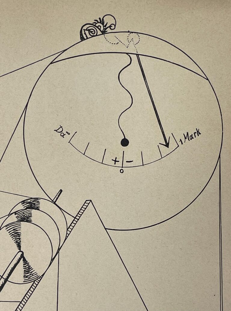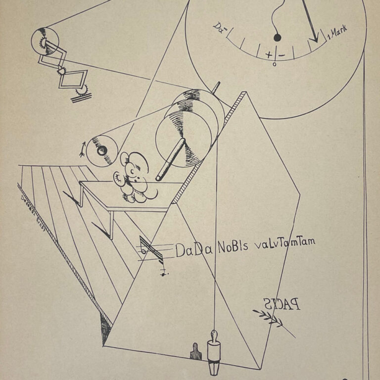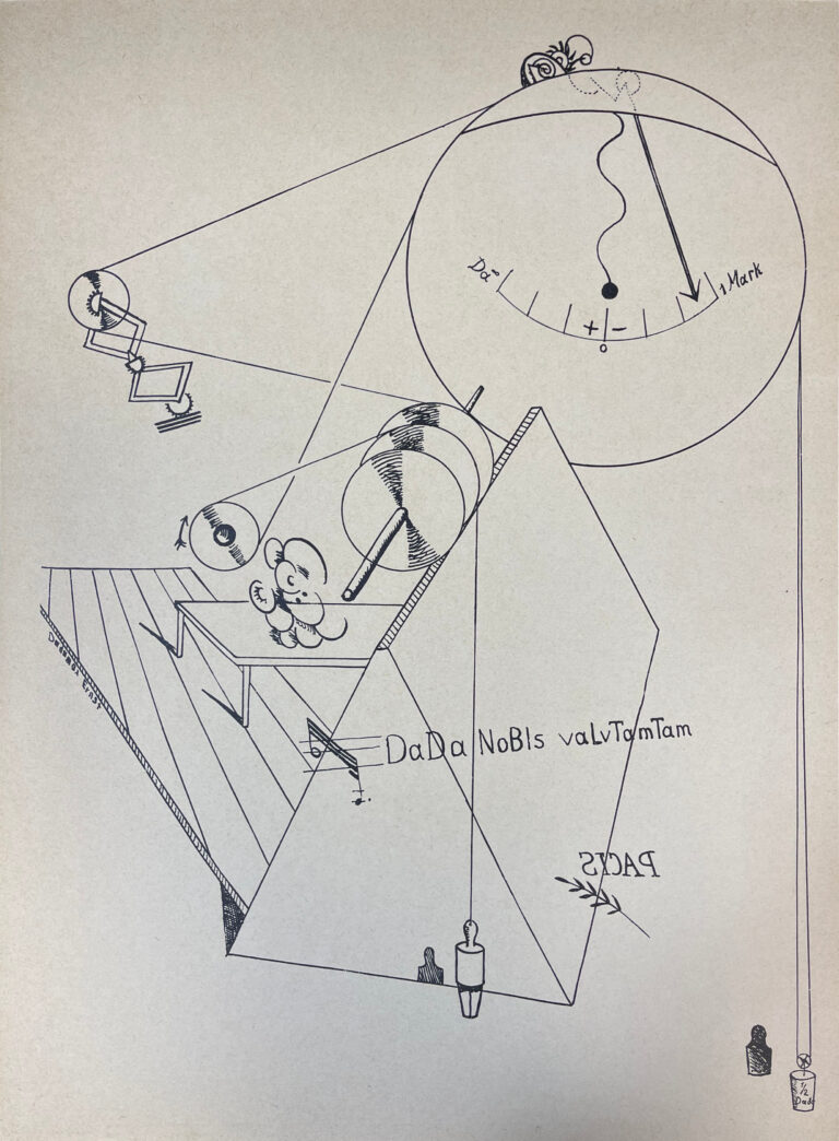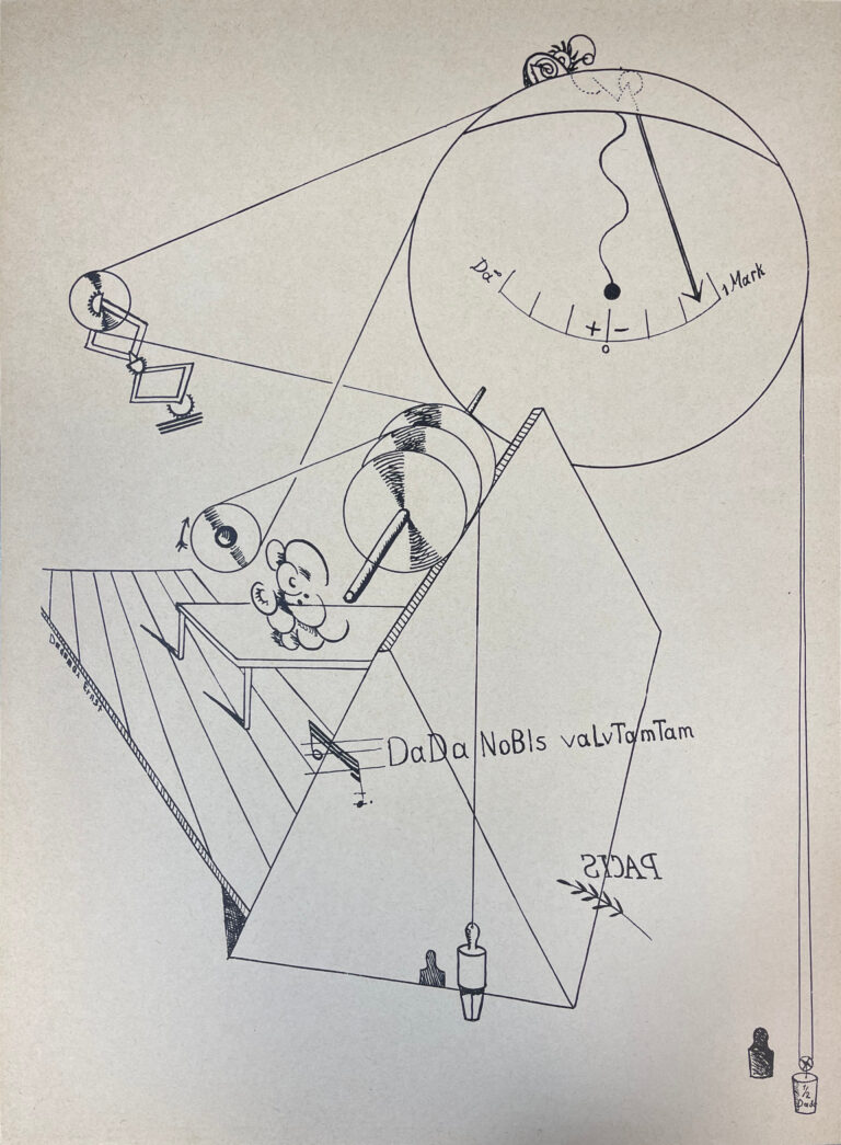 In this print—the very last and perhaps most important of the series in the portfolio—we see an anthropomorphic weight pulling a string which ties to a scale, which in turn might be interpreted to show the value of Dada through the reference to the single German Mark.