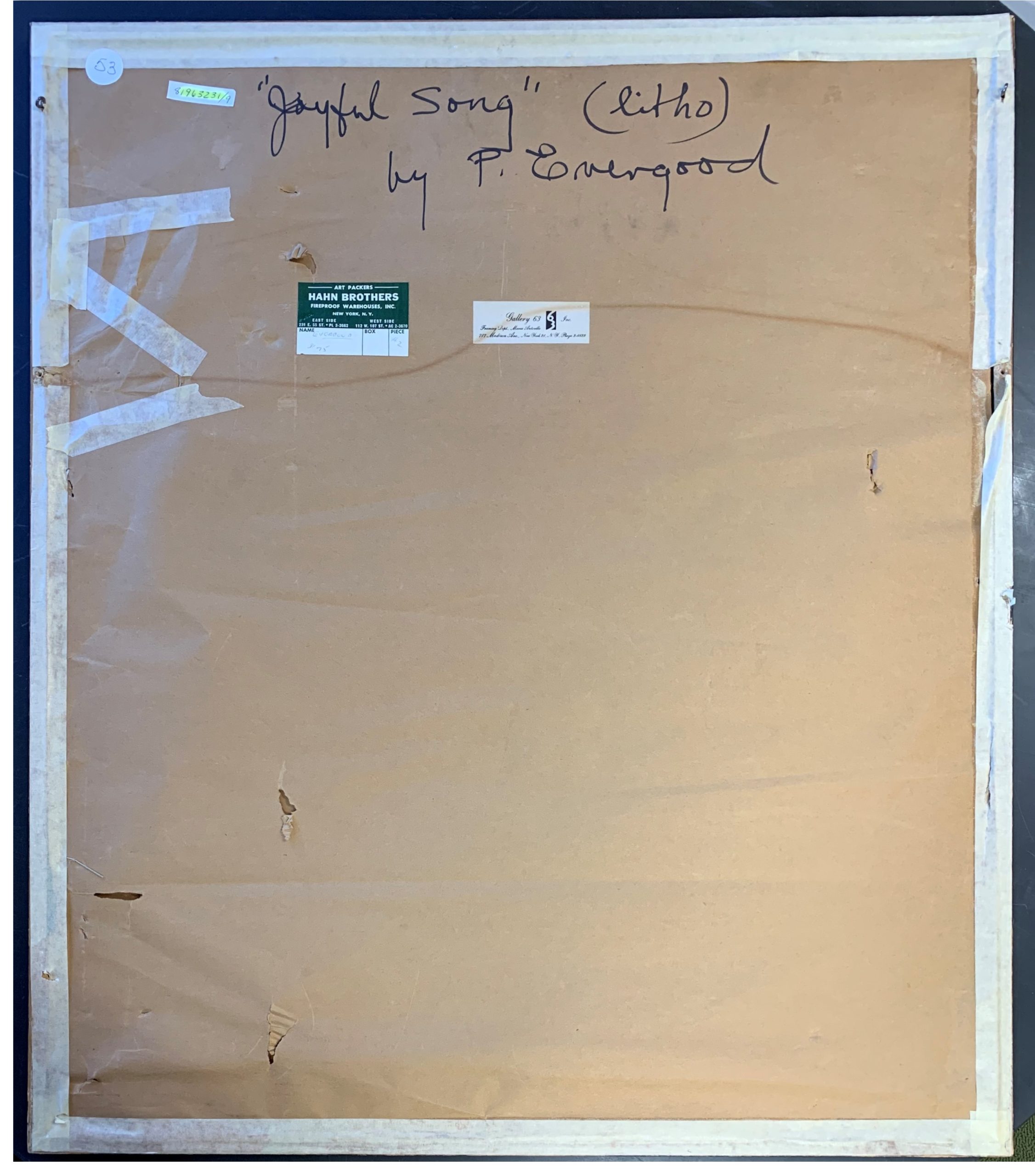 As is frequently true with Evergood’s work, Evergood’s titling of this work was inconsistent. It has been seen titled “Joyous Song” (the title used by Lippard), “Joyful Song”, and “Banjo Player”.