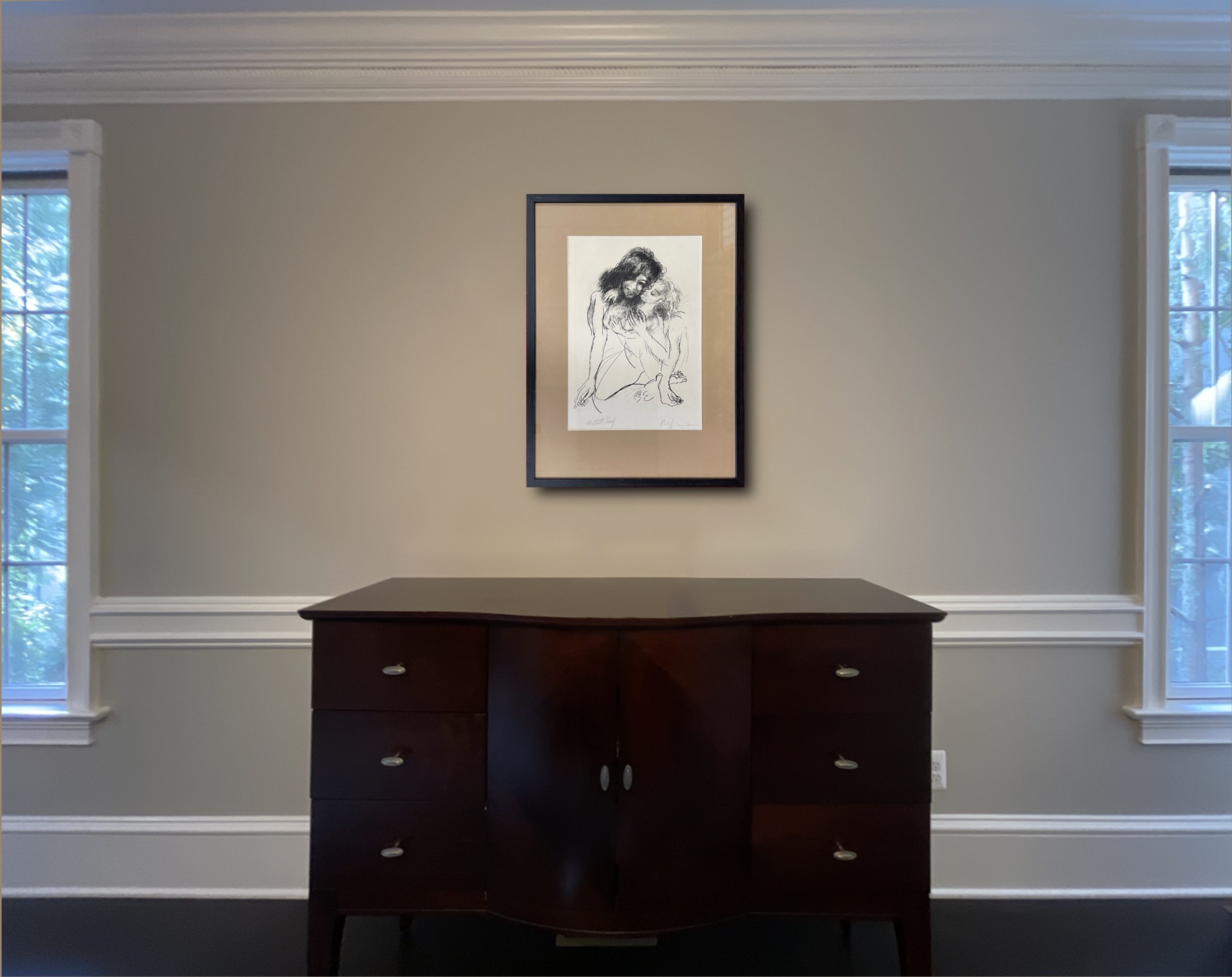 Custom framed and matted with a laid-paper mat behind 99% UV-blocking art glass using strictly conservation-grade materials.