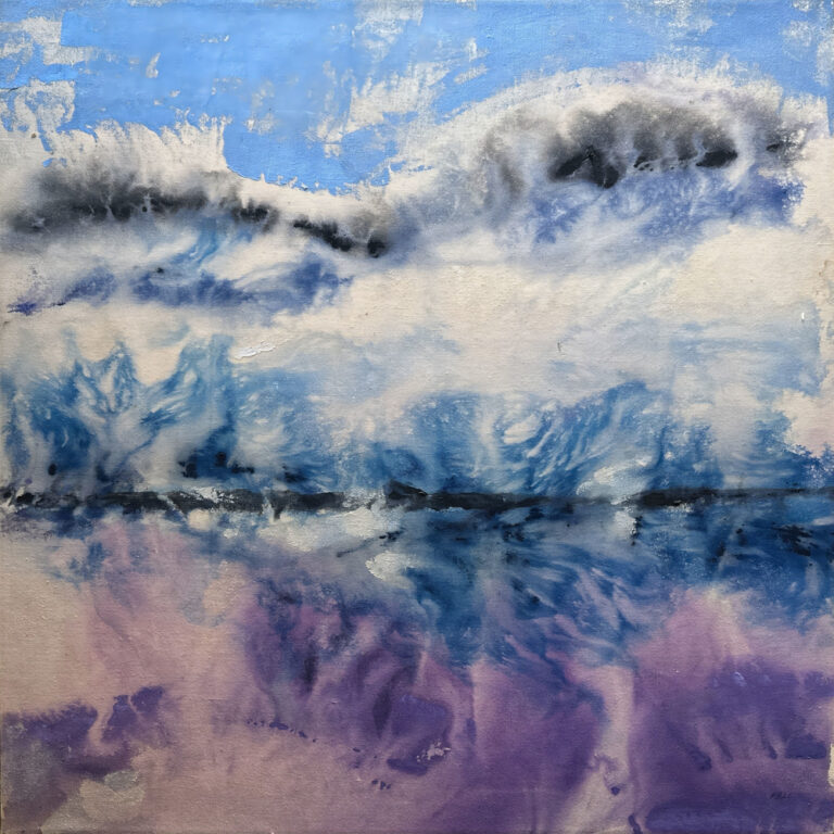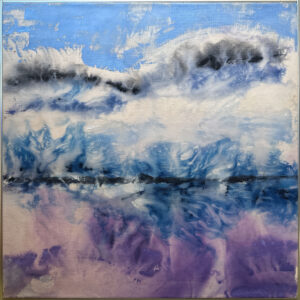 A swirl of snowy white mixed with blue above a bed of purples and blues, a reflection of the mountain in the water. A fine work by visionary Washingtonian Dorothy Fall.