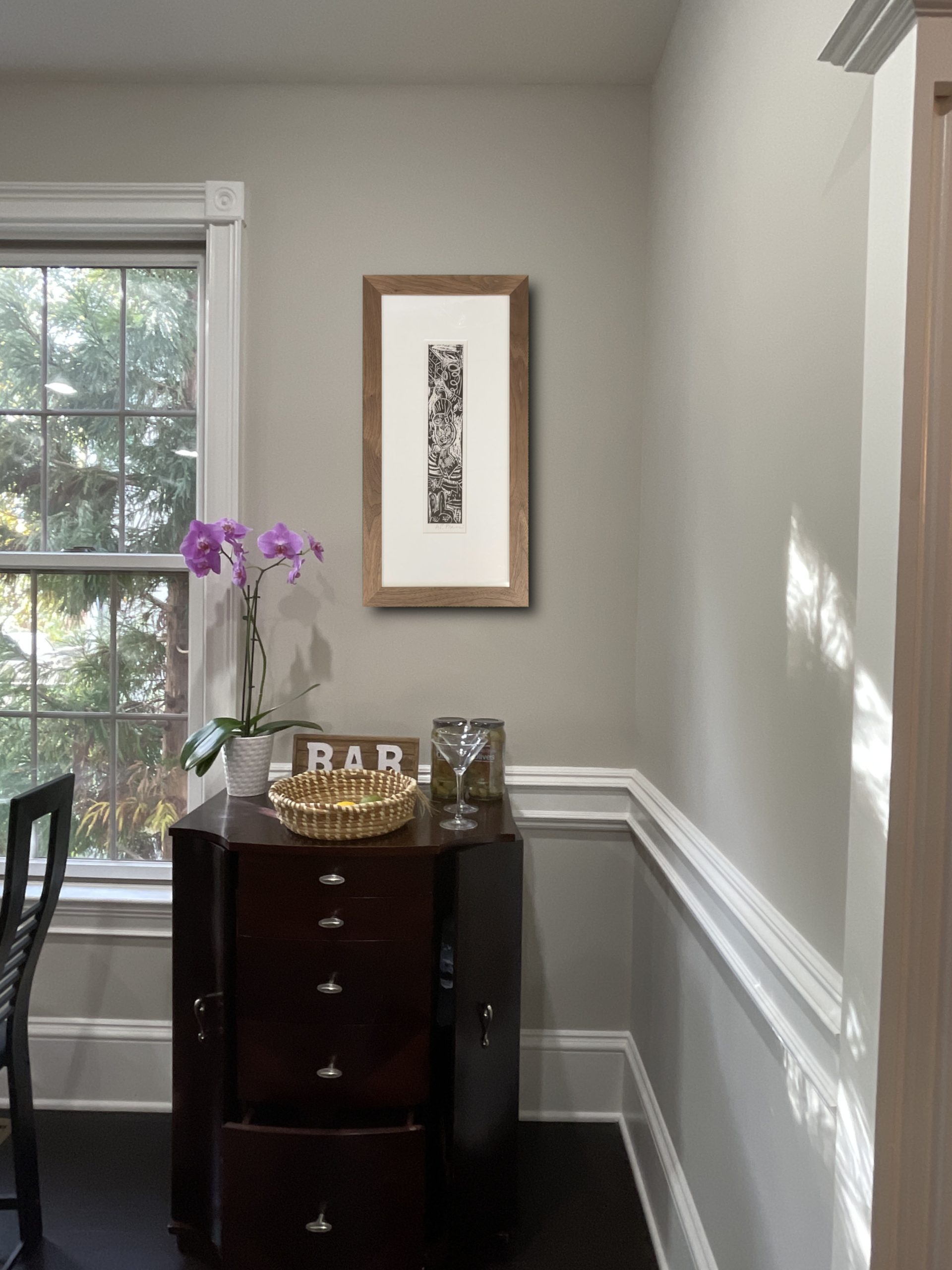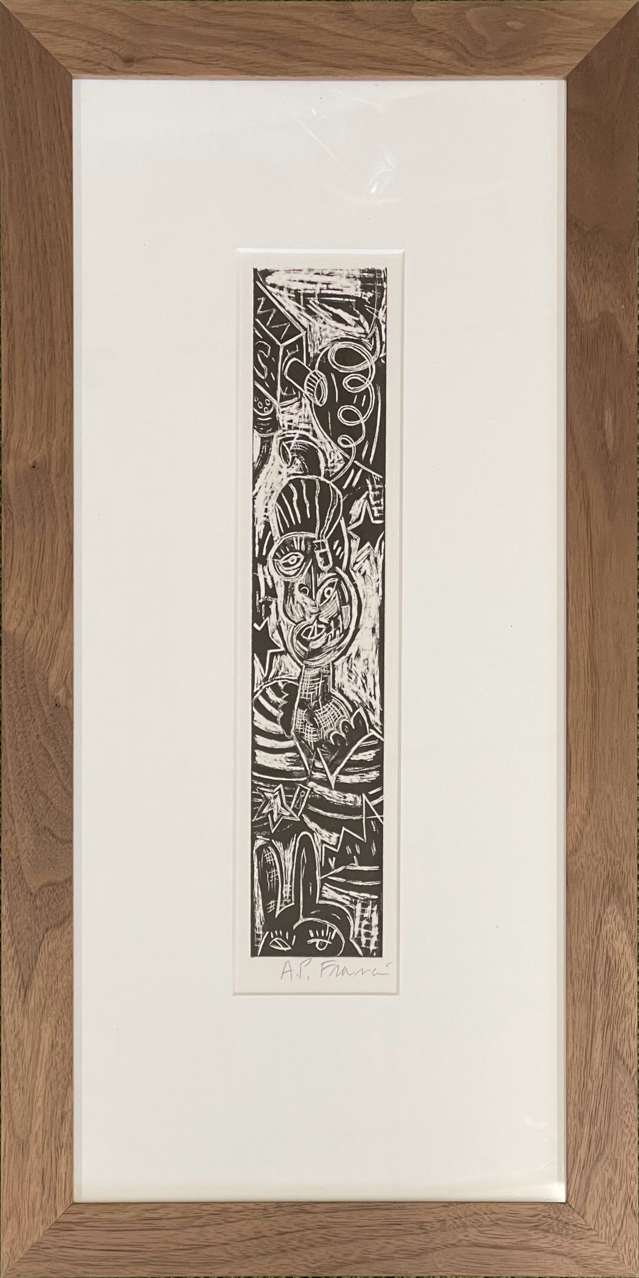 Custom matted and framed in a solid walnut frame behind 99% UV-filtering art glass. All conservation materials.