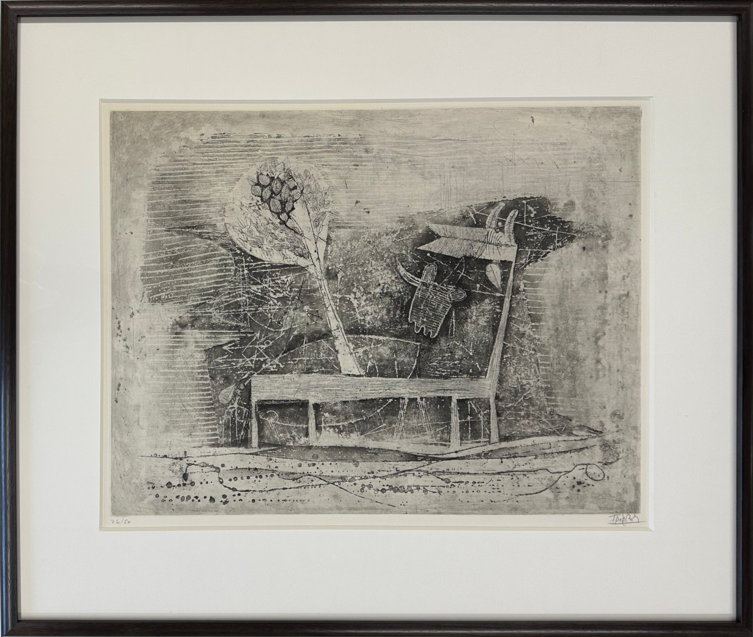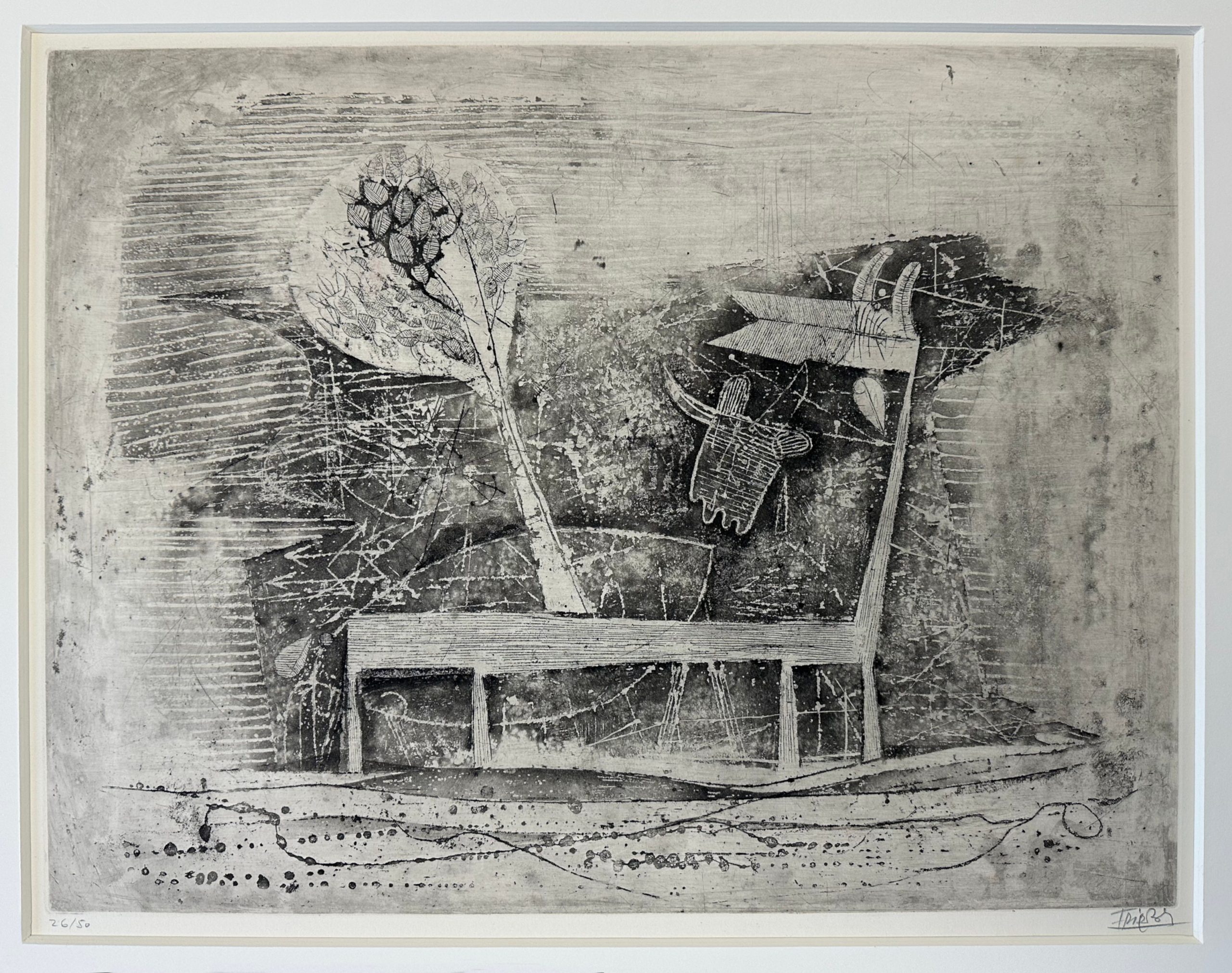 An early work by a master printmaker; a rare figurative work by an artist whose work increasingly moved to the abstract. Professionally framed in a solid walnut frame using strictly conservation-grade materials behind 99% UV-blocking art glass.