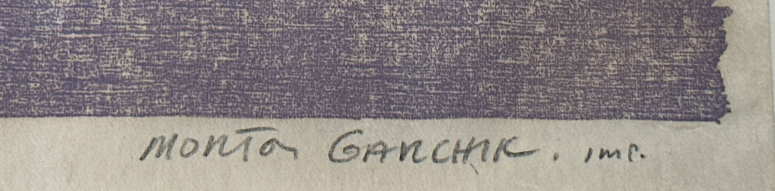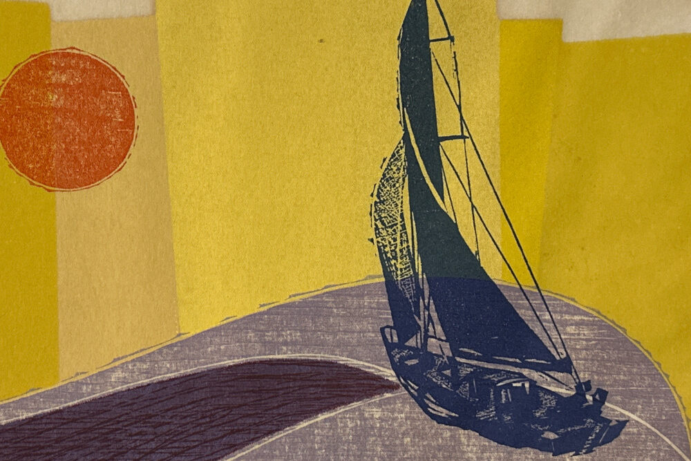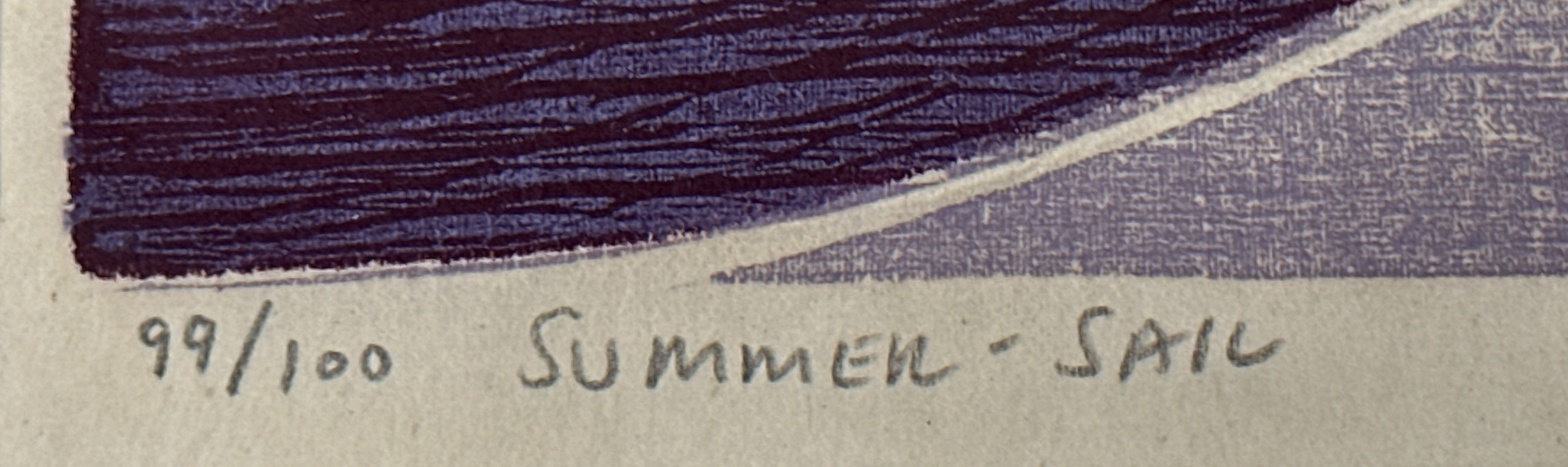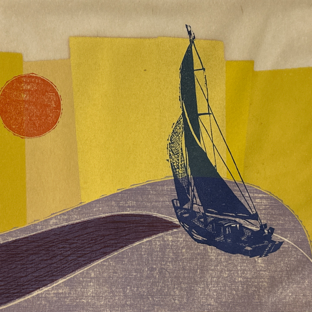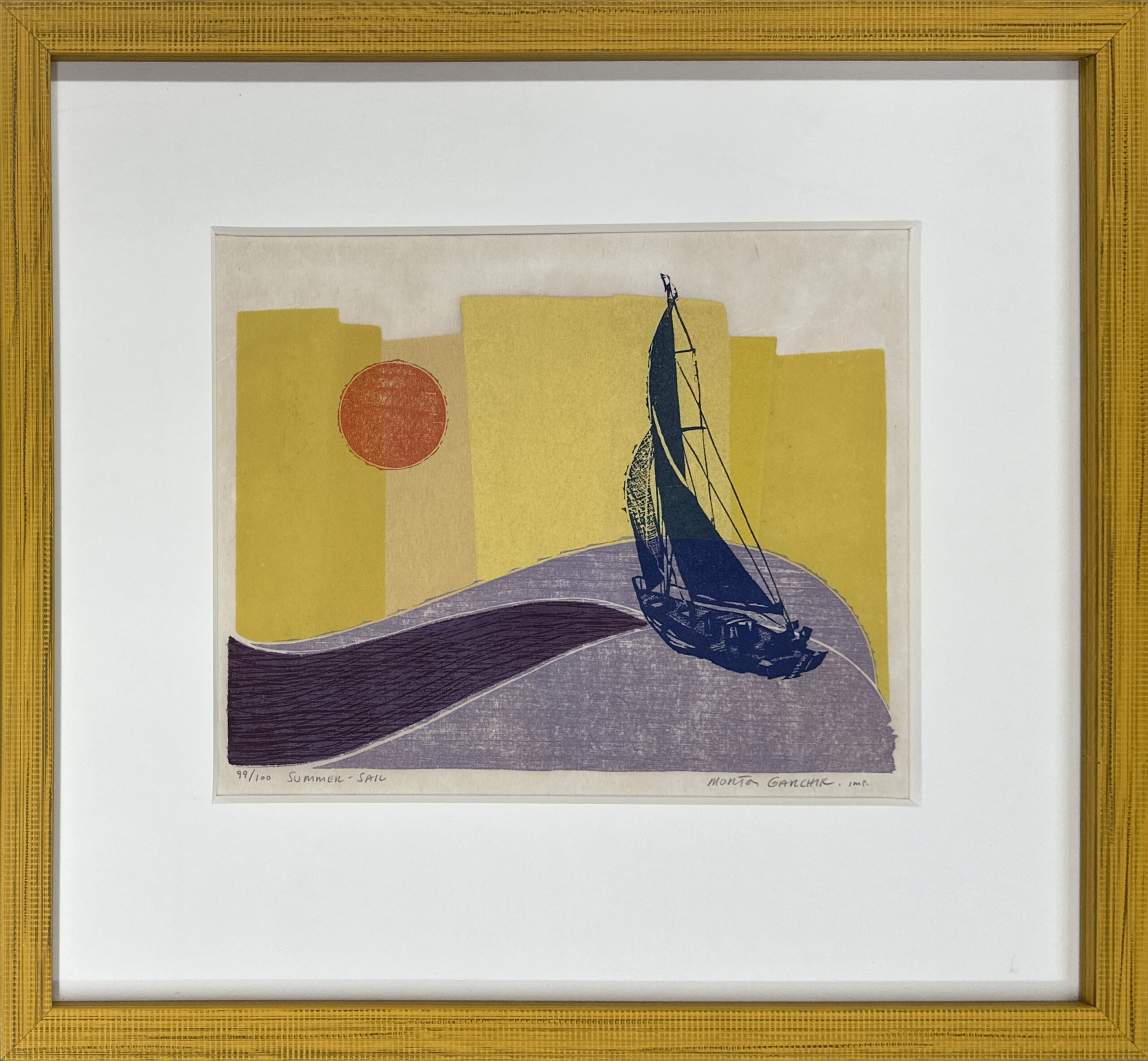 A sailboat. A golden sky. Blue waters. An idyllic summer sailing scene. Printed by Morton Garchik’s own hand.