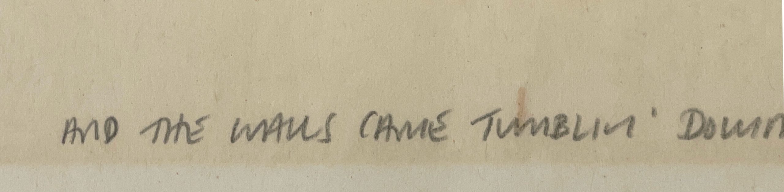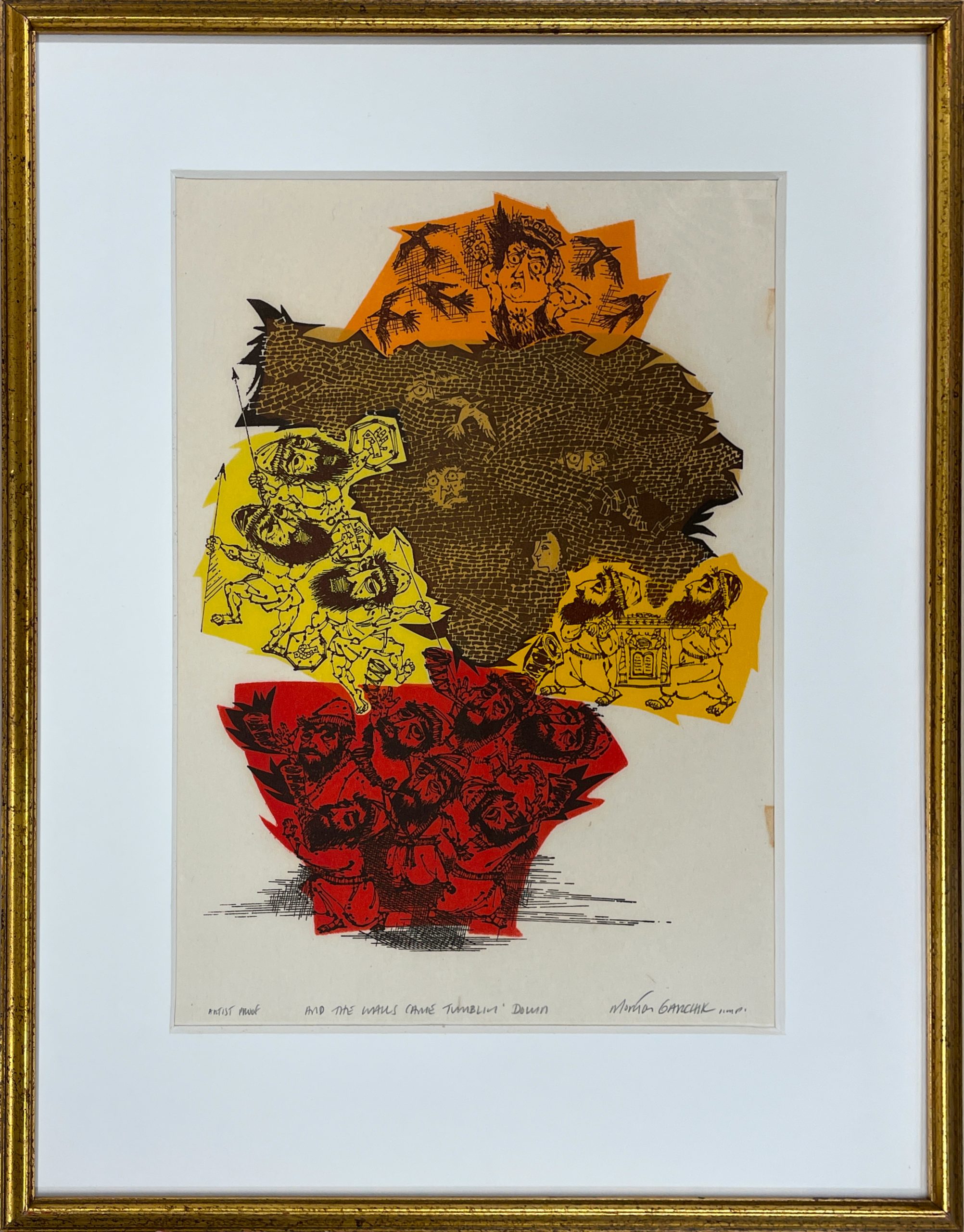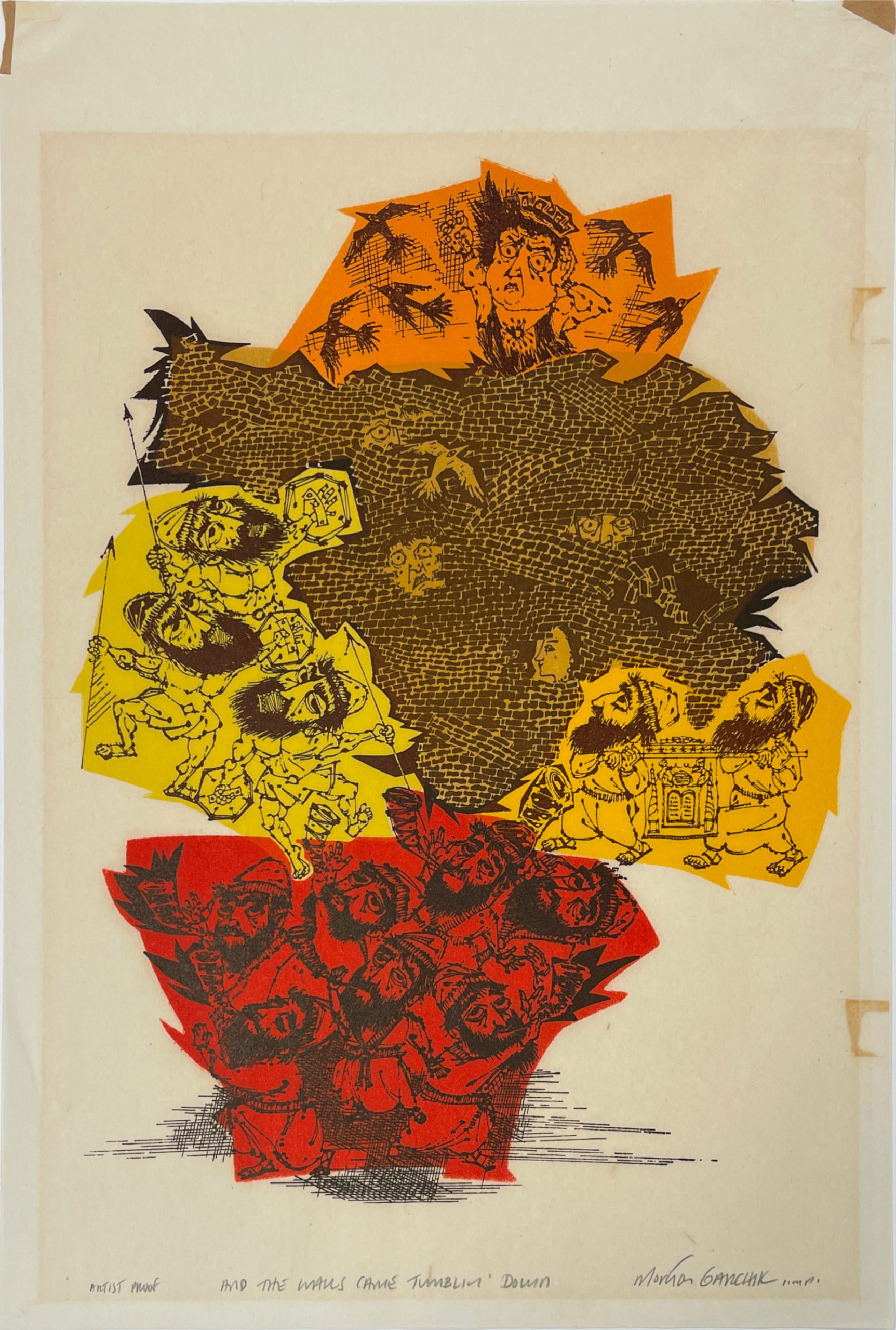 This work is Morton Garchik’s vision of the fall of the walls of Jericho. The Book of Joshua tells the story of the Battle of Jericho, the first battle in the Israelite’s conquest of Canaan—the promised land. The Israelites marched around the city walls once a day for six days and seven times on the seventh day and then blew their trumpets, at which point God caused the walls to come tumbling down, the story of Jericho is a lesson of the power of God.
