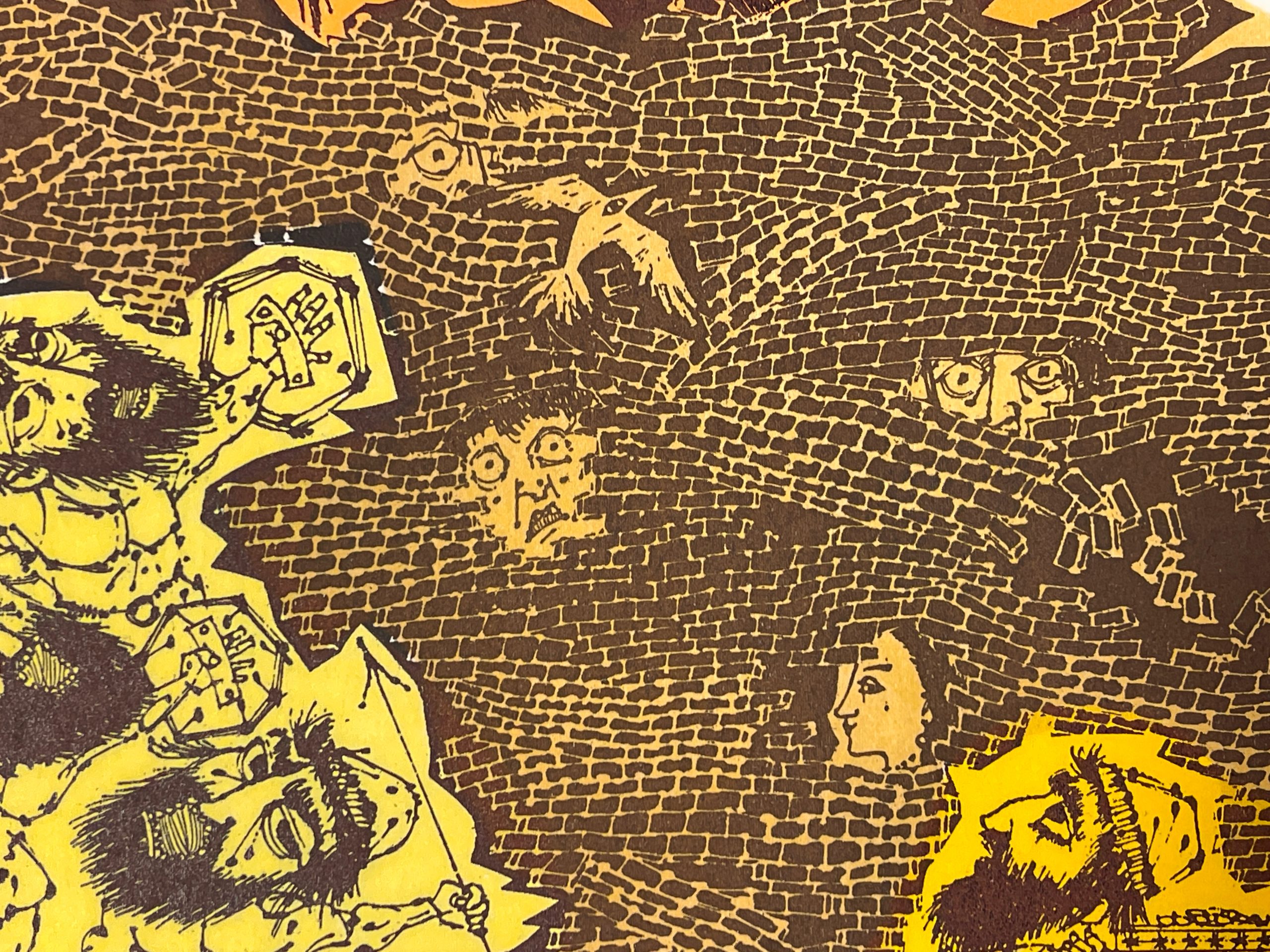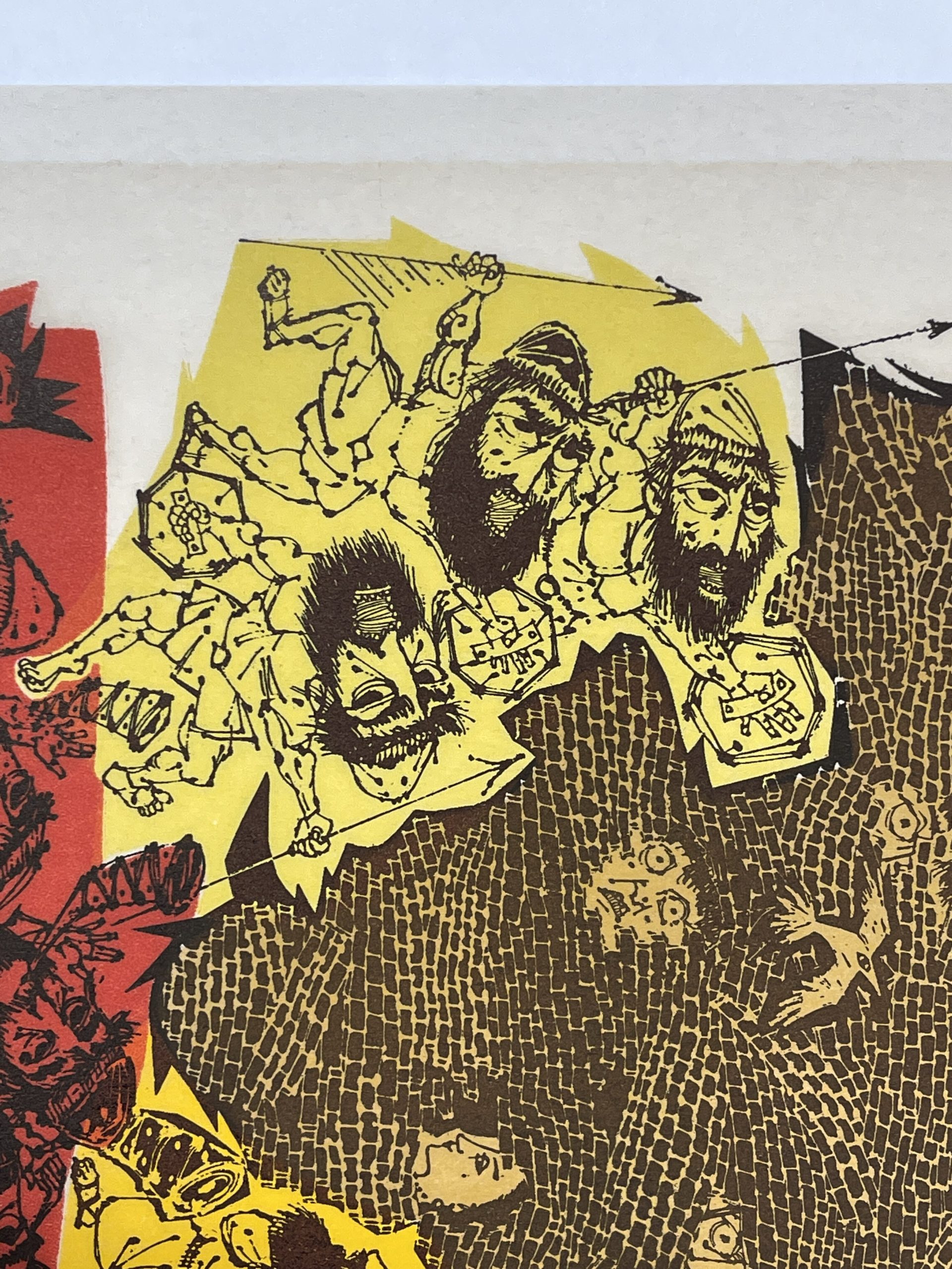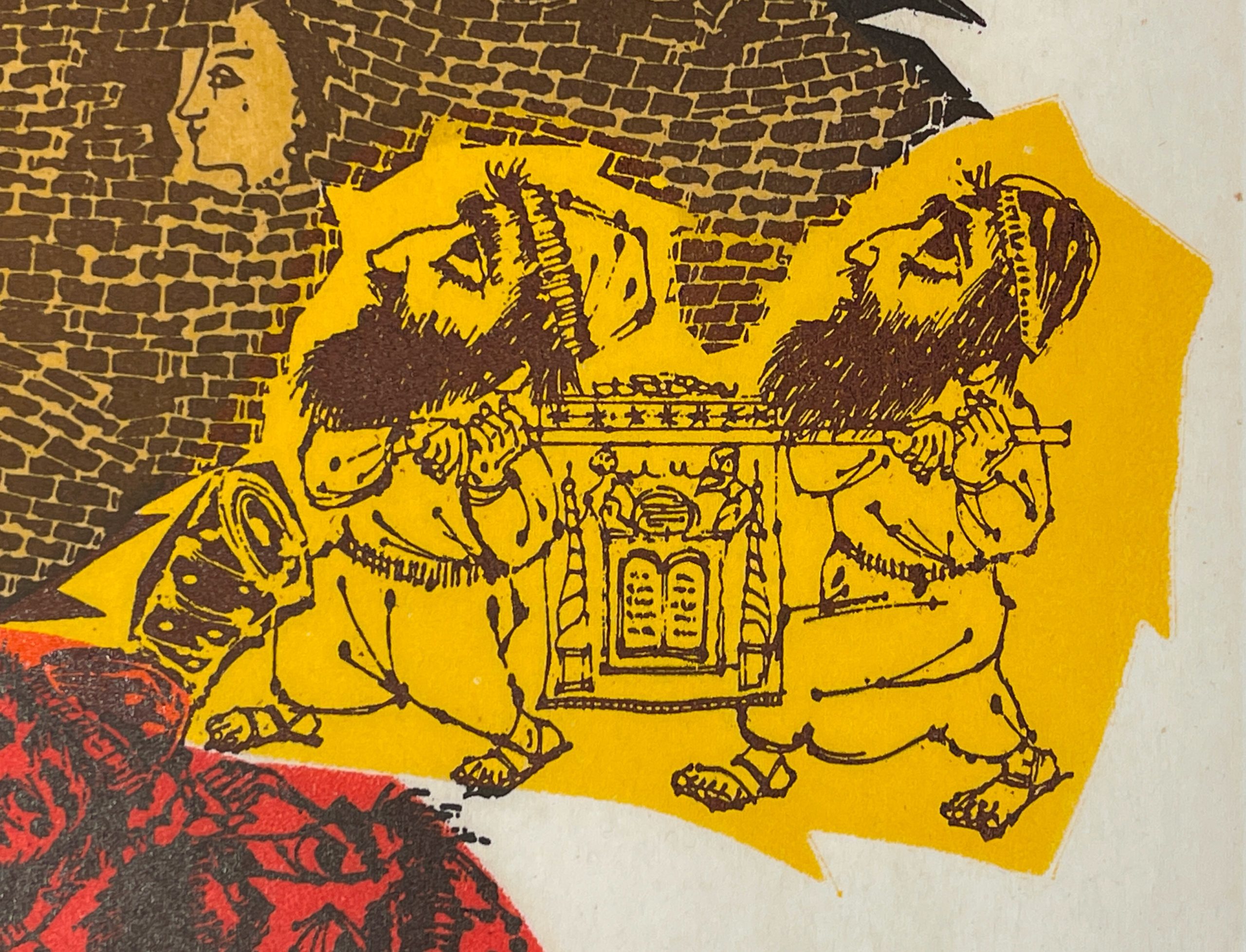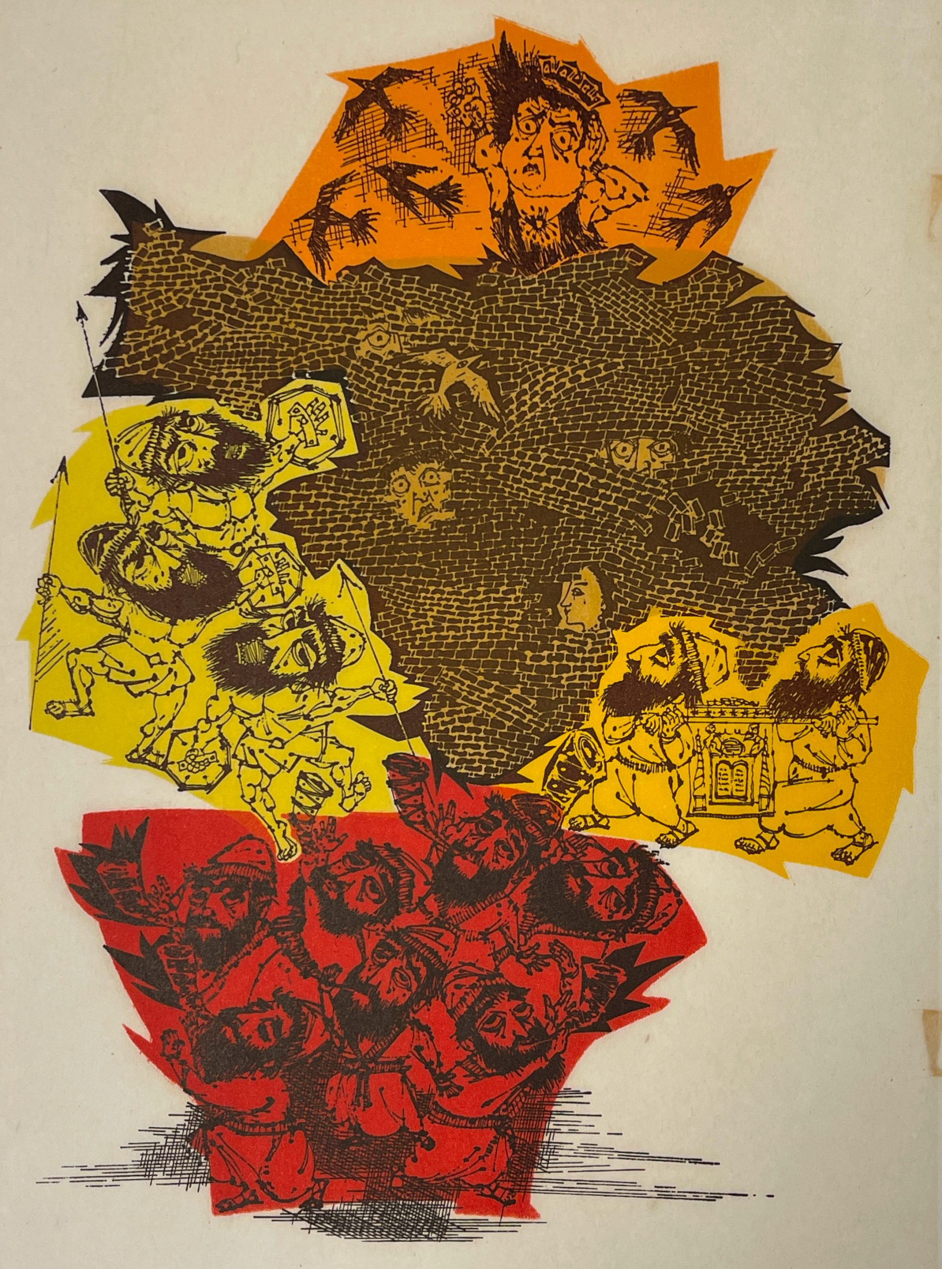 This work is Morton Garchik’s vision of the fall of the walls of Jericho. The Book of Joshua tells the story of the Battle of Jericho, the first battle in the Israelite’s conquest of Canaan—the promised land. The Israelites marched around the city walls once a day for six days and seven times on the seventh day and then blew their trumpets, at which point God caused the walls to come tumbling down, the story of Jericho is a lesson of the power of God.