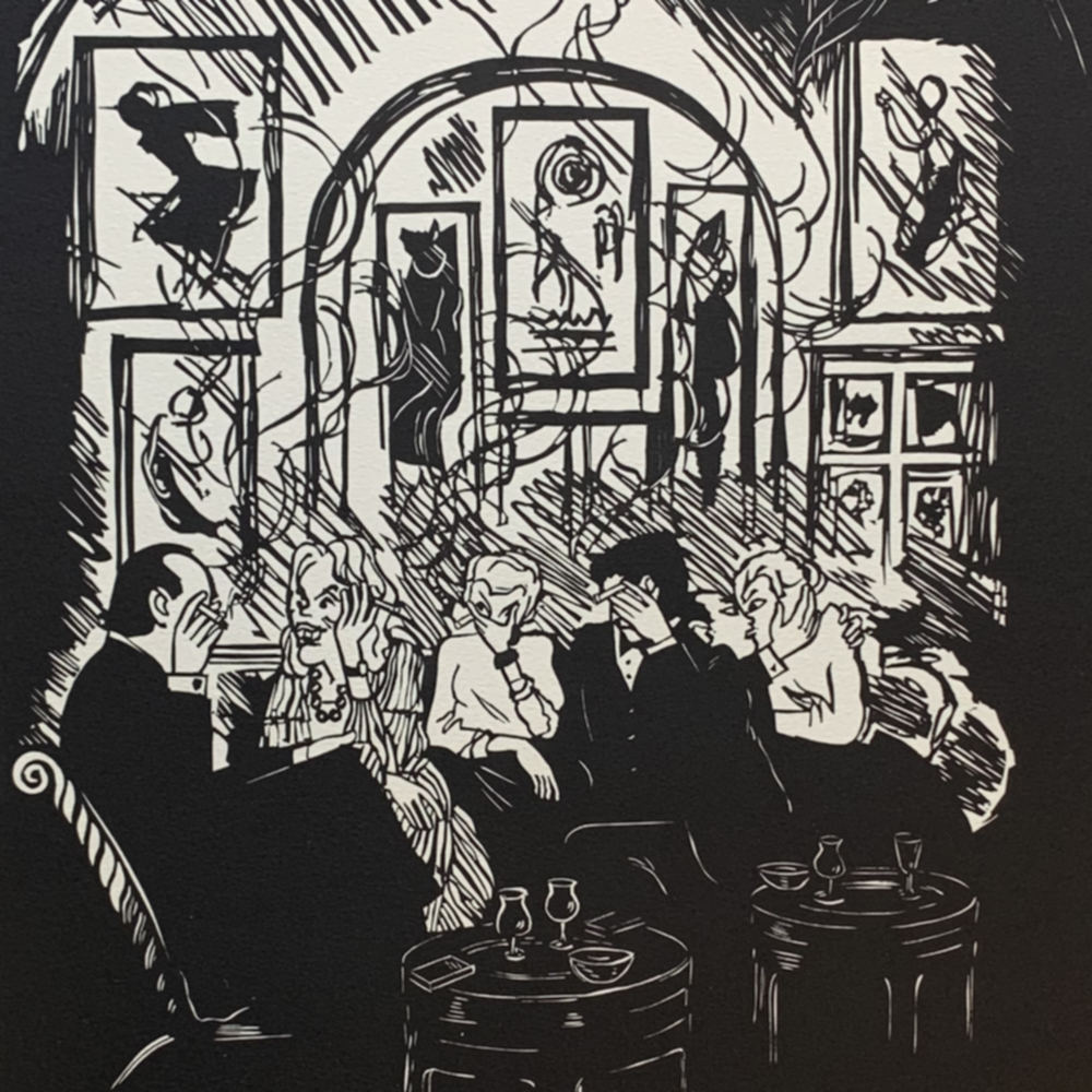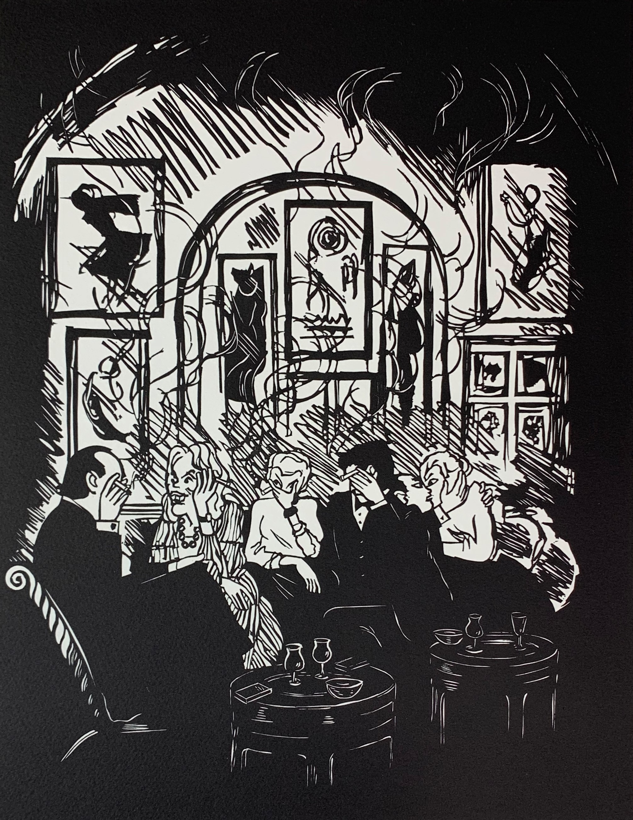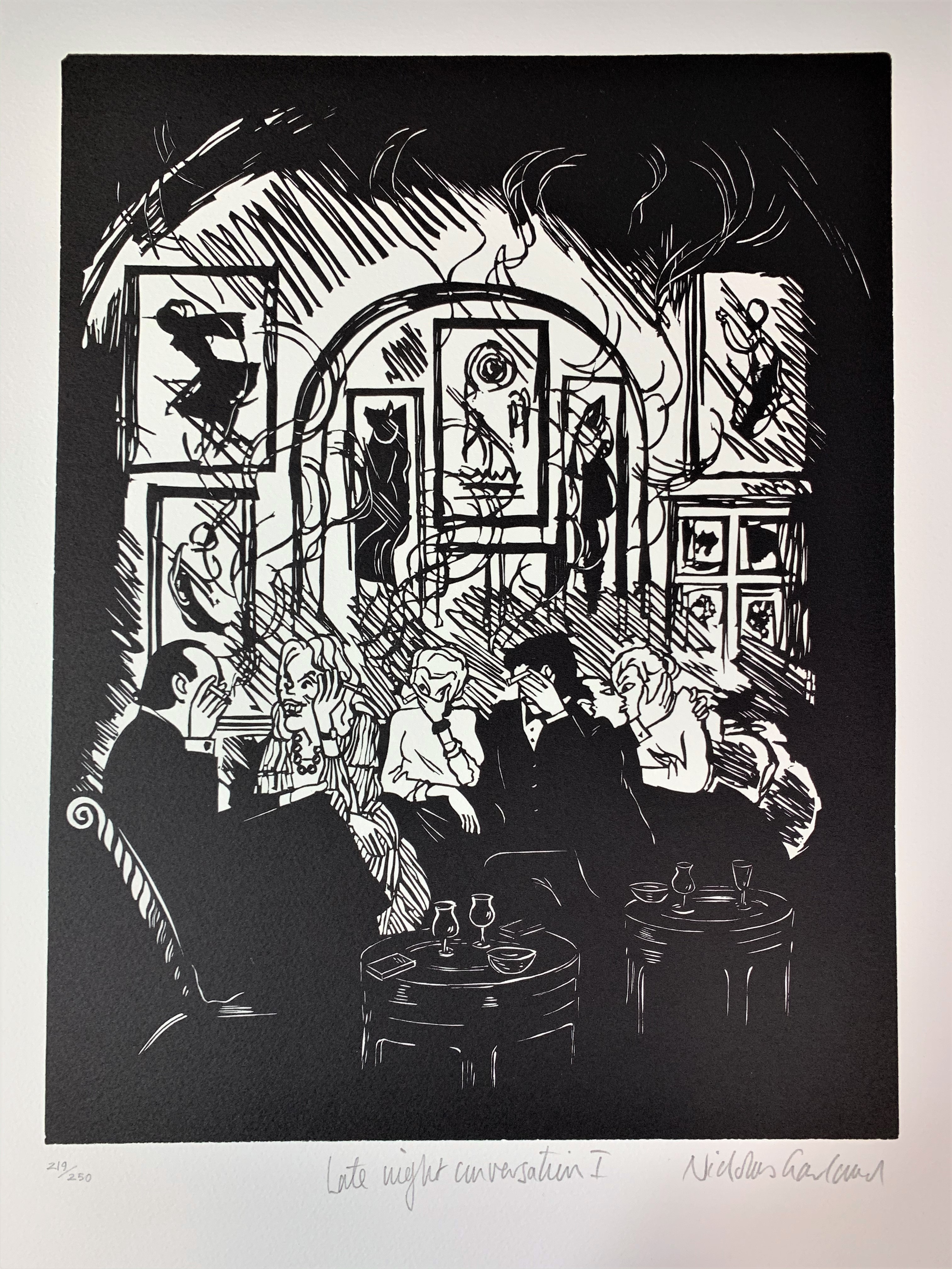 Anabel’s bar was widely considered to be the most elegant club in the London. This is a hyperbolic statement, but it is not hyperbole; it was actually thought of that way. The artist Nicholas Garland sat in the club and sketched the people he saw there. He later created the linocuts which were used to create the prints that formed the Anabel portfolio.