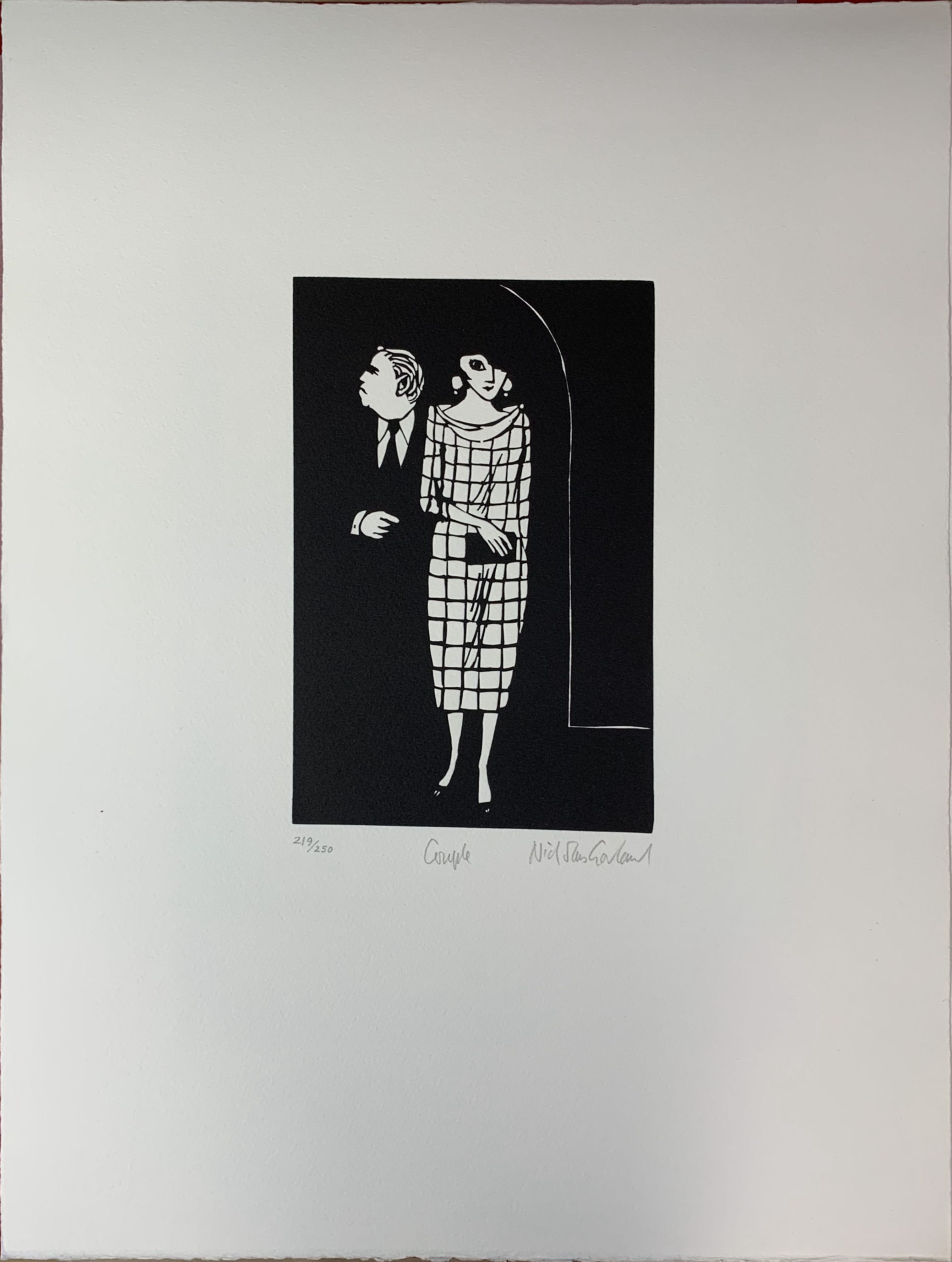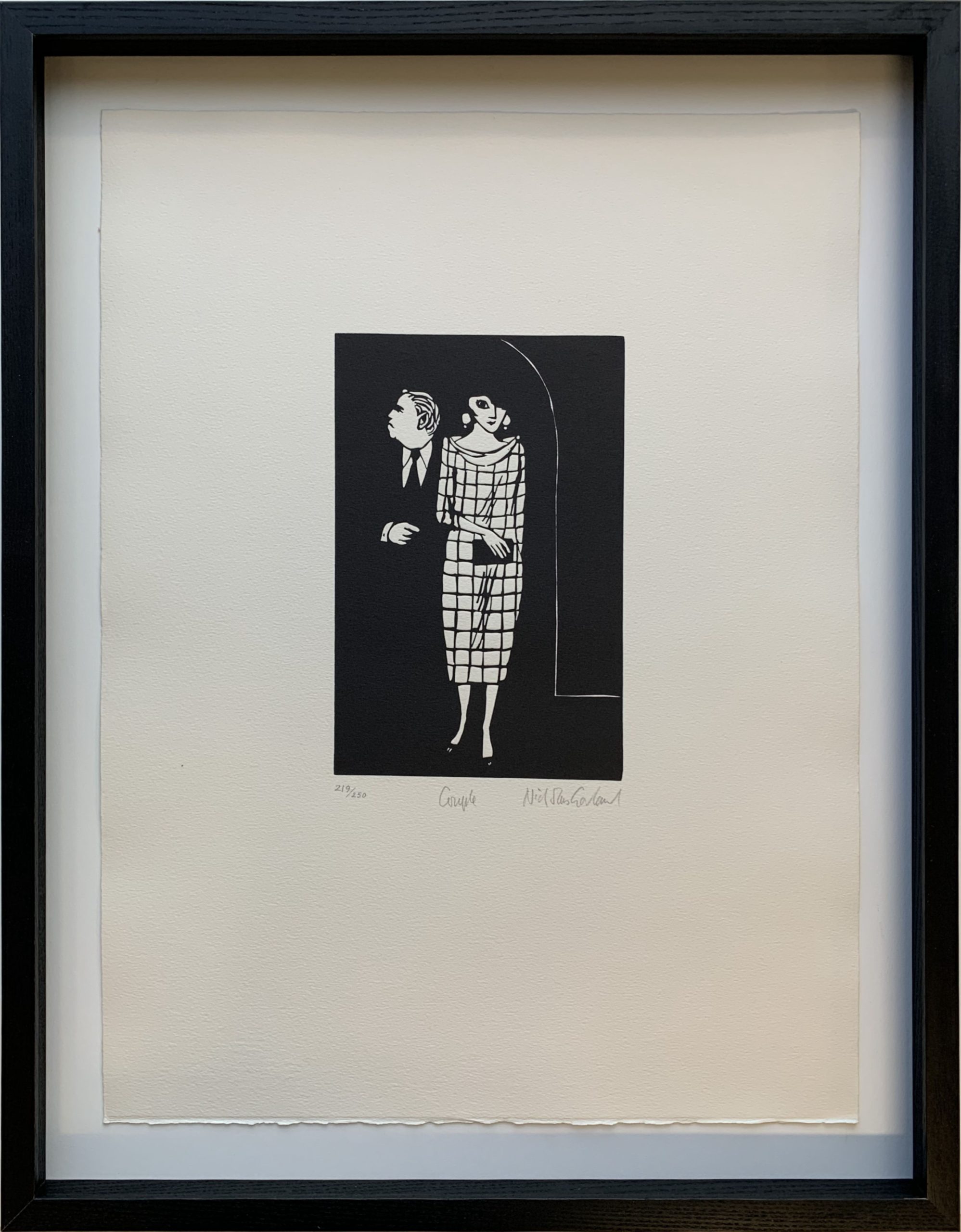 The 14 prints in the portfolio are all, every one of them, superb. As the artist Lucian Freud wrote in the Introduction, “These linocuts are of a high order: they are works of art.” Remarkably, despite the two-dimensionality of a linocut, these pictures have depth and richness in their content; the figures we see in these pictures are immediately recognizable (not as specific people but as characters and personalities).  The printing itself is only of the very highest quality, with luxurious inking on lovely paper.