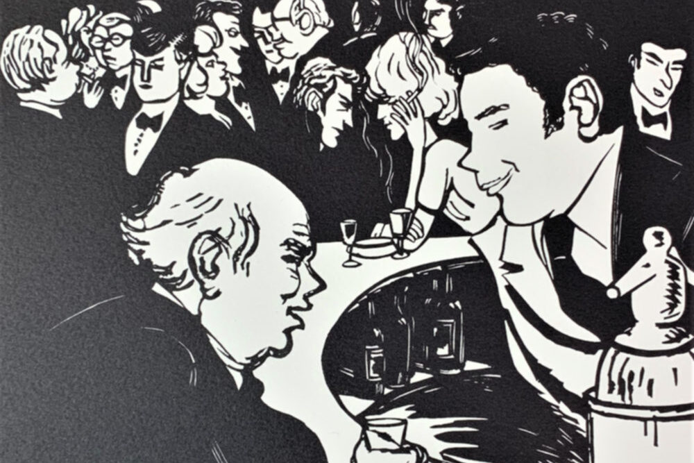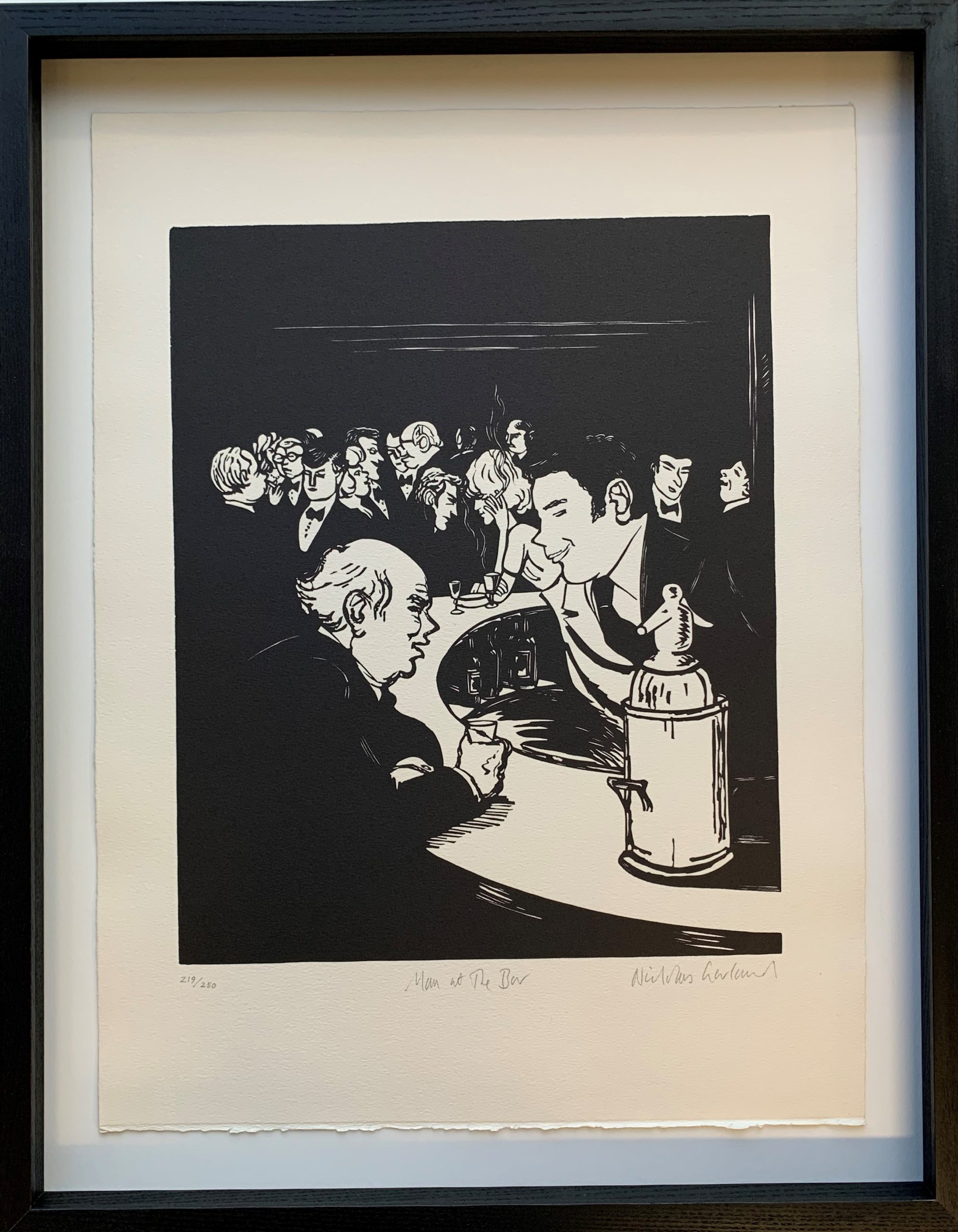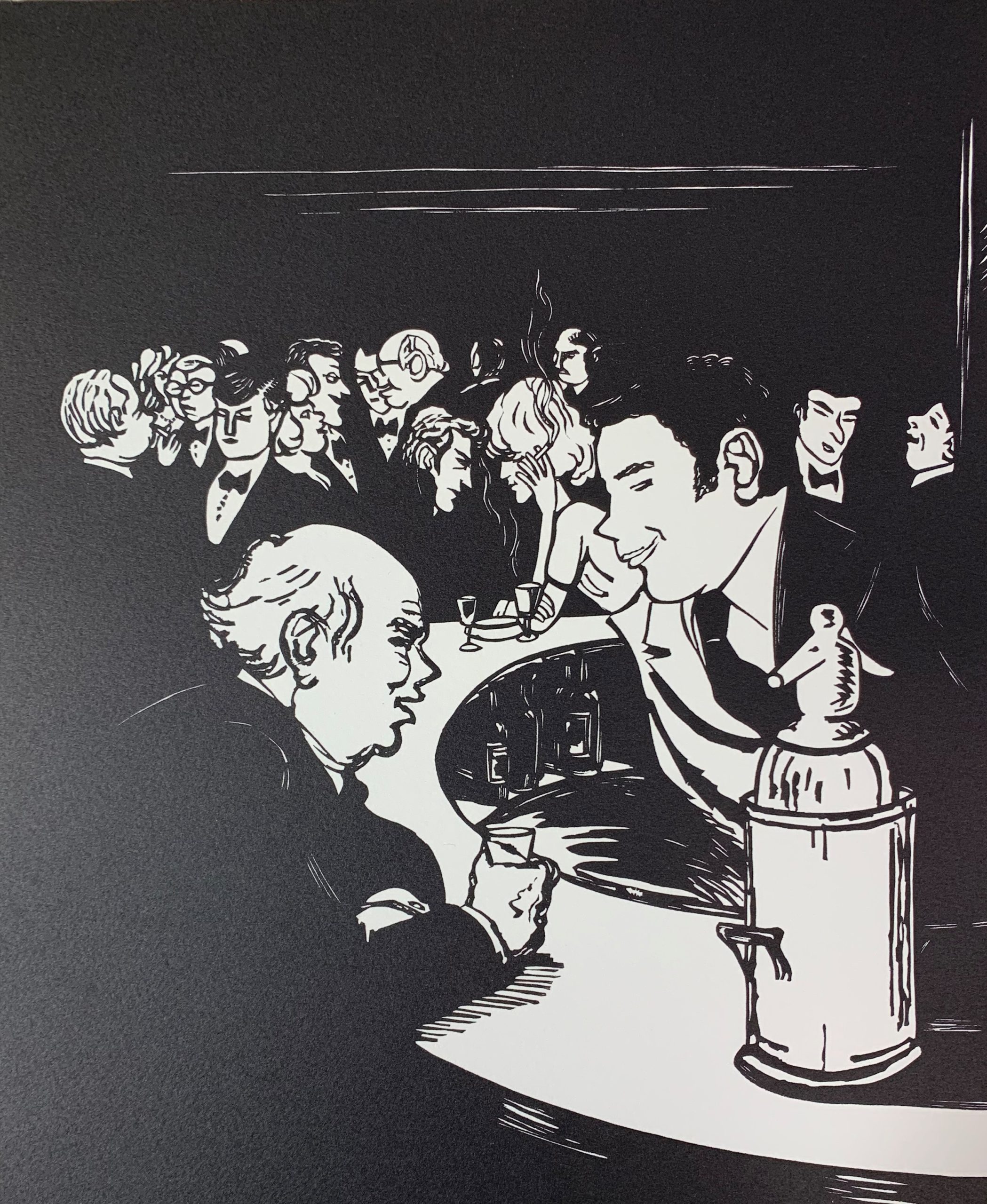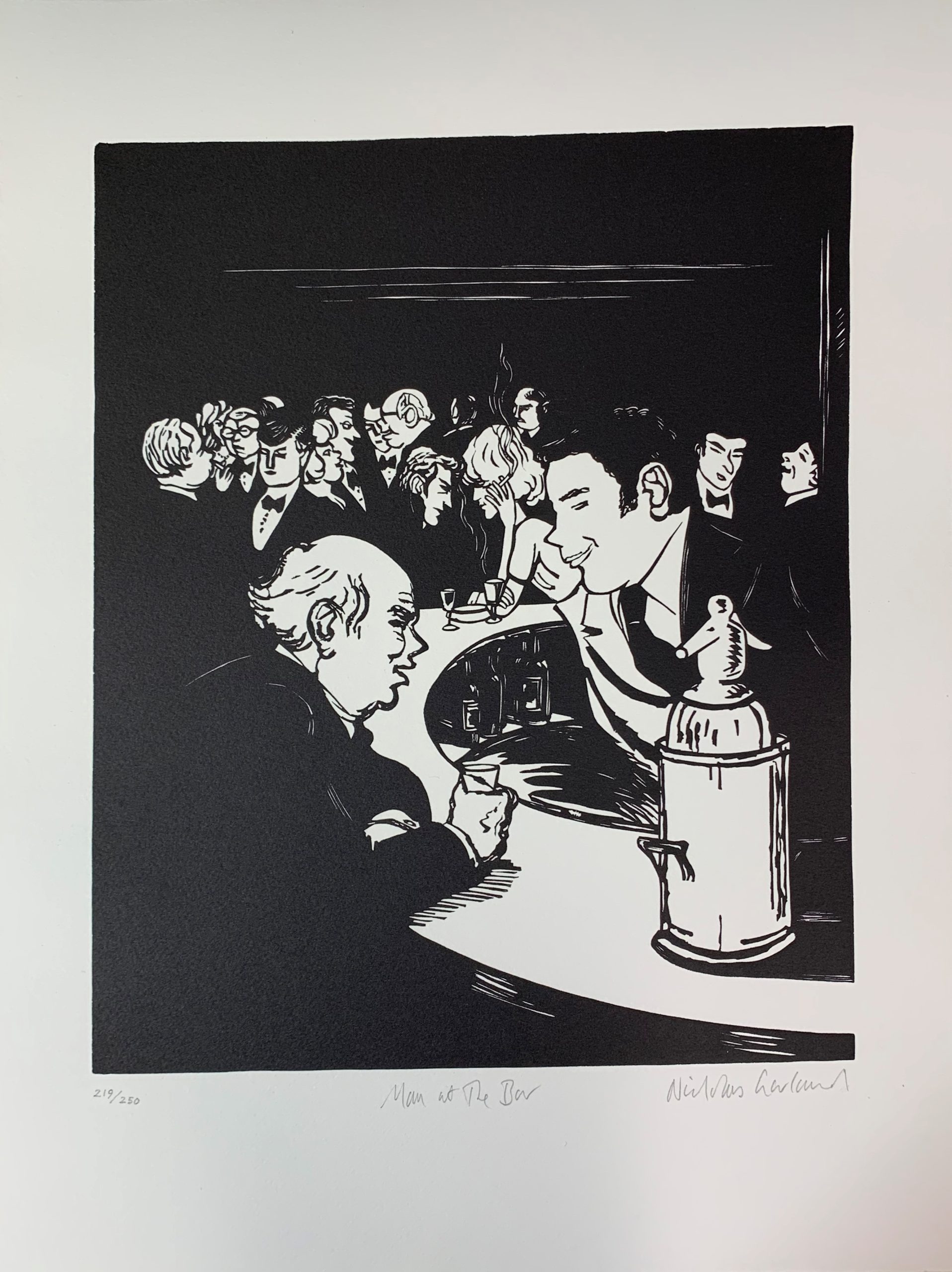 Anabel’s bar was widely considered to be the most elegant club in the London. This is a hyperbolic statement, but it is not hyperbole; it was actually thought of that way. The artist Nicholas Garland sat in the club and sketched the people he saw there. He later created the linocuts which were used to create the prints that formed the Anabel portfolio.