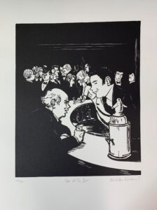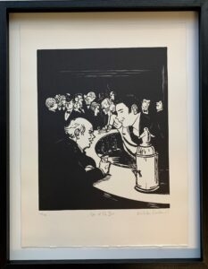 The 14 prints in the portfolio are all, every one of them, superb. As the artist Lucian Freud wrote in the Introduction, “These linocuts are of a high order: they are works of art.” Remarkably, despite the two-dimensionality of a linocut, these pictures have depth and richness in their content; the figures we see in these pictures are immediately recognizable (not as specific people but as characters and personalities). The printing itself is only of the very highest quality, with luxurious inking on lovely paper.