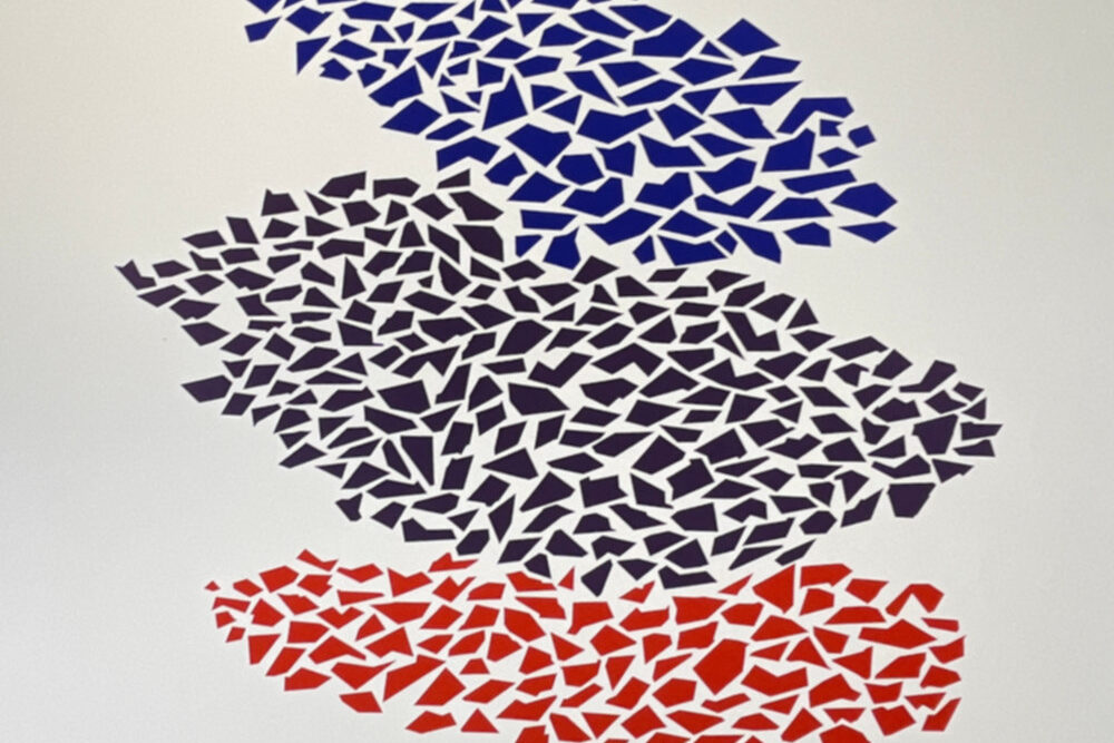 Robert Arthur Goodnough was a color field painter.  The earliest Color Field artists achieved a more pure abstraction by abandoning all suggestion of figuration—but even more, they sought to evoke the expression of color by deploying large fields of color that would envelope the viewer when seen at close quarters.  Goodnough, though, deployed color in a kinetic manner, fragmented and moving, evocative of Georges Bracques’ birds. His work used calligraphy, intense splashes of primary color, and repeated motion. This work is from his “One Two Three” portfolio.
