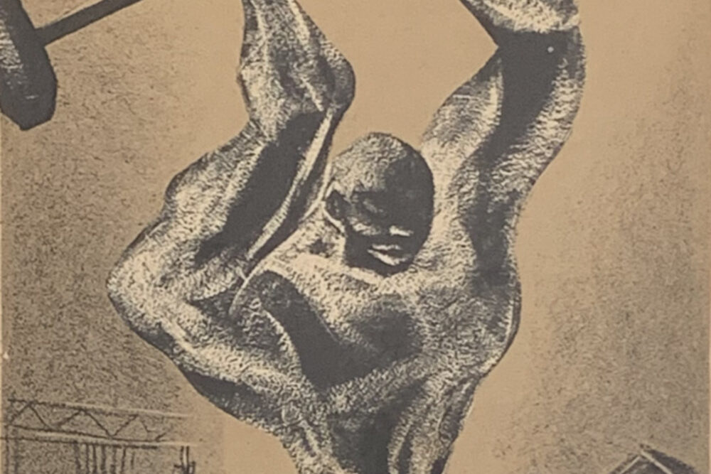 This is William Gropper’s portrayal of John Henry, the African-American folk hero. John Henry is said to have worked as a “steel-driving man”—a man tasked with hammering a steel drill into rock to make holes for explosives to blast the rock in constructing a railroad tunnel. According to legend, John Henry’s prowess as a steel-driver was measured in a race against a steam-powered rock drilling machine, a race that he won only to die in victory with hammer in hand as his heart gave out from stress.