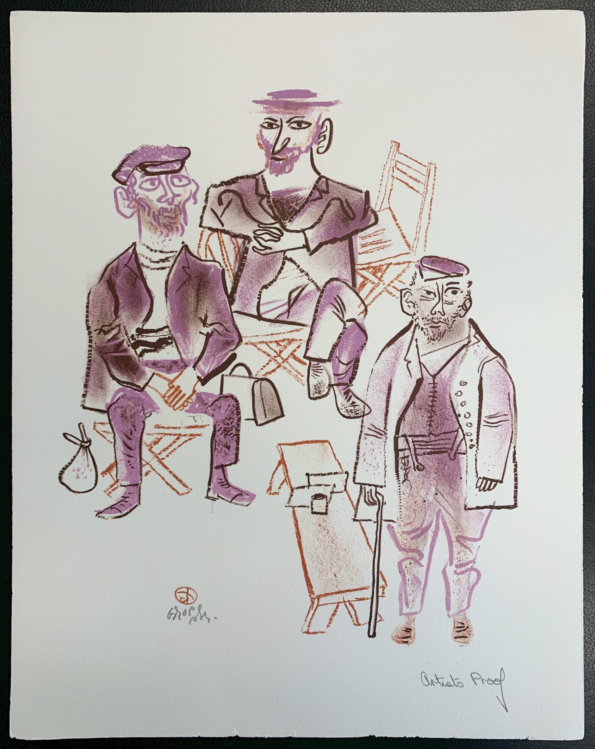 Harkening back to his Jewish roots, William Gropper published in 1970 a series of twenty-four color lithographs on Jewish village life called The Shtetl. Speaking of his work, Gropper wrote, “I react to life and it’s a stimulant to me. It could be a phase, it could be an attitude, it could be a mood. It’s broad. I’m open for any little thing, but I am of a period. I come from a sort of humanistic element. I love people and when I draw or paint, it comes out.”