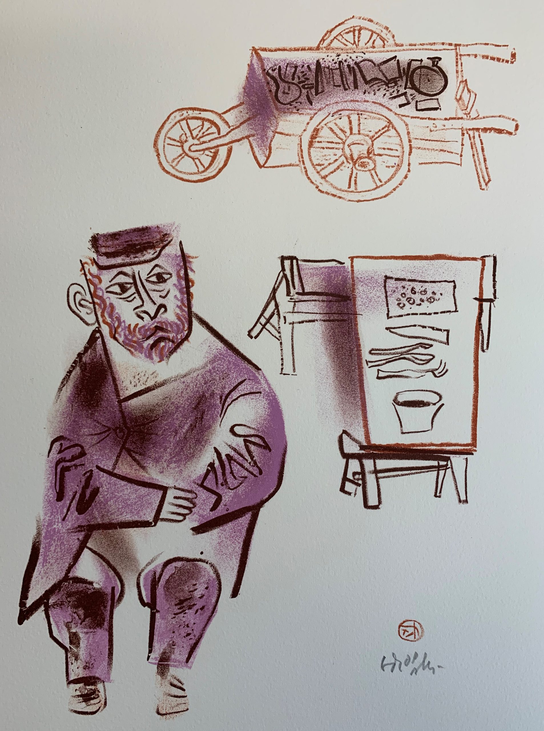 Harkening back to his Jewish roots, William Gropper published in 1970 a series of twenty-four color lithographs on Jewish village life called The Shtetl. Speaking of his work, Gropper wrote, “I react to life and it’s a stimulant to me. It could be a phase, it could be an attitude, it could be a mood. It’s broad. I’m open for any little thing, but I am of a period. I come from a sort of humanistic element. I love people and when I draw or paint, it comes out.”