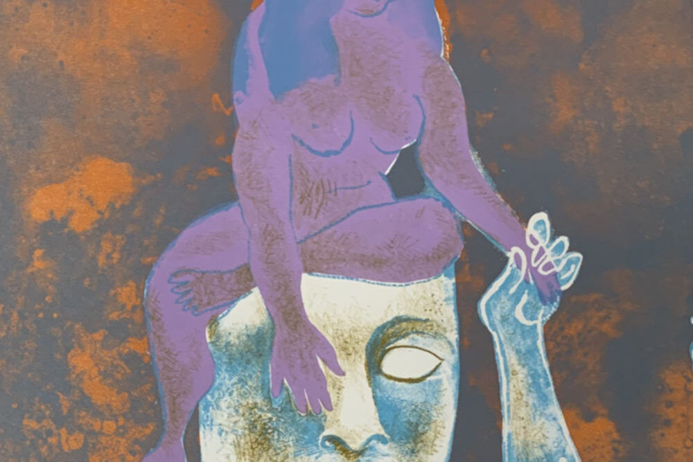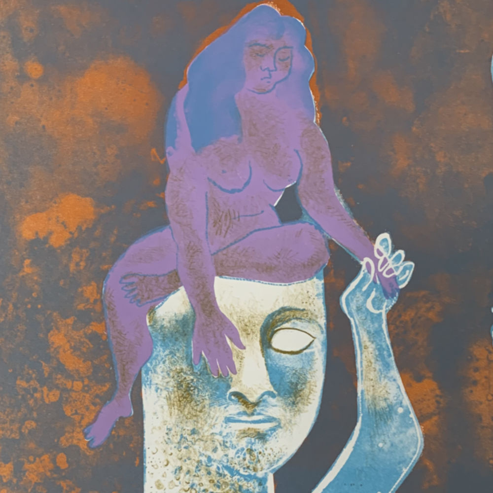 This lithograph was printed in a sequence of four colors (orange followed by violet then yellow-brown, and finally blue-green).