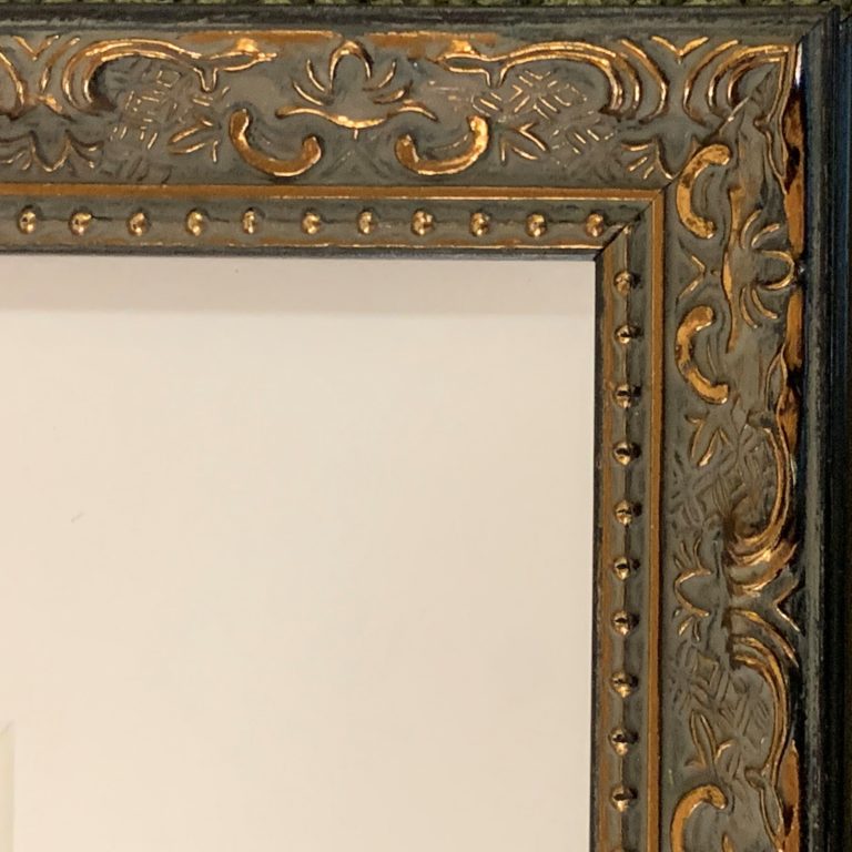 Custom framed in an ornamented wood frame with an eight-ply mat behind UV-filter glass. All conservation material.