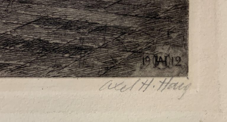 A work by Axel Herman Haig, a founder of the Royal Academy of Painters-Etchers and Engravers, at the height of his powers. Haig was particularly skilled at balancing the architecture—he worked as an architect before turning to engraving—with romance and drama. This work shows extraordinary deftness of hand with angle and light.