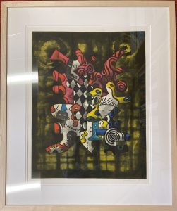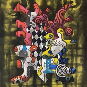 Intaglio print from a color etching and aquatint with hand coloring.