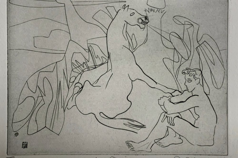 This work by Stanley William Hayter—undisputedly the most influential person in modern Western printmaking—is an Intaglio print made from engraving on a copper plate.