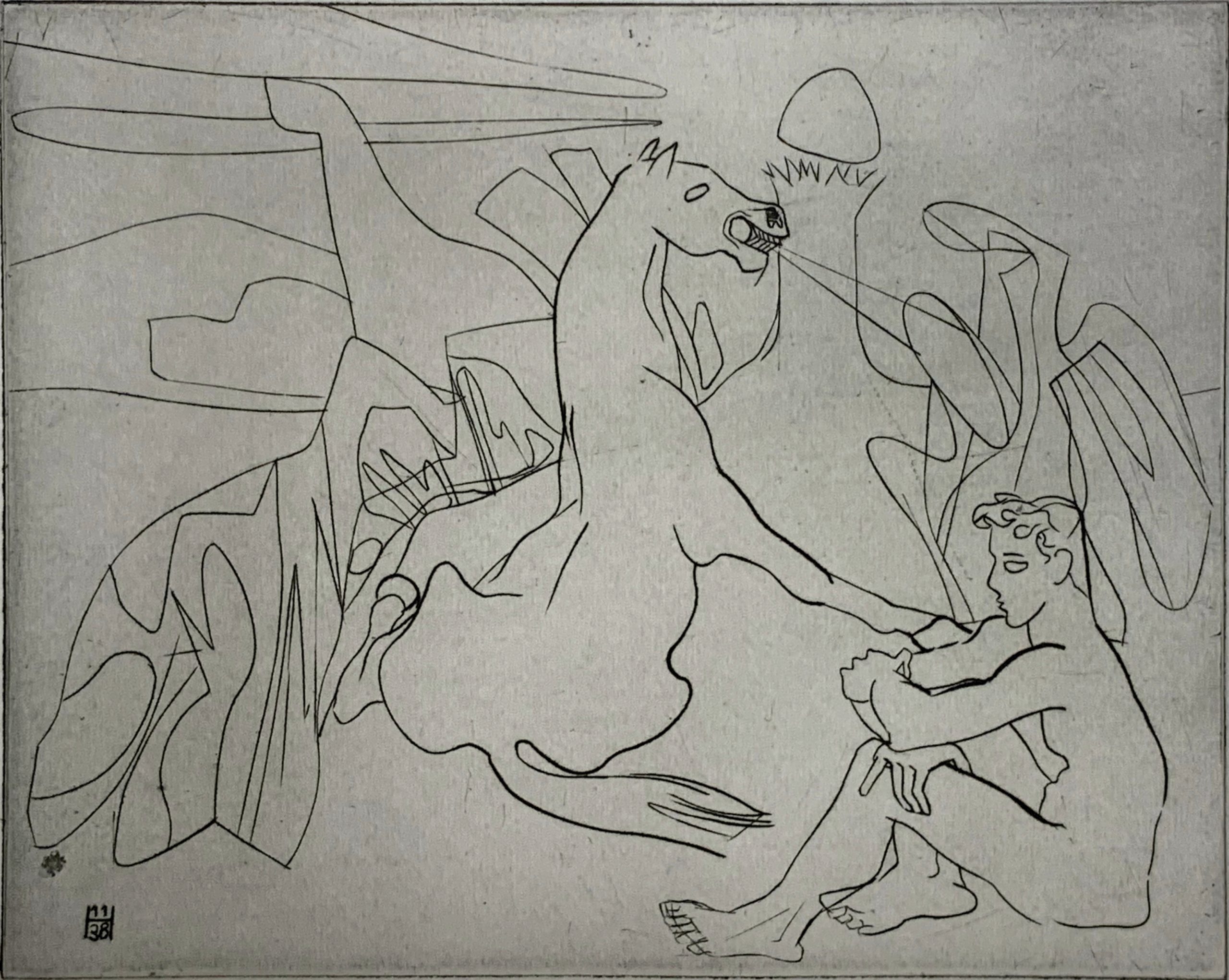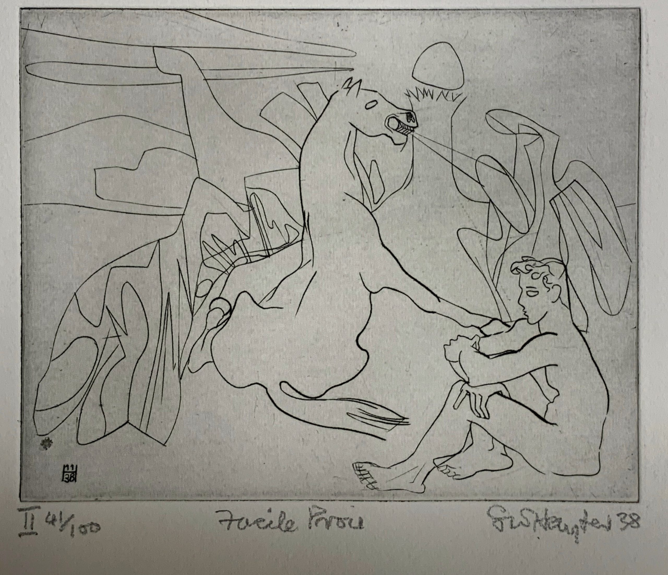 It appears that Hayter made eight separate plates of this work. One of the plates was used as the cover print for a portfolio of eight prints which accompanied Paul Eluard’s poem Facile Proie, which Eluard dedicated to Hayter, published by G[uy] L[evis] M[ano], Paris, 1939, one was contained in the portfolio, and the remaining six were printed only as five Artist’s Prints.