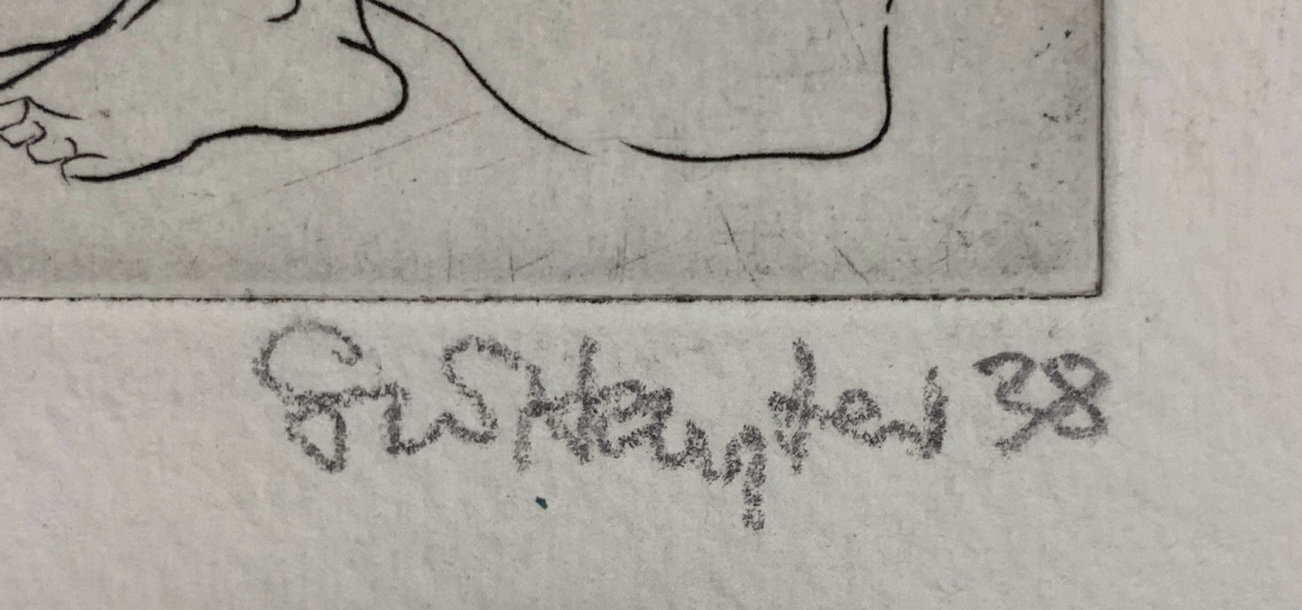In his 1947 list, Hayter noted that of the proposed edition of 100, only 50 sets had been printed and the plates destroyed. His catalogue raisonne presumes that that means that the plates were abandoned in Paris when Hayter fled the Nazis in 1939. Plainly, the plates were recovered, though, because one of them was used for the 1973 print. The plate was cancelled after the 1974 edition by engraving a signature which prints in reverse.