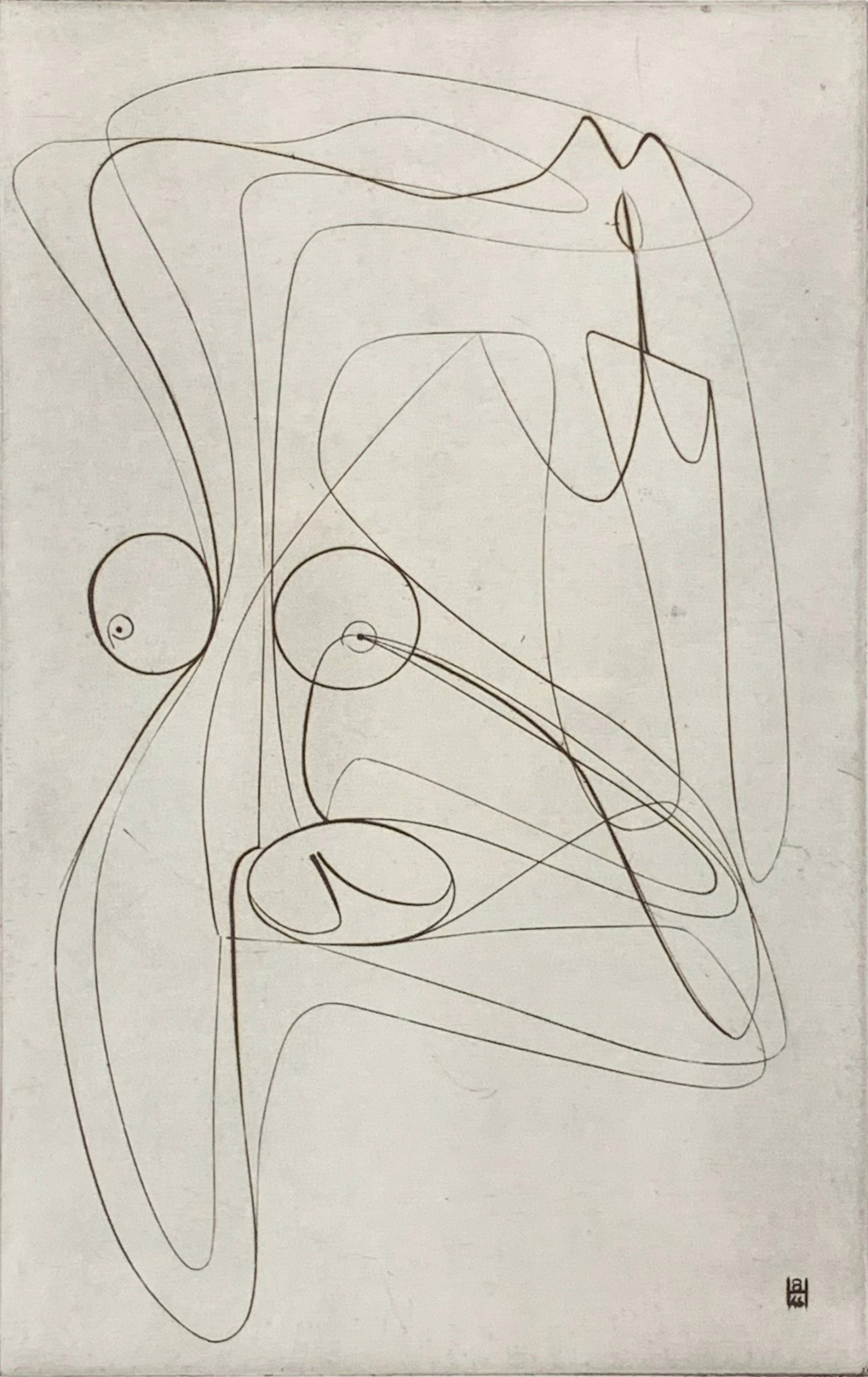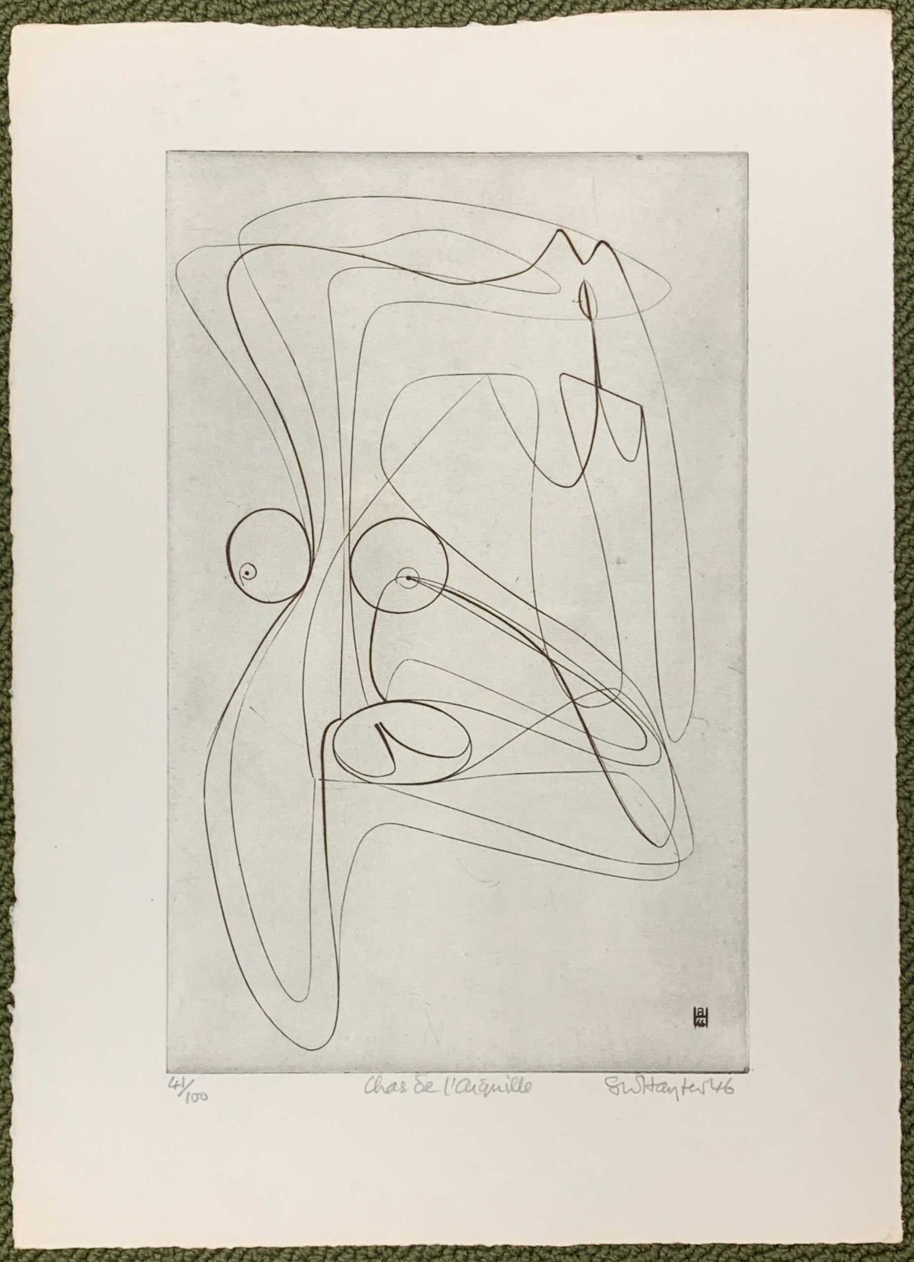 This impression was made in the summer of 1973 at Atelier 17 by Hayter, with assistance from Hector Saunier and Rigmor Poenaru, for the Nine Engravings portfolio published in 1974 by Association American Artists, New York. This engraving was previously printed in 1946 on various papers in an edition limited to 30 impressions. The plate was cancelled after the 1973 edition by engraving a signature which prints in reverse.