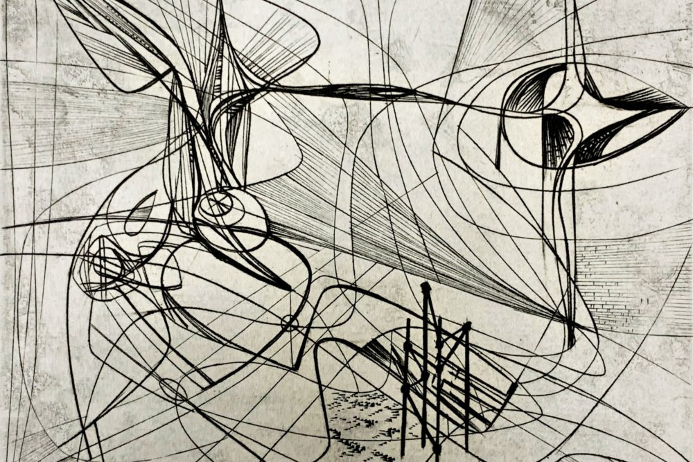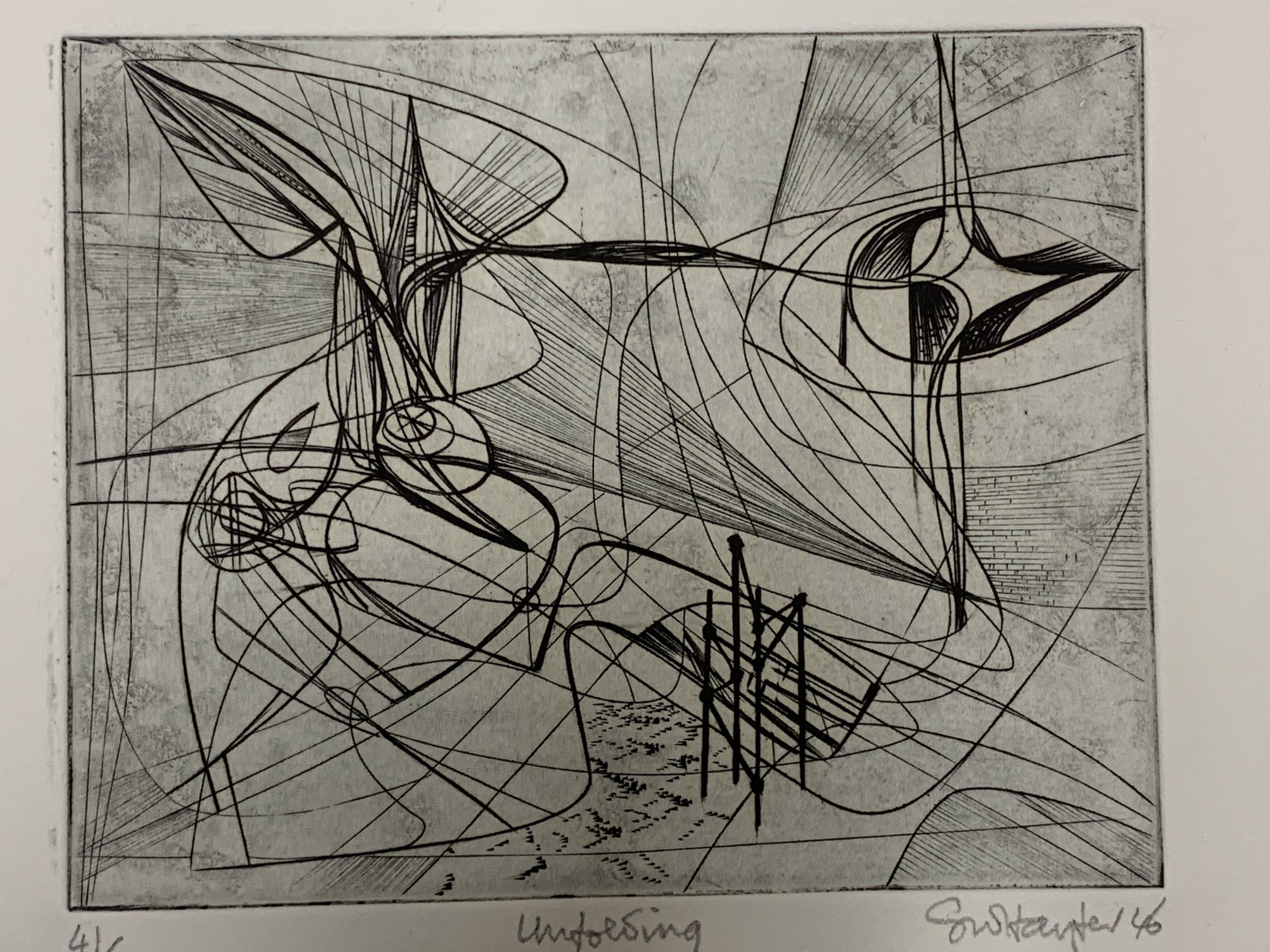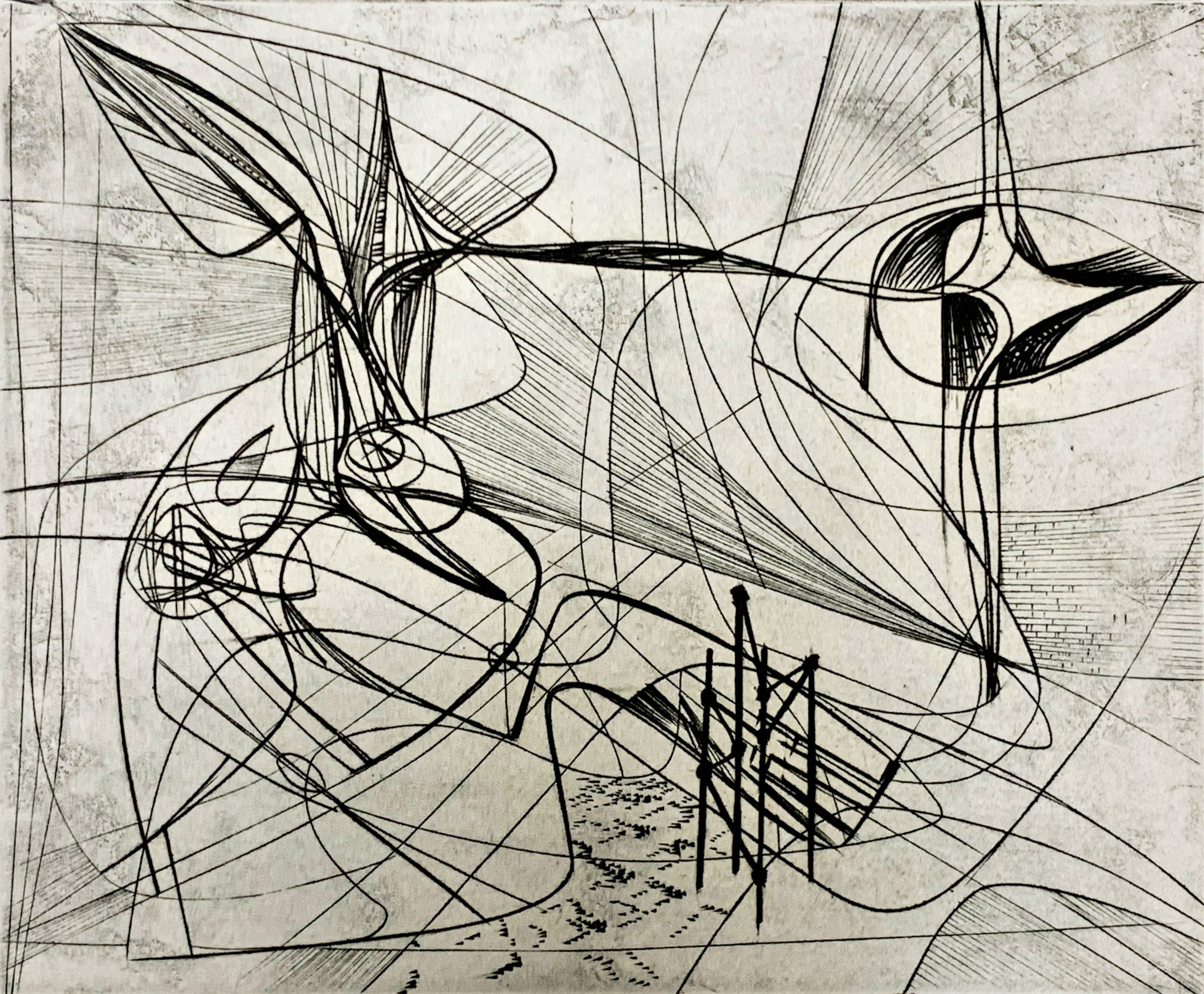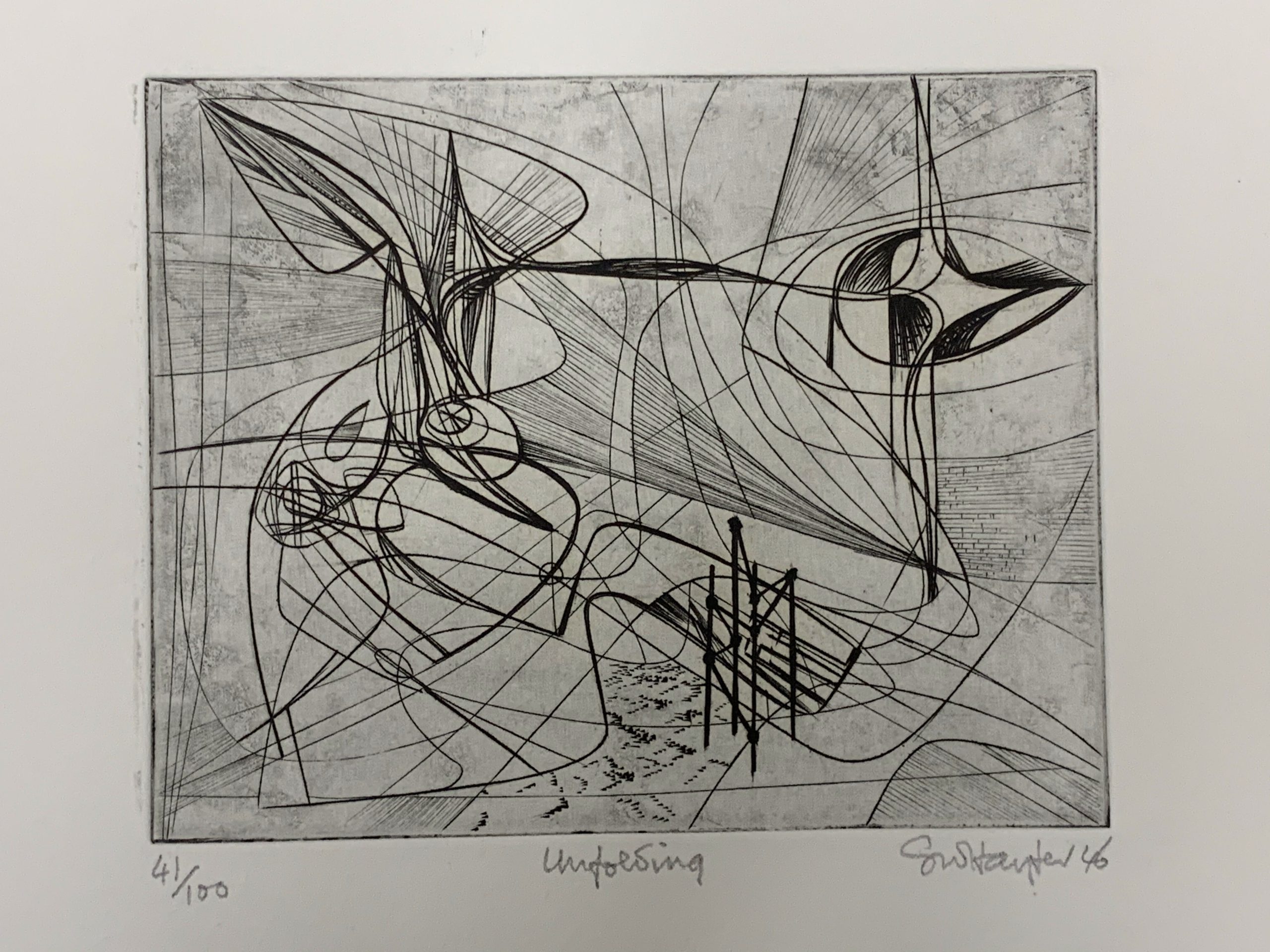 This work by Stanley William Hayter—undisputedly the most influential person in modern printmaking—is an Intaglio print made from engraving on a copper plate.  The plate was begun in October 1945 and completed in March 1946.