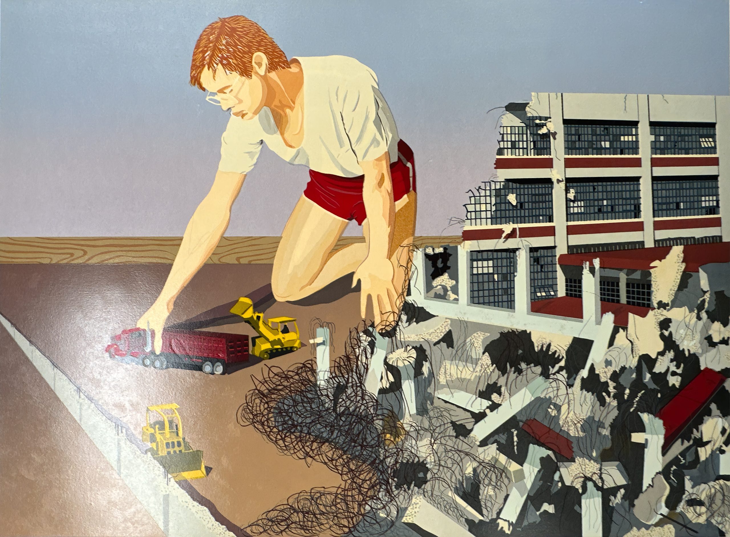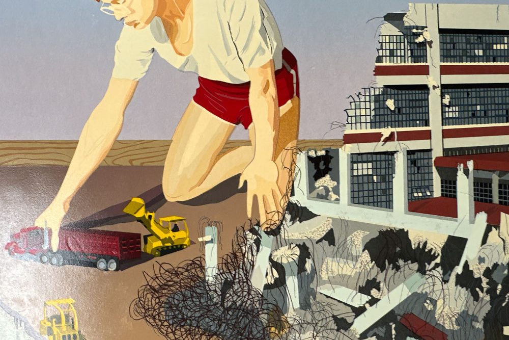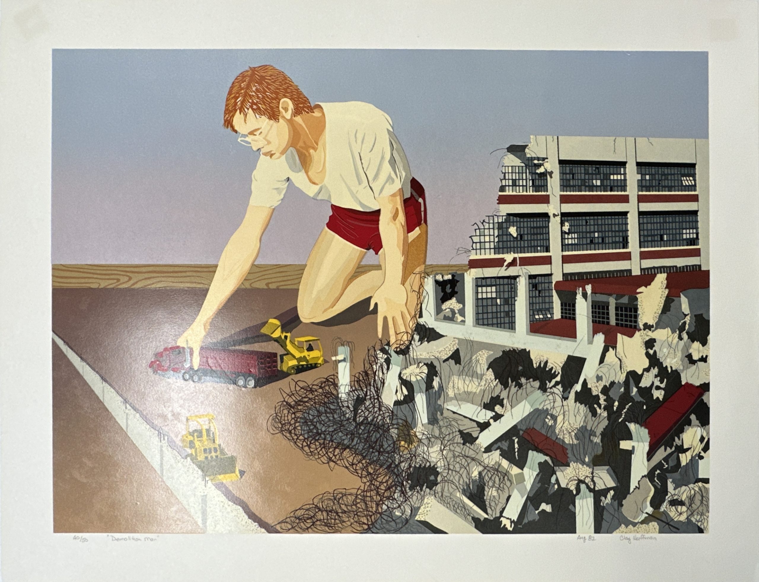 Shortly after Armistice Day, the U.S. Government built a new munitions factory on the banks of the Potomac in Alexandria, Virginia, steps from Washington, DC. The factory built munitions during World War II and was converted to storage after the war. In 1974 it was converted into an art center—called the Torpedo Factory—and became home to the largest number of publicly-accessible working artist studios in the U.S. In 1982 the building was completely gutted and renovated as part of the City’s redevelopment of the Potomac River waterfront. Clay Huffman—a long-time Torpedo Factory artist and beloved fixture in the DC-area arts community—portrays the building that was demolished to make way for a garage and condos and put himself in the picture, pretending to help along with demolition. With the heavy inking, glossiness, and luminosity of the silkscreen technique pioneered by mid-Century New York artist Clayton Pond.