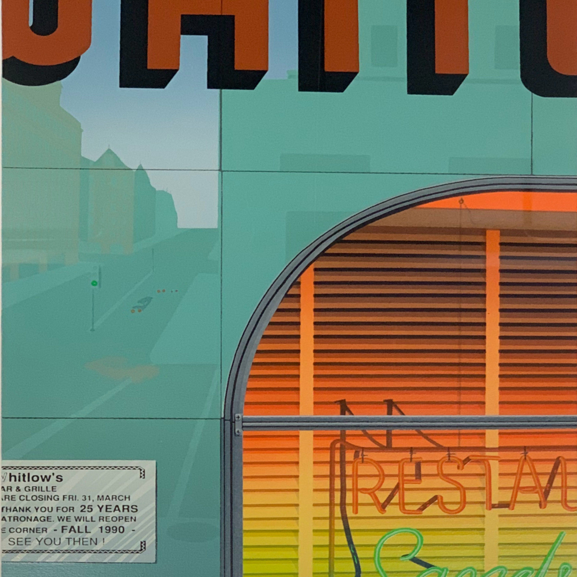 Clay Huffman nicknamed this work “Whitlow’s,” after the Arlington, Virginia, diner (which still operates today), when it announced that it would be closing to reopen in a new location. Huffman drew his inspirations on “those places we pass each day and take little notice of”. Prior to beginning any silkscreen project, Huffman would make several trips to the location to capture the essence and mood of the place from various perspectives and times of day, developing a personal relationship with the site; it is this subjective insight that Huffman so successfully translated and conveyed through his work.