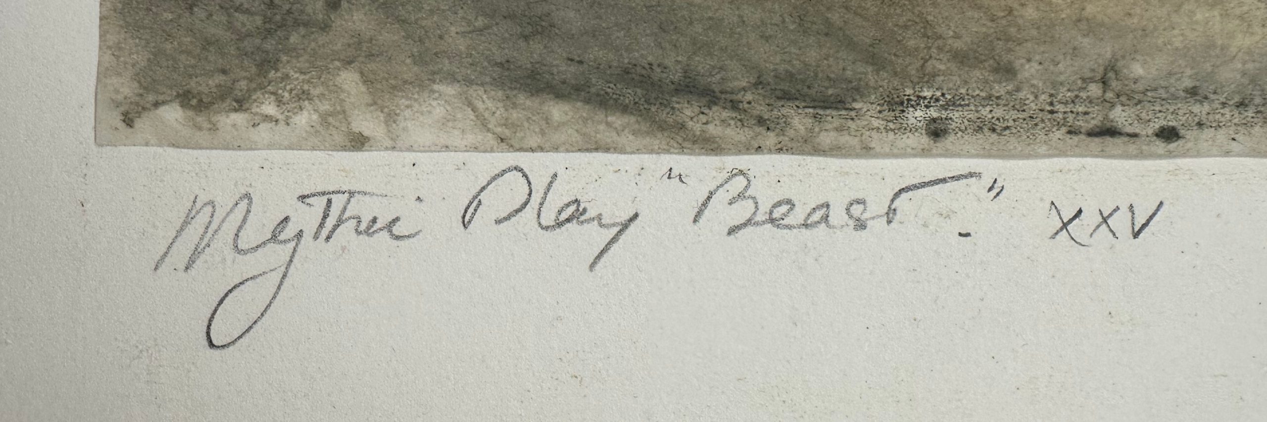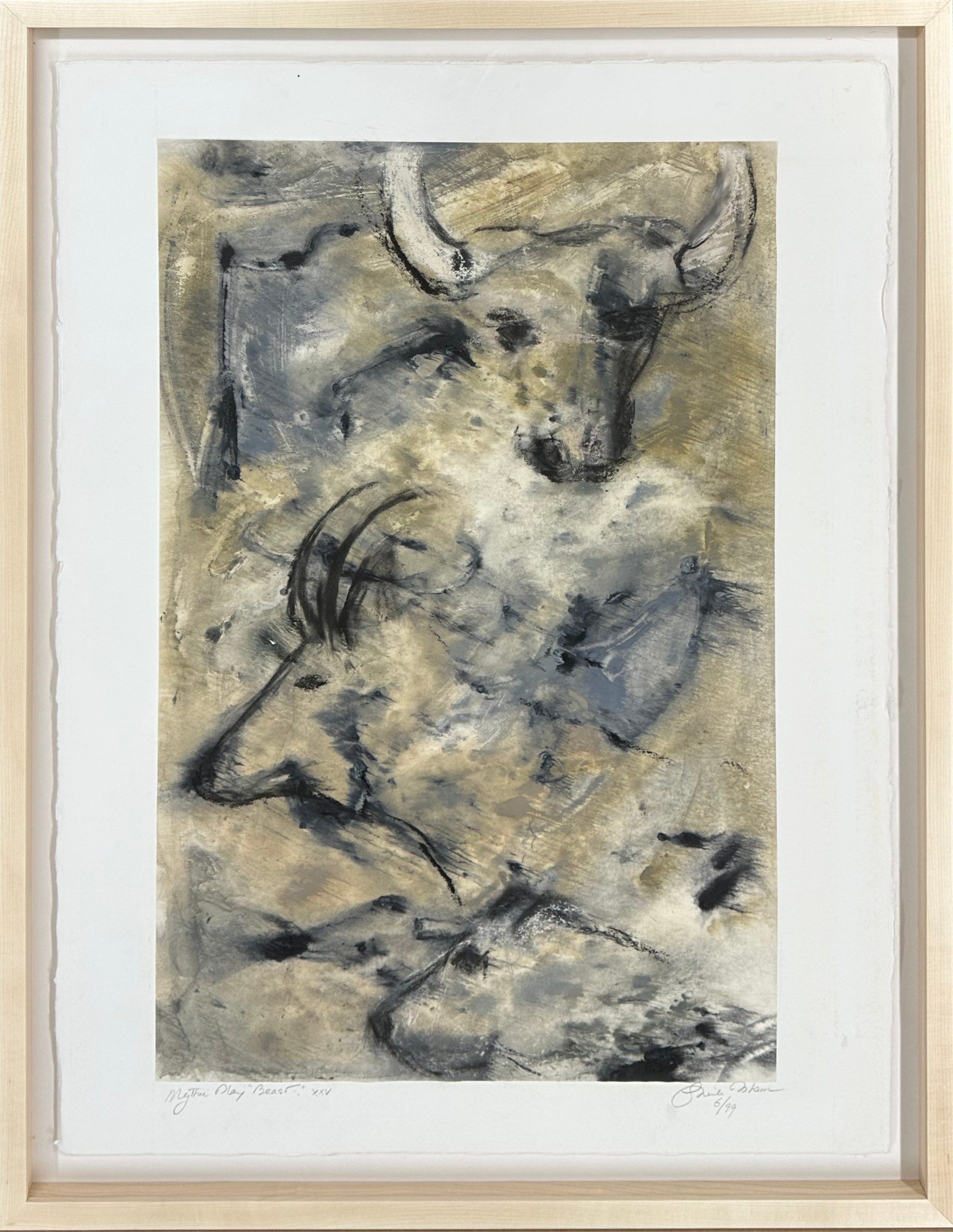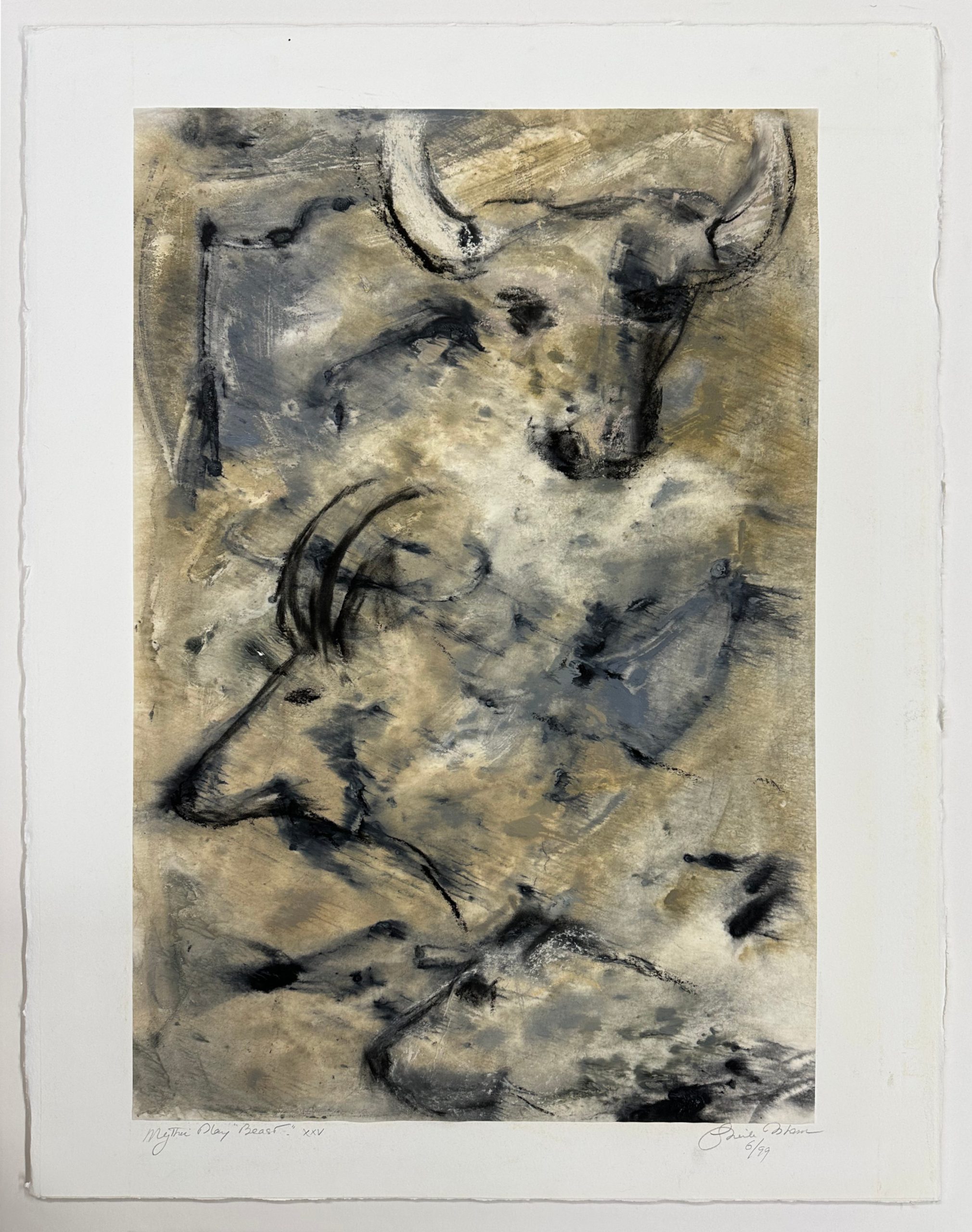 Mythic Play Beast XXV does not fit precisely into any of Isham’s series but straddles many of them, clearly evoking the “Cosmic Earth: Bulls” series and the “Cosmic Myth” series. (Perhaps that is why she apparently began the numbering of these works with XX.)