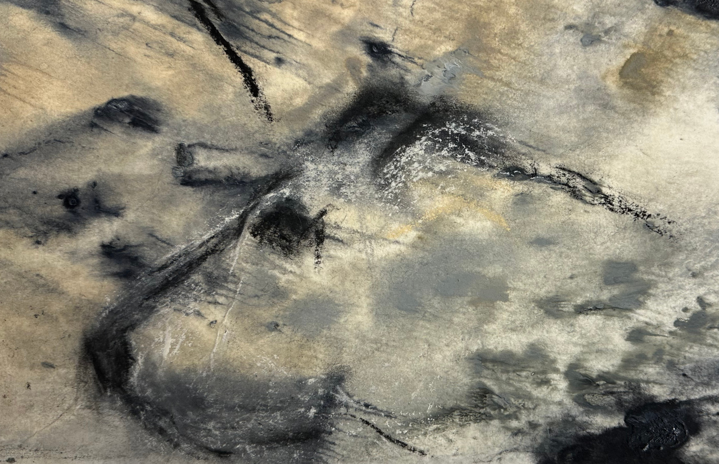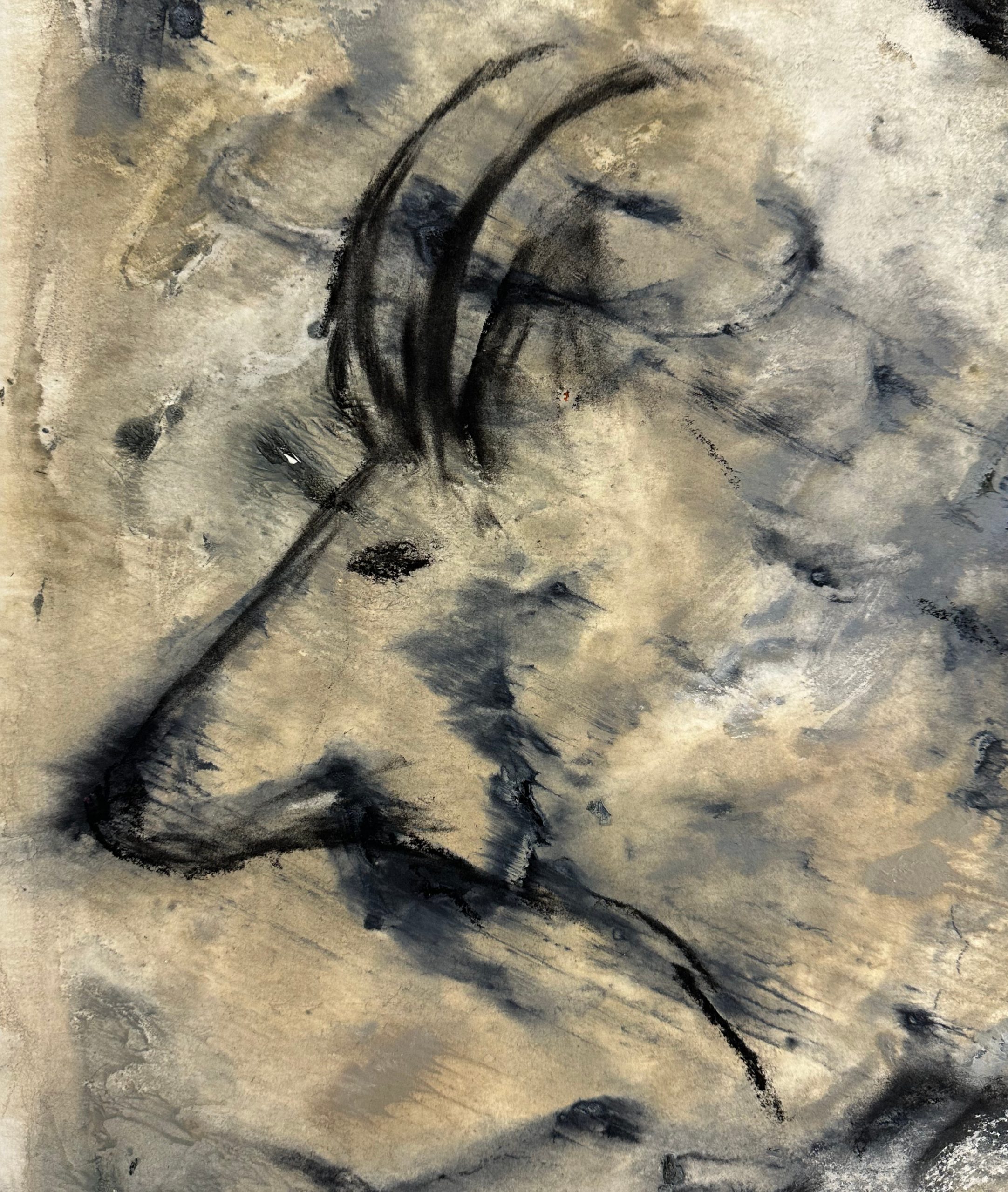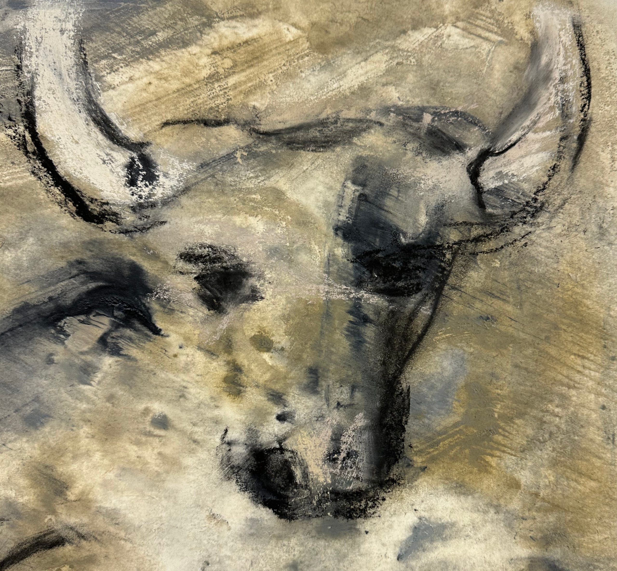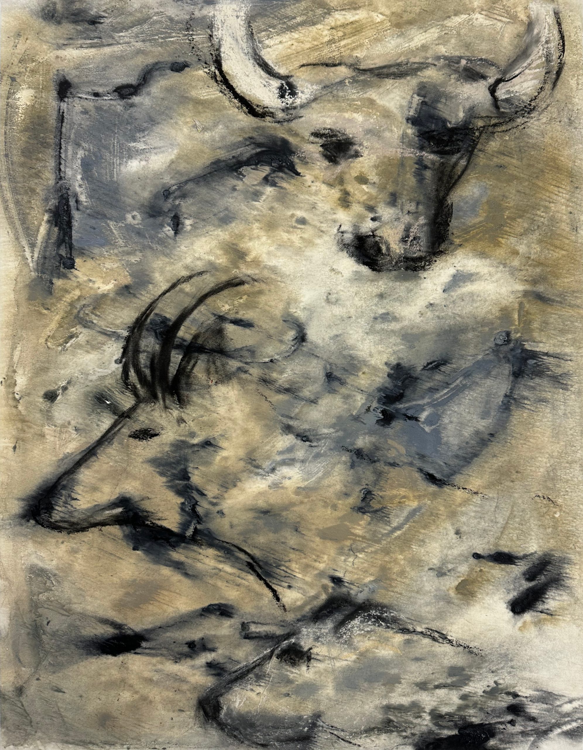 Mythic Play Beast XXV does not fit precisely into any of Isham’s series but straddles many of them, clearly evoking the “Cosmic Earth: Bulls” series and the “Cosmic Myth” series. (Perhaps that is why she apparently began the numbering of these works with XX.)