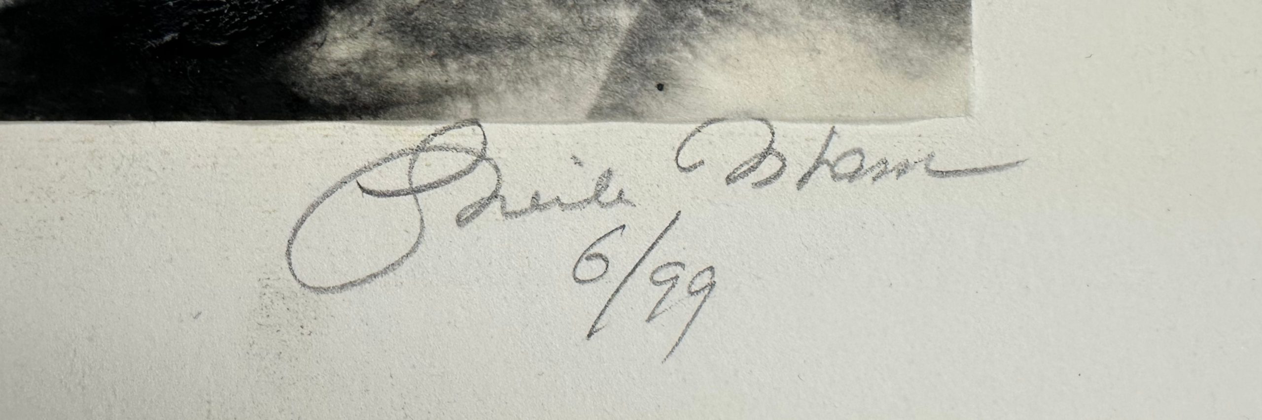 This work has been custom framed in a solid Maple frame behind 99% UV-blocking art glass (carefully held a half-inch over the work to avoid damage), using strictly conservation-grade techniques. Note, however, that the work has been left on its prior support despite some soiling to avoid damage.