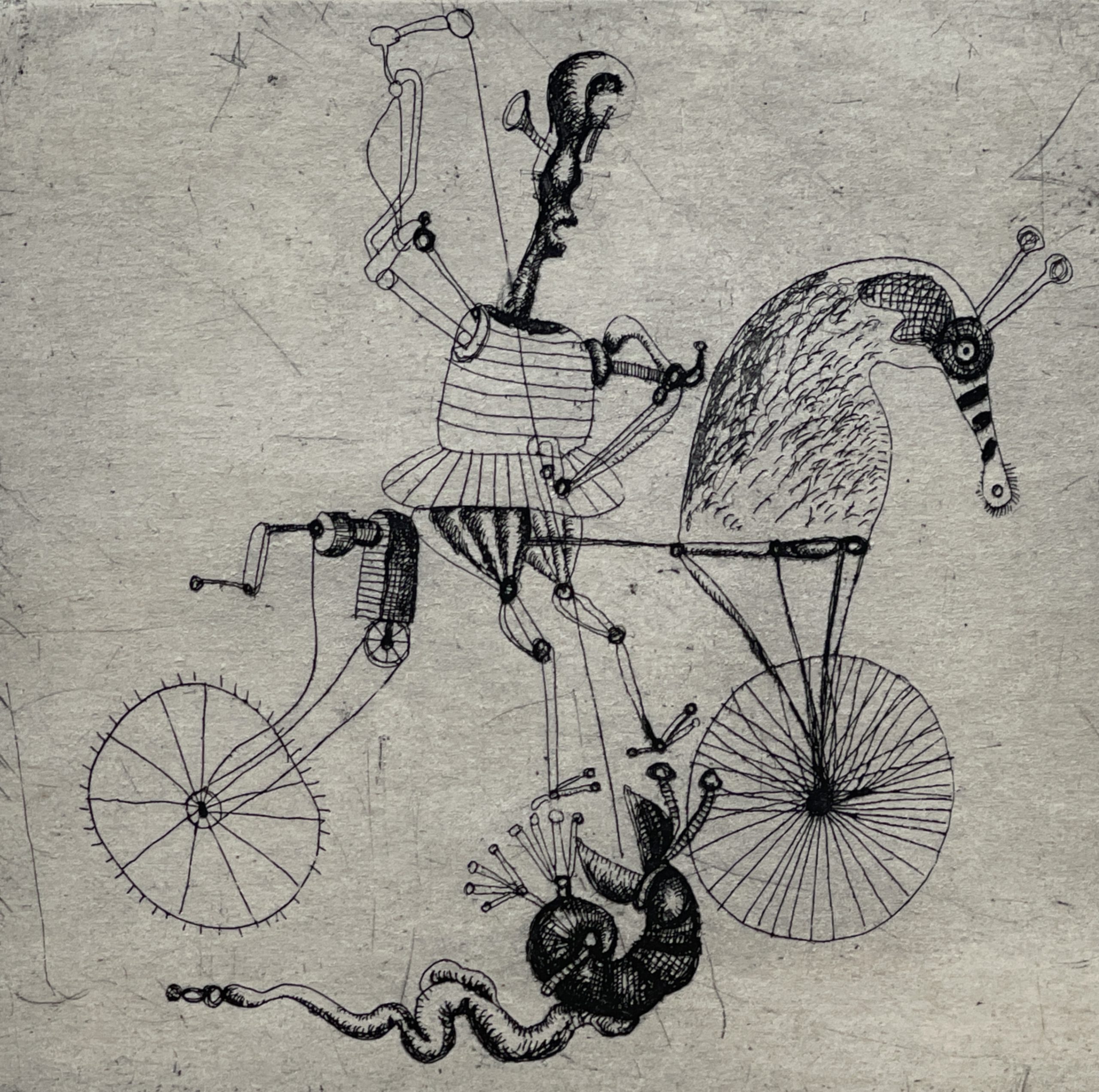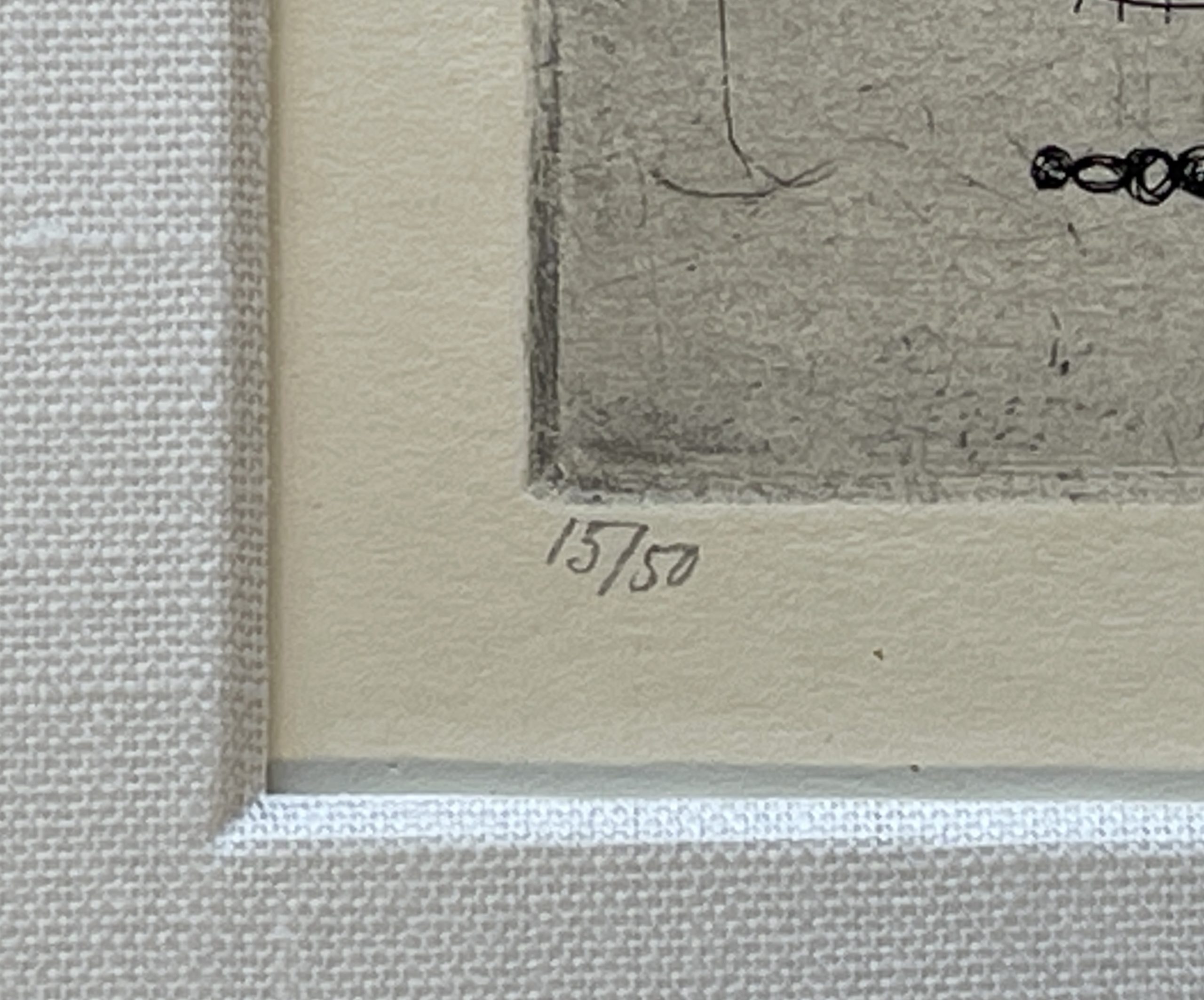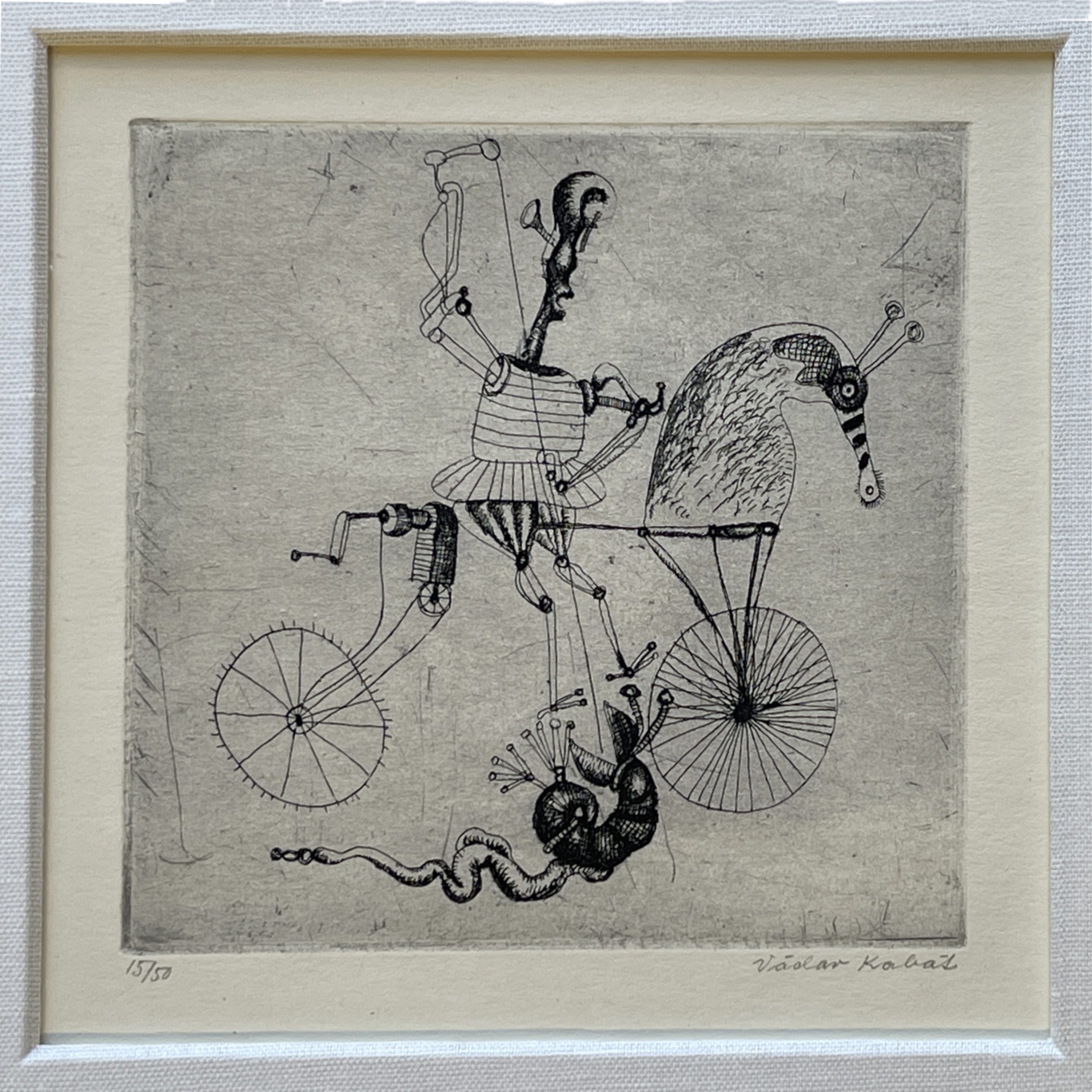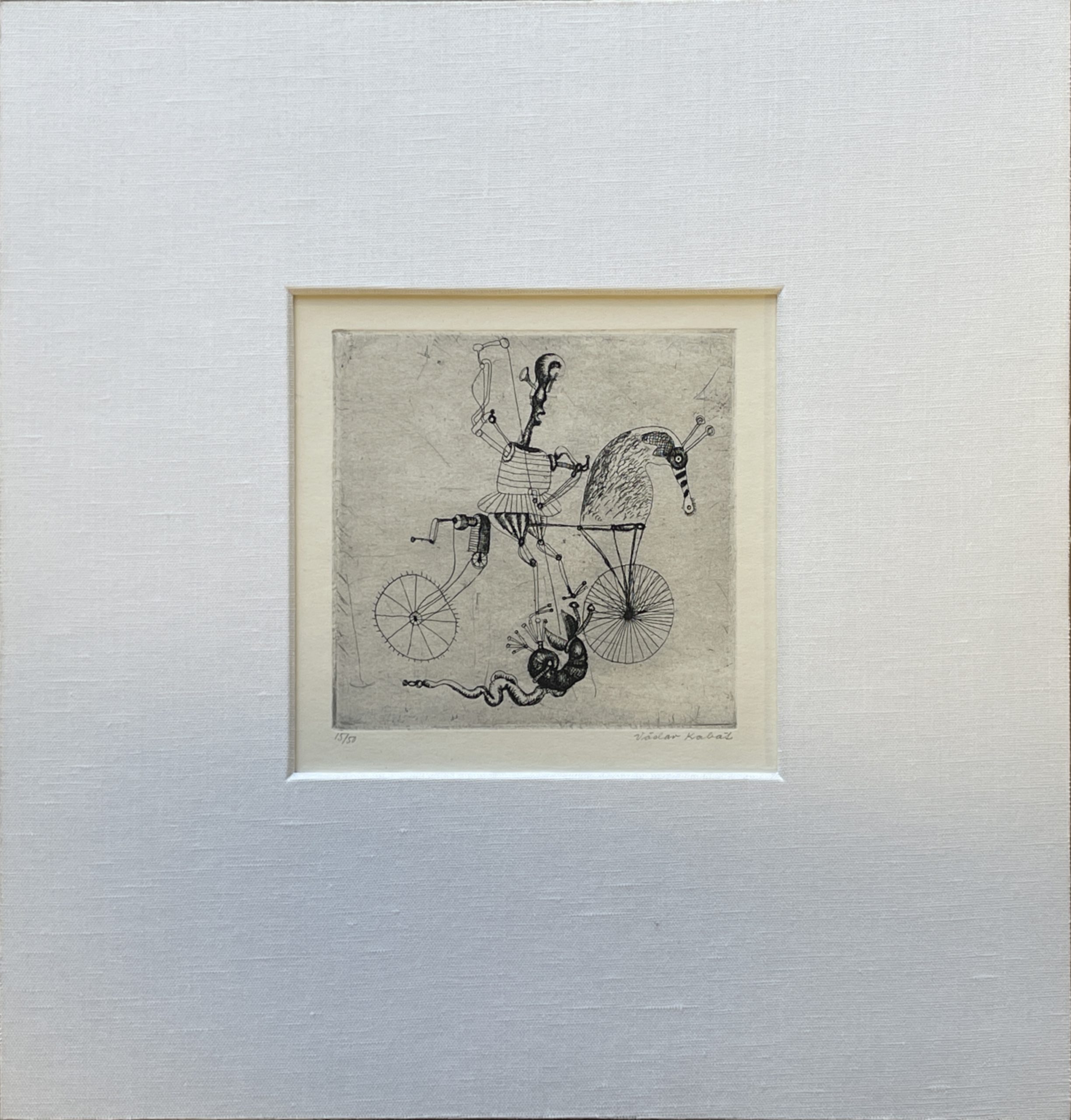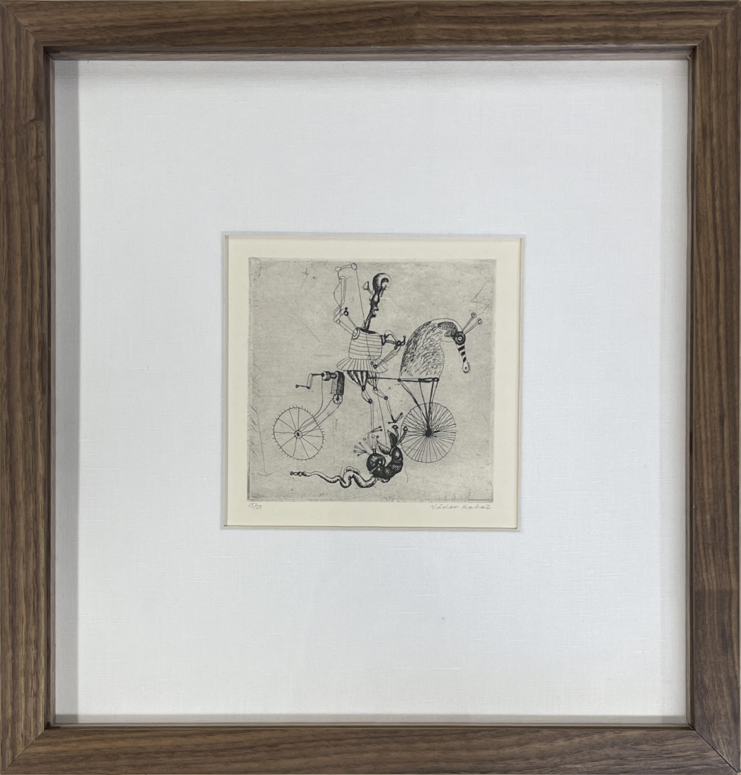 A humorous etching from Vaclav Kabat’s version of George and the Dragon, executed with Kabat’s skill and originality. Custom framed in solid walnut with a mat hand-wrapped in silk behind 99% UV-blocking non-reflective museum glass.